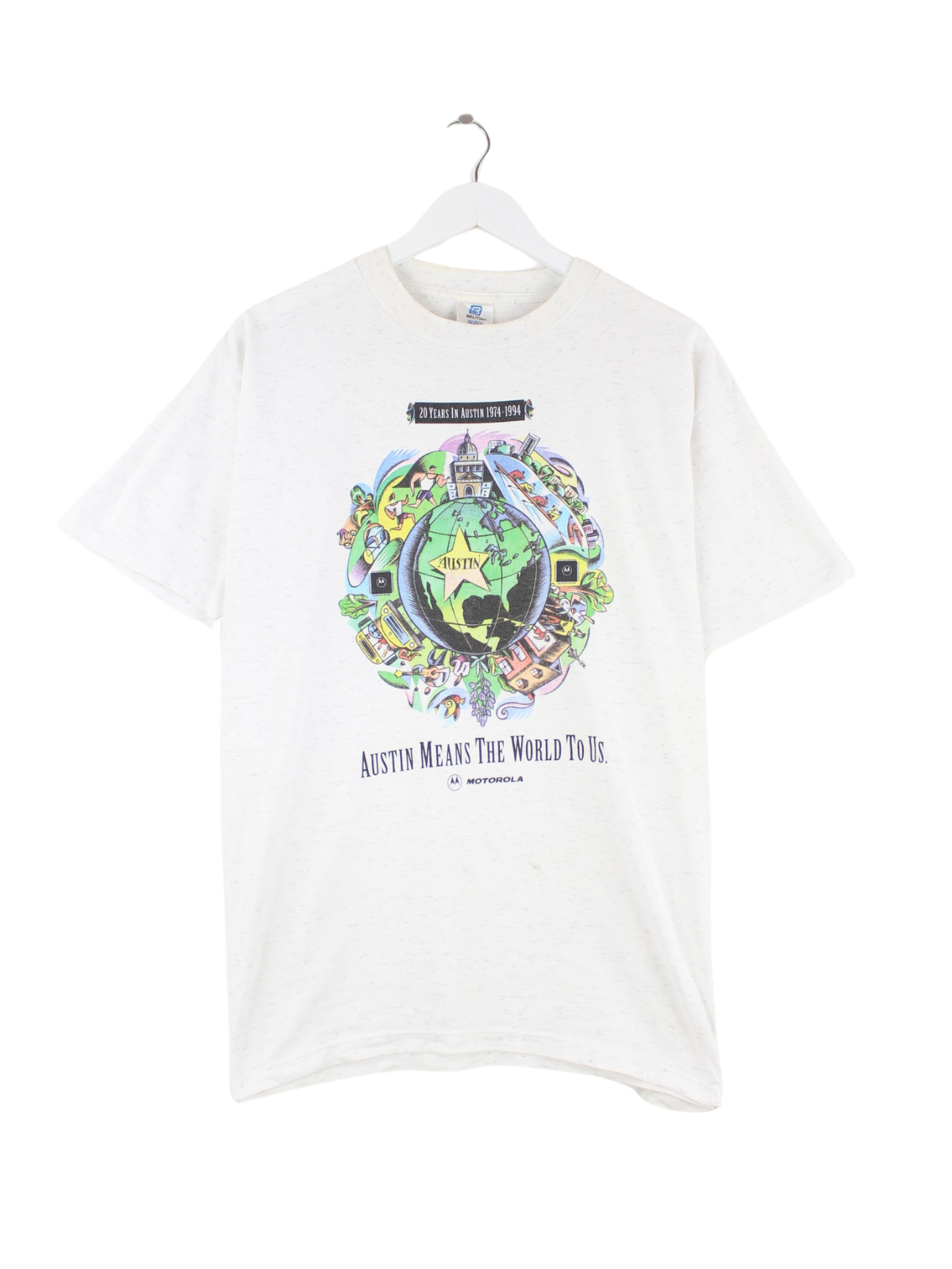 Vintage T-shirt in size L. It is made of cotton and available in beige. With rare Austin print.