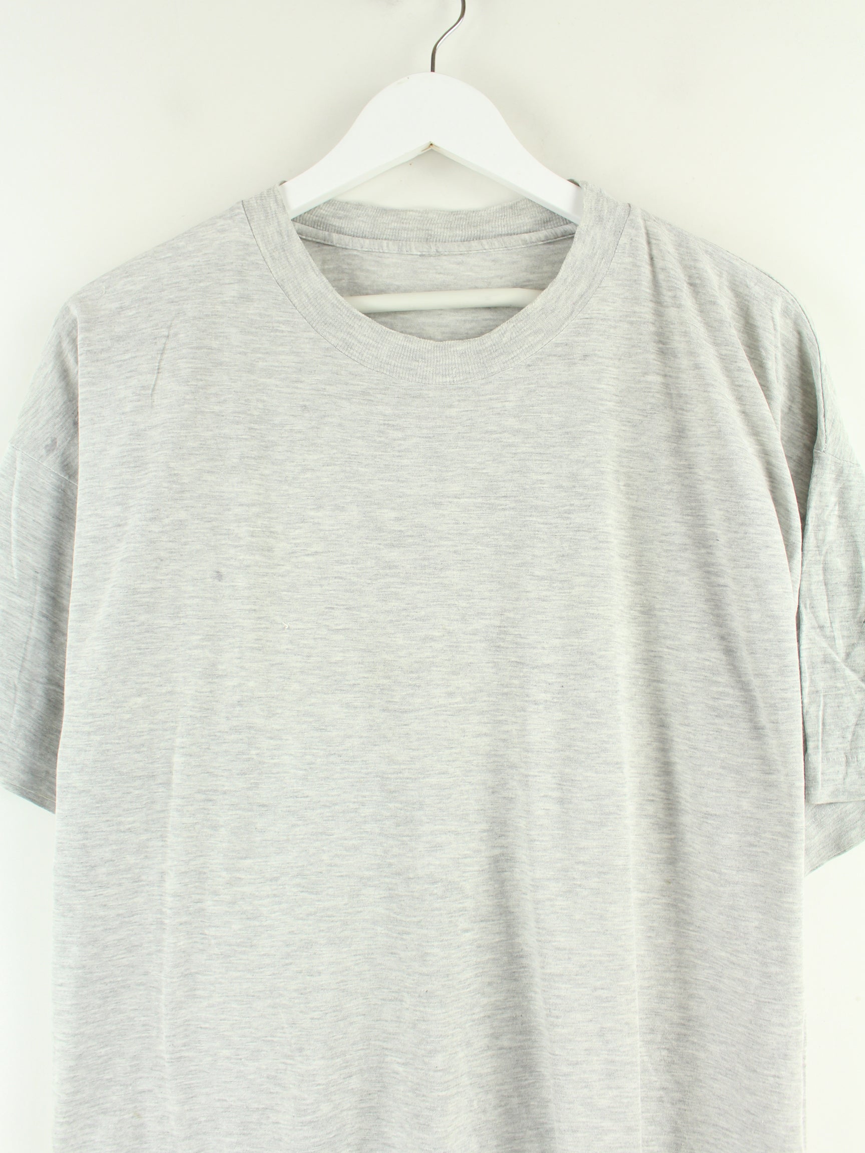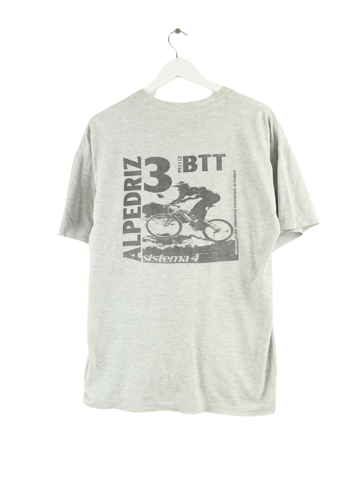 Grey vintage T-shirt in size L. It is made from a cotton blend and is available from us in good condition. With a rare cycling print.