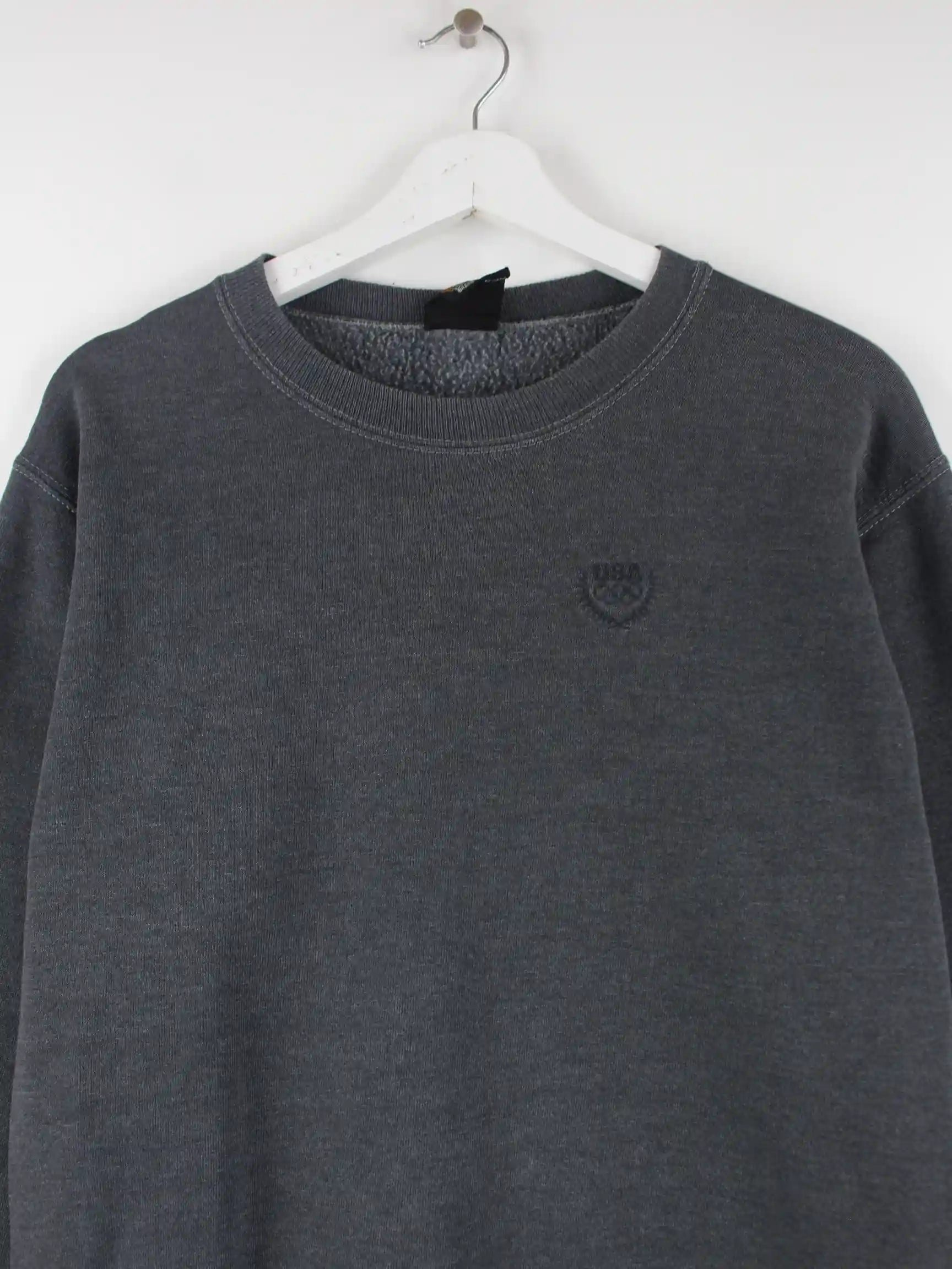 Grauer Vintage Sweater in Größe M. Er ist aus einer Baumwollmischung hergestellt und in sehr gutem Zustand vorrätig.