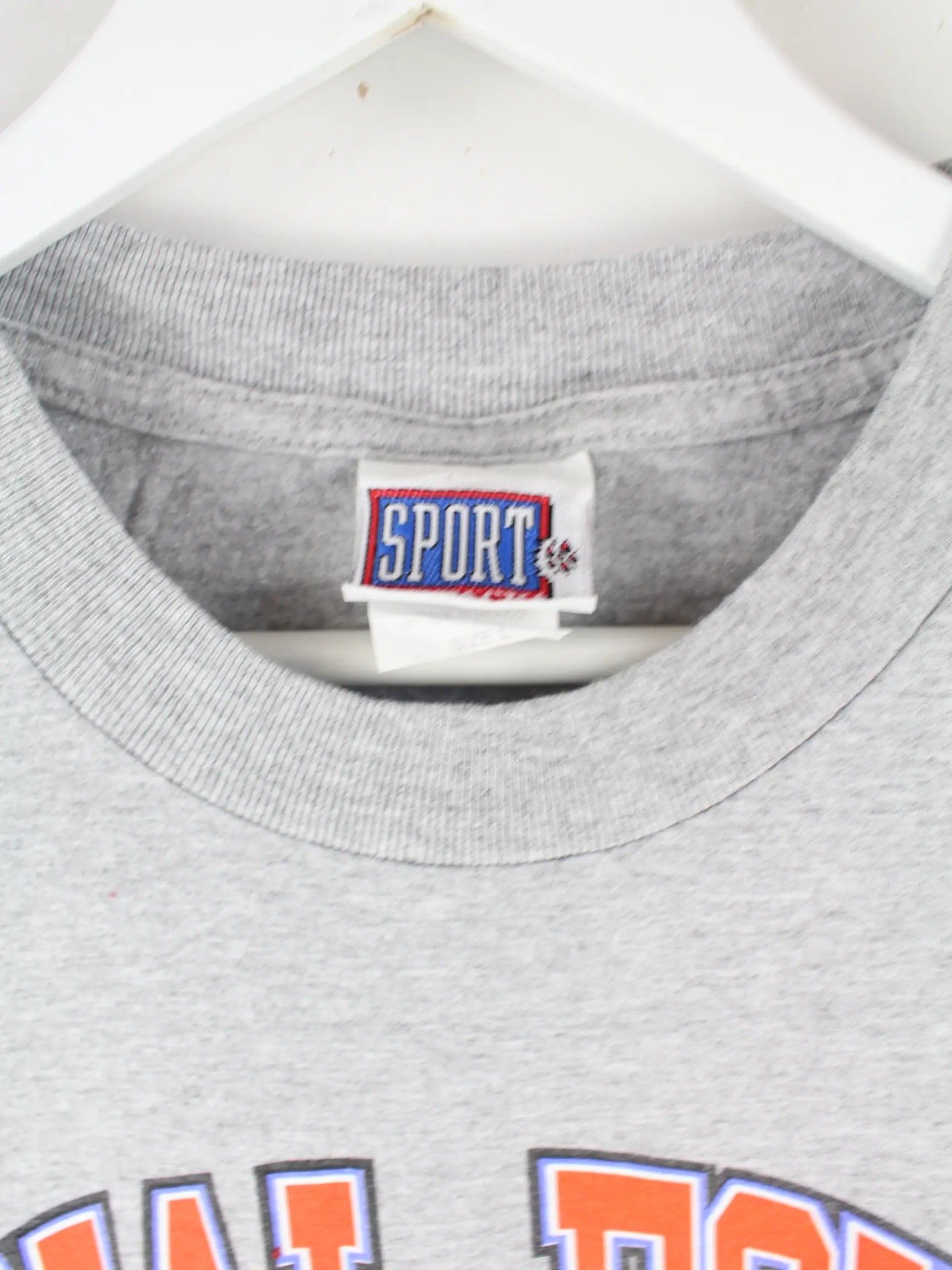Vintage T-Shirt in Größe L. Es ist aus einer Baumwollmischung produziert und in Grau zu bekommen. Mit schickem Four Print.