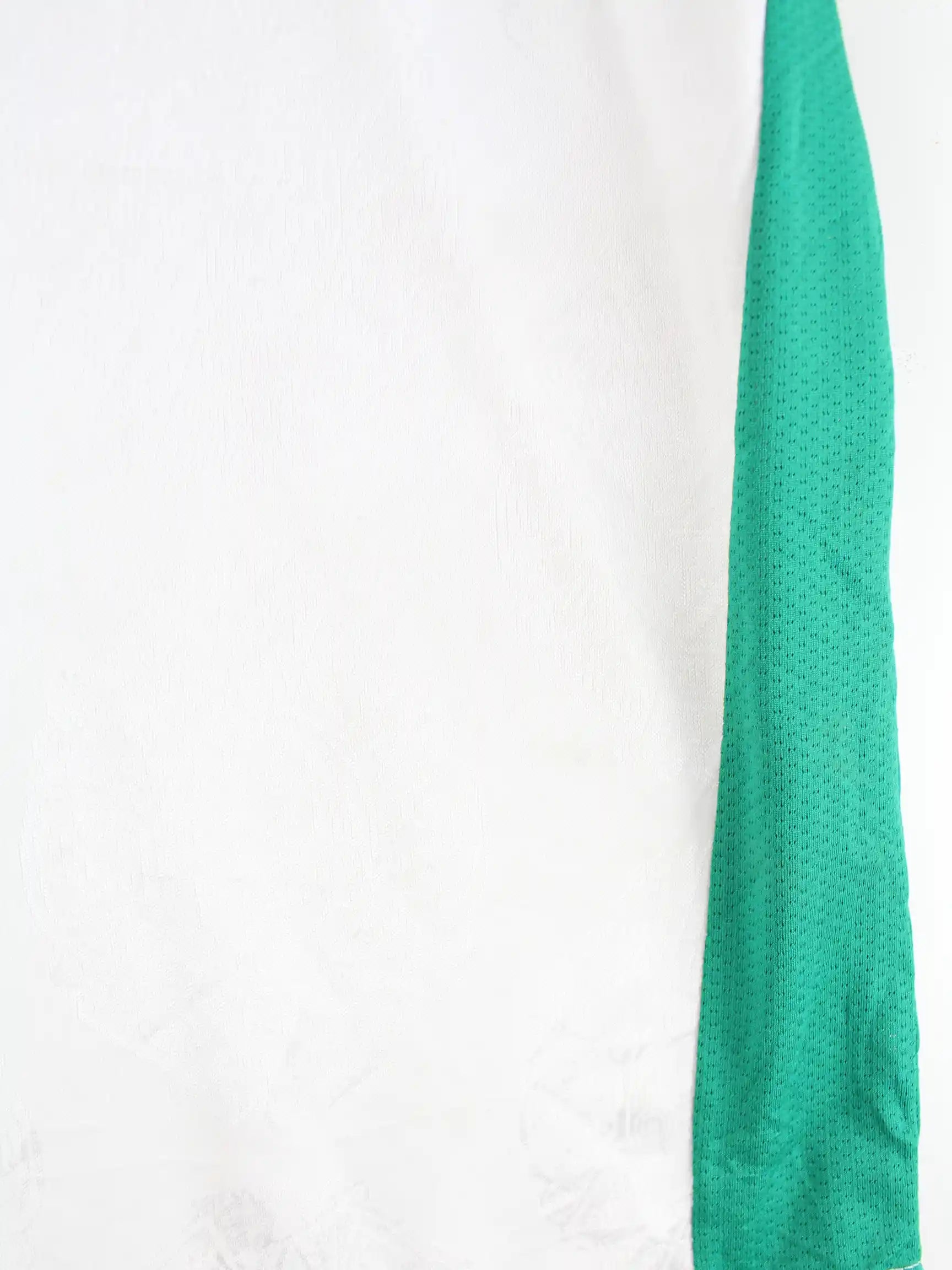 Weißes Vintage Trikot in Größe L. Es ist aus Synthetik gefertigt. Den Zustand würden wir als 'In Ordnung' bezeichnen (vergl. Bilder).