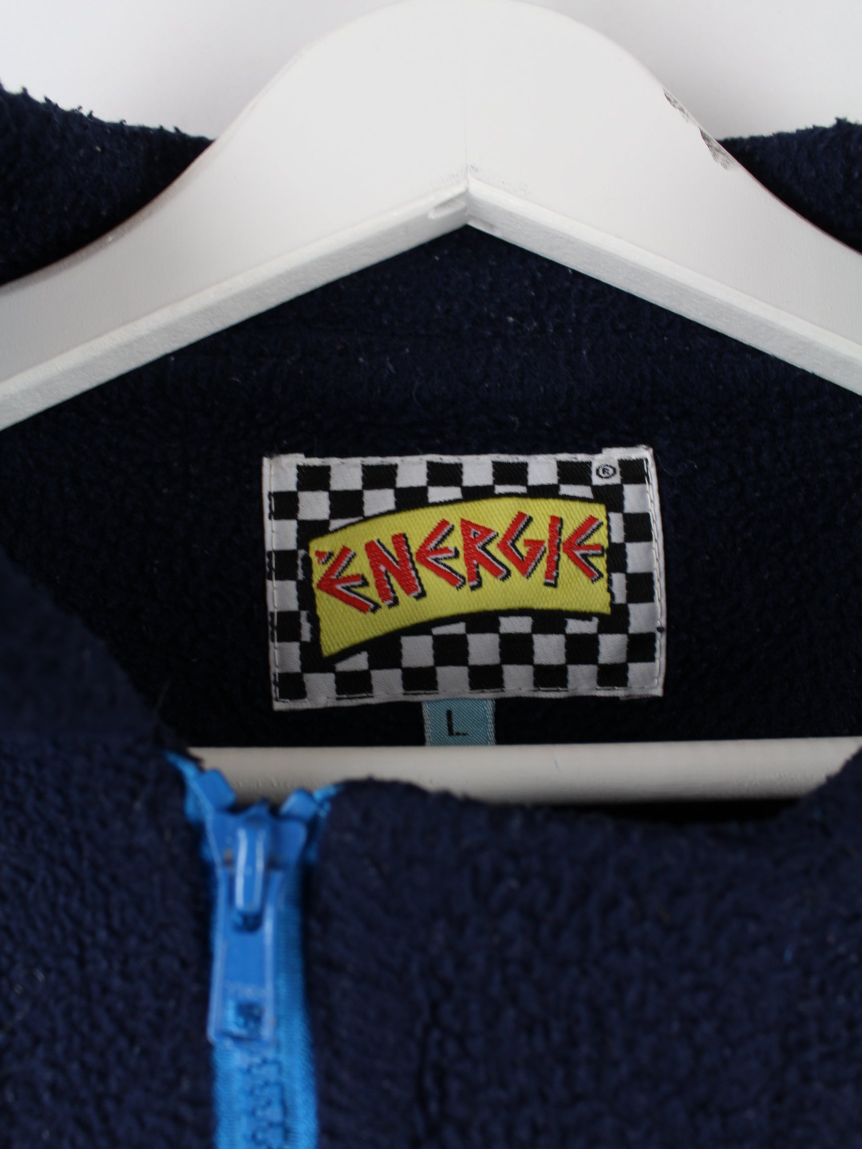 Blauer Vintage Sweater mit halbem Reißverschluß aus den 80'ern in Größe M. Er ist aus gemütlichem Fleece hergestellt und in sehr gutem Zustand bei uns zu bekommen.