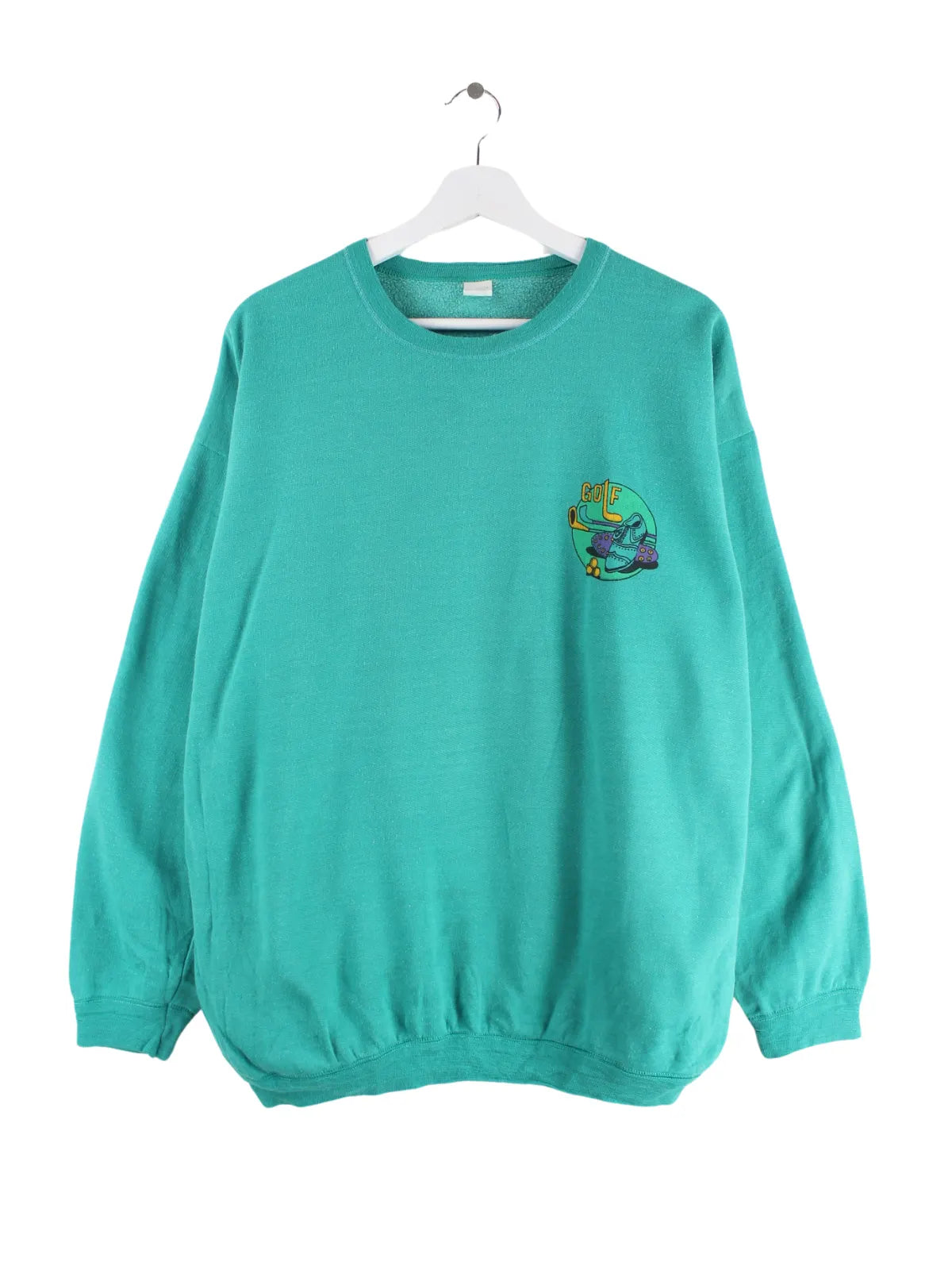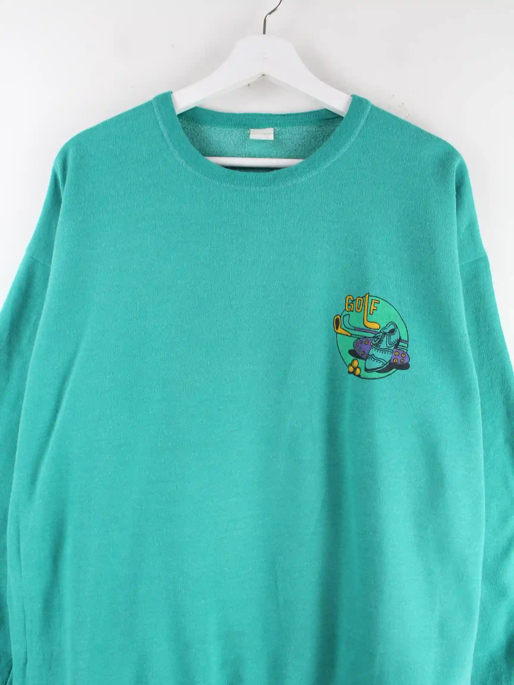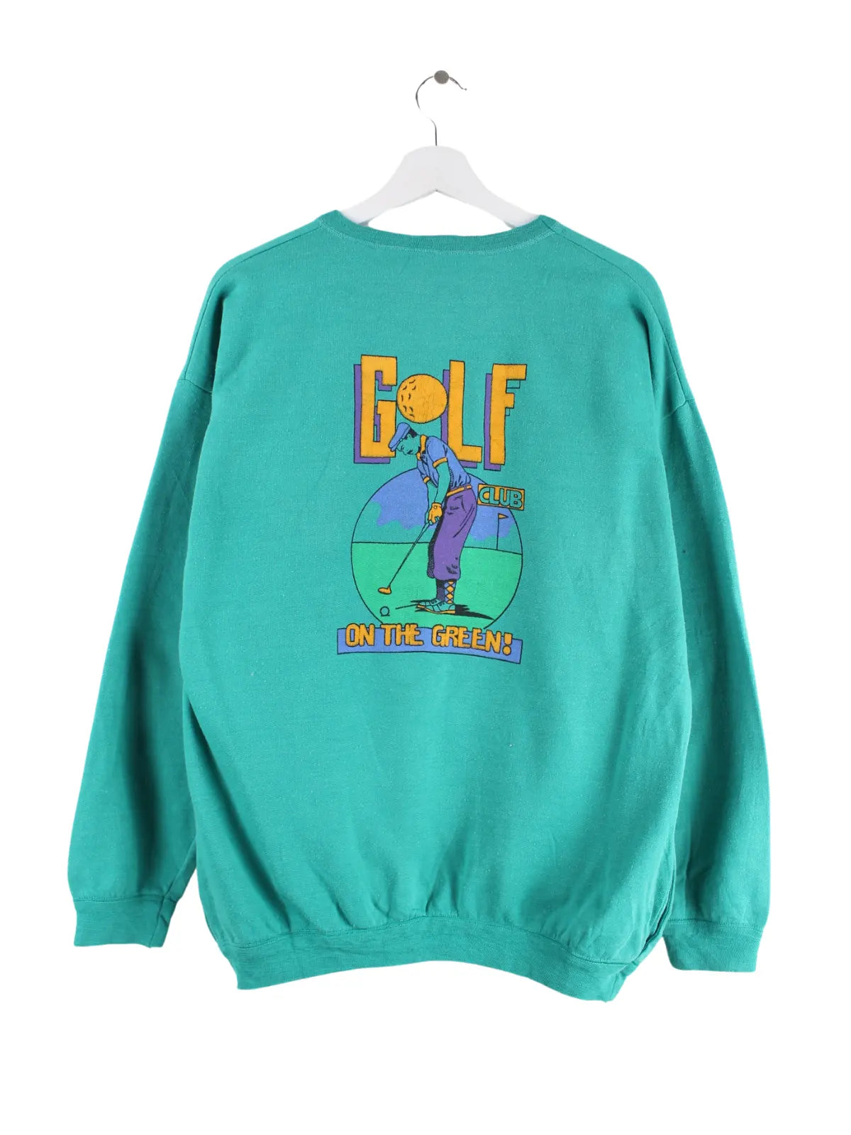 Türkisfarbener Vintage Sweater aus den 80'ern in Größe M. Er ist aus einer Baumwollmischung gefertigt und in sehr gutem Zustand bei uns vorrätig. Mit seltenem Club Print.