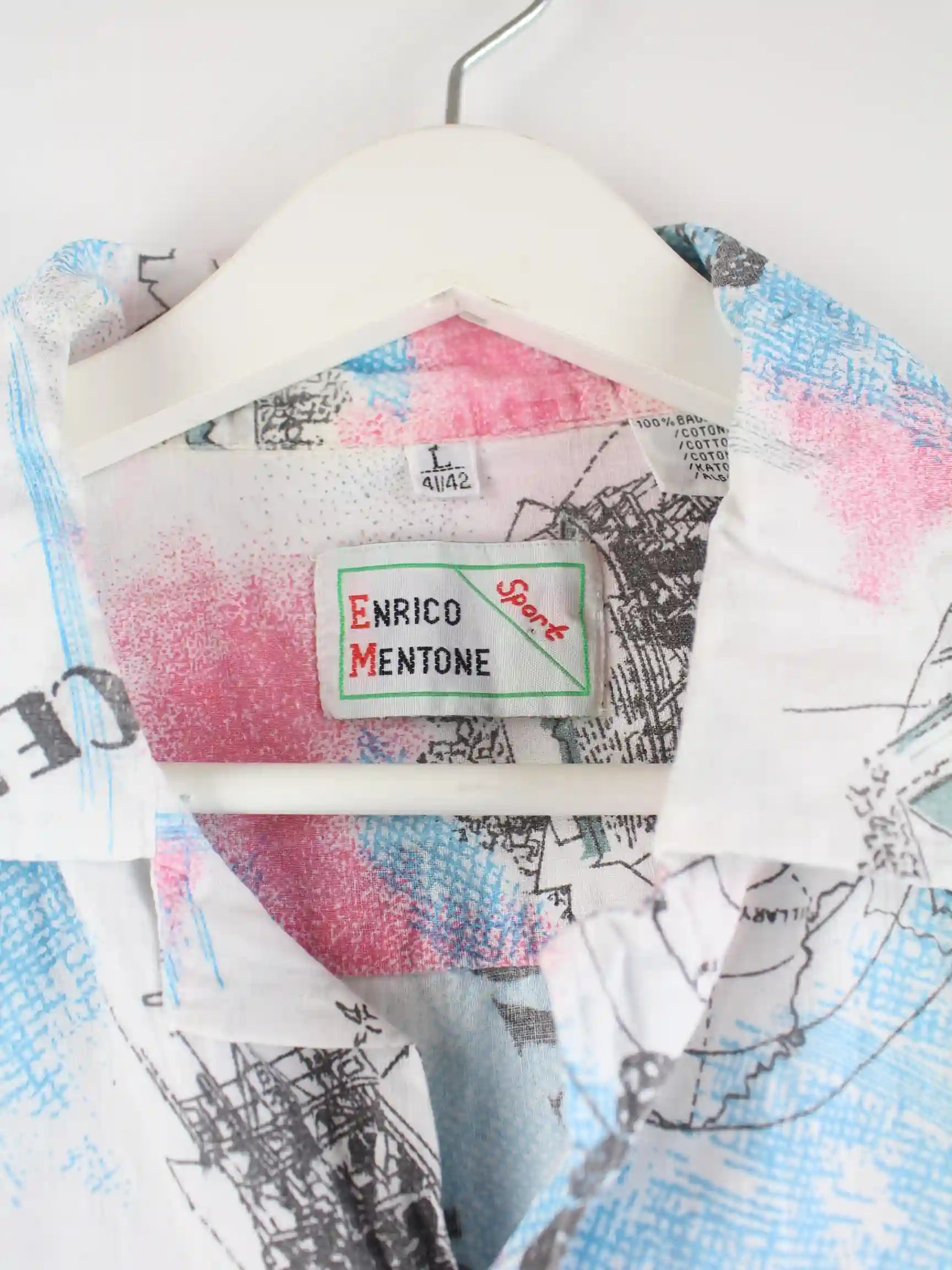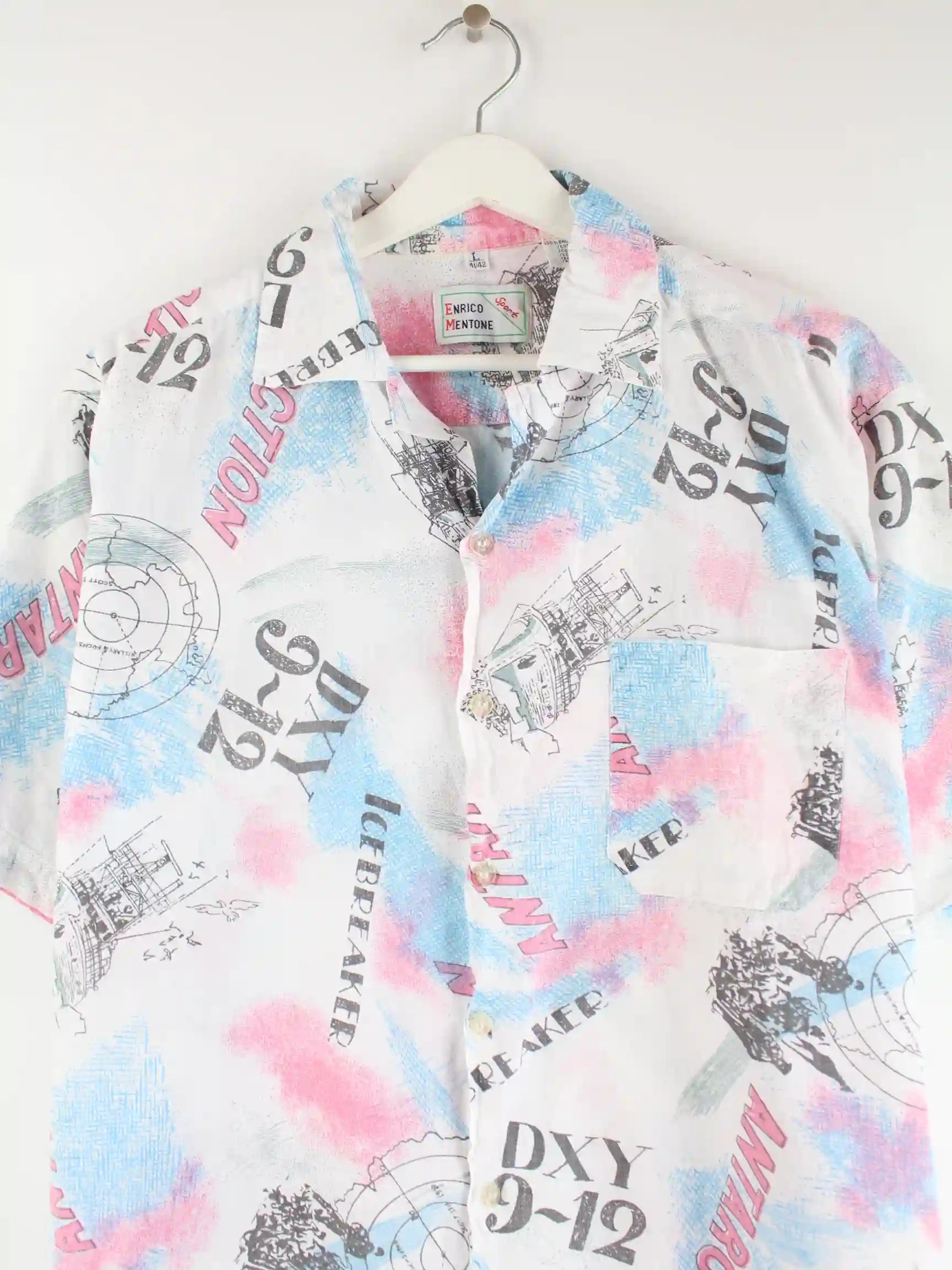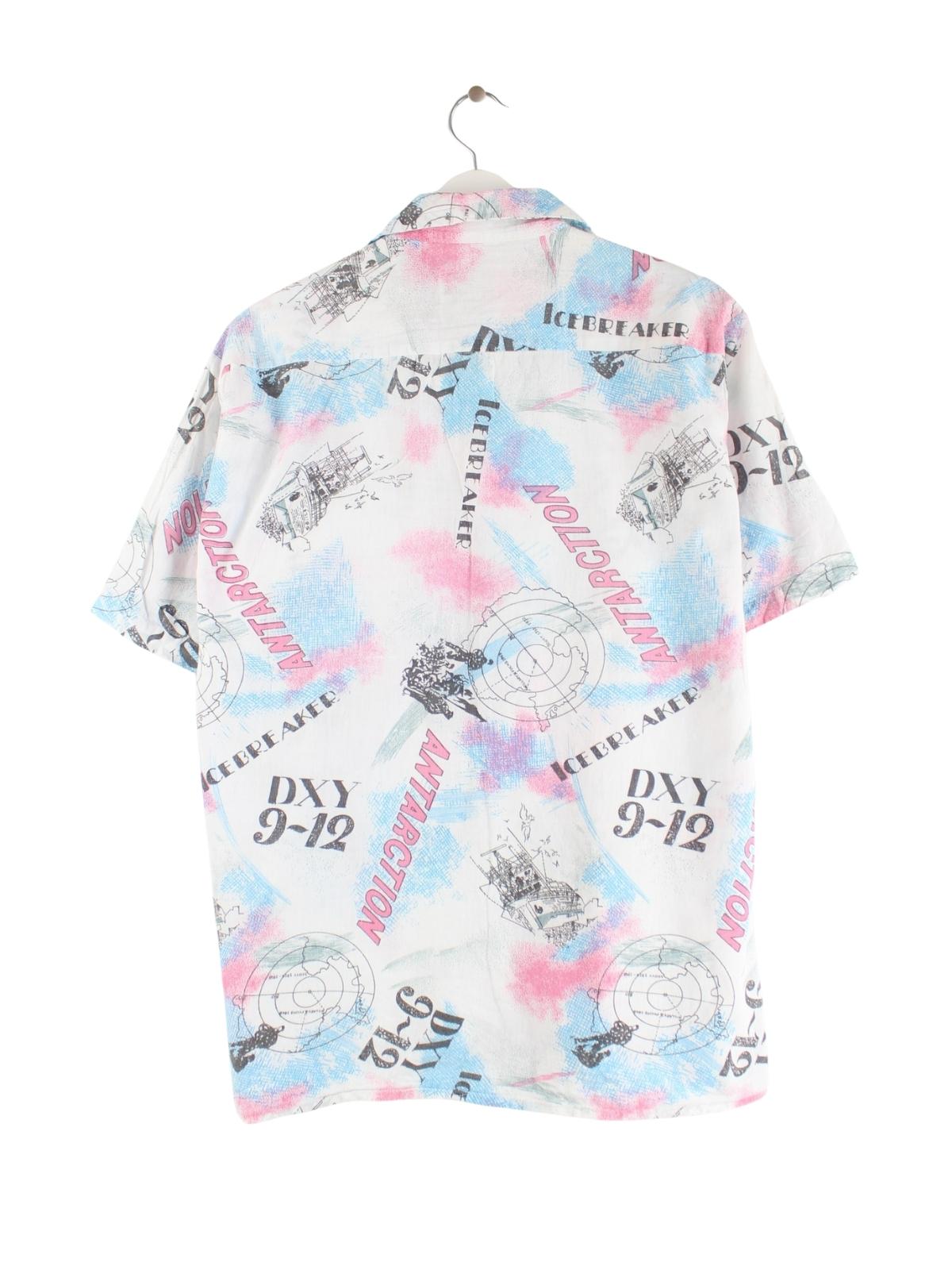Vintage Hawaii Hemd in Größe L aus den 80'ern. Es ist aus einer Baumwollmischung produziert und in Weiß im Bestand.