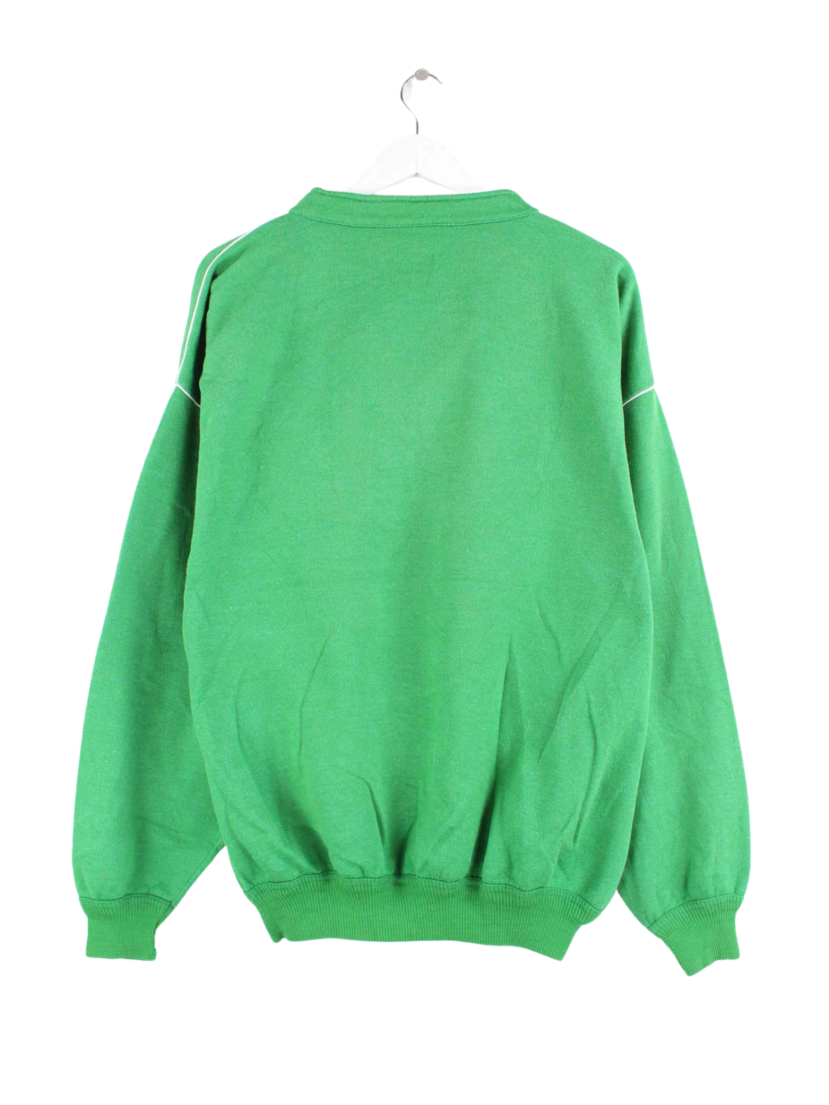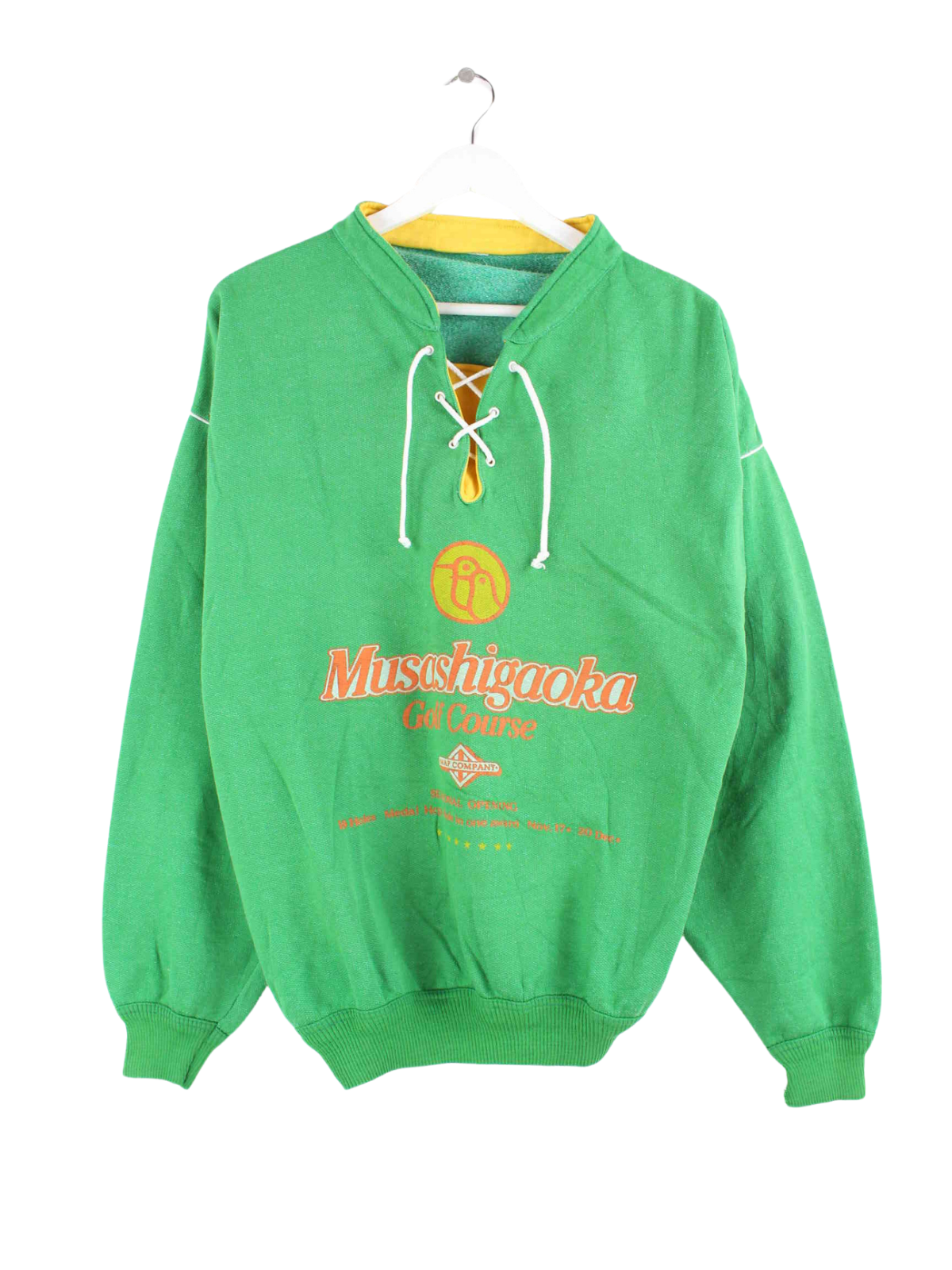 Vintage sweater in size XL from the 80's. It is made from a cotton blend and is available in green. With a great Musashigaoka print.