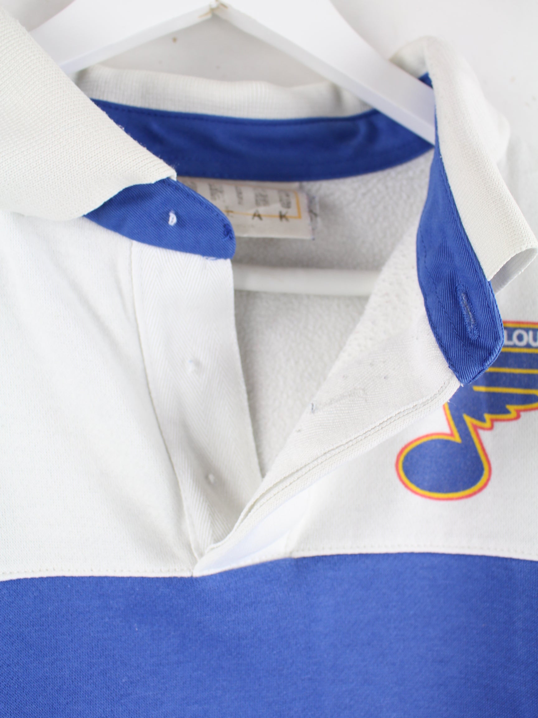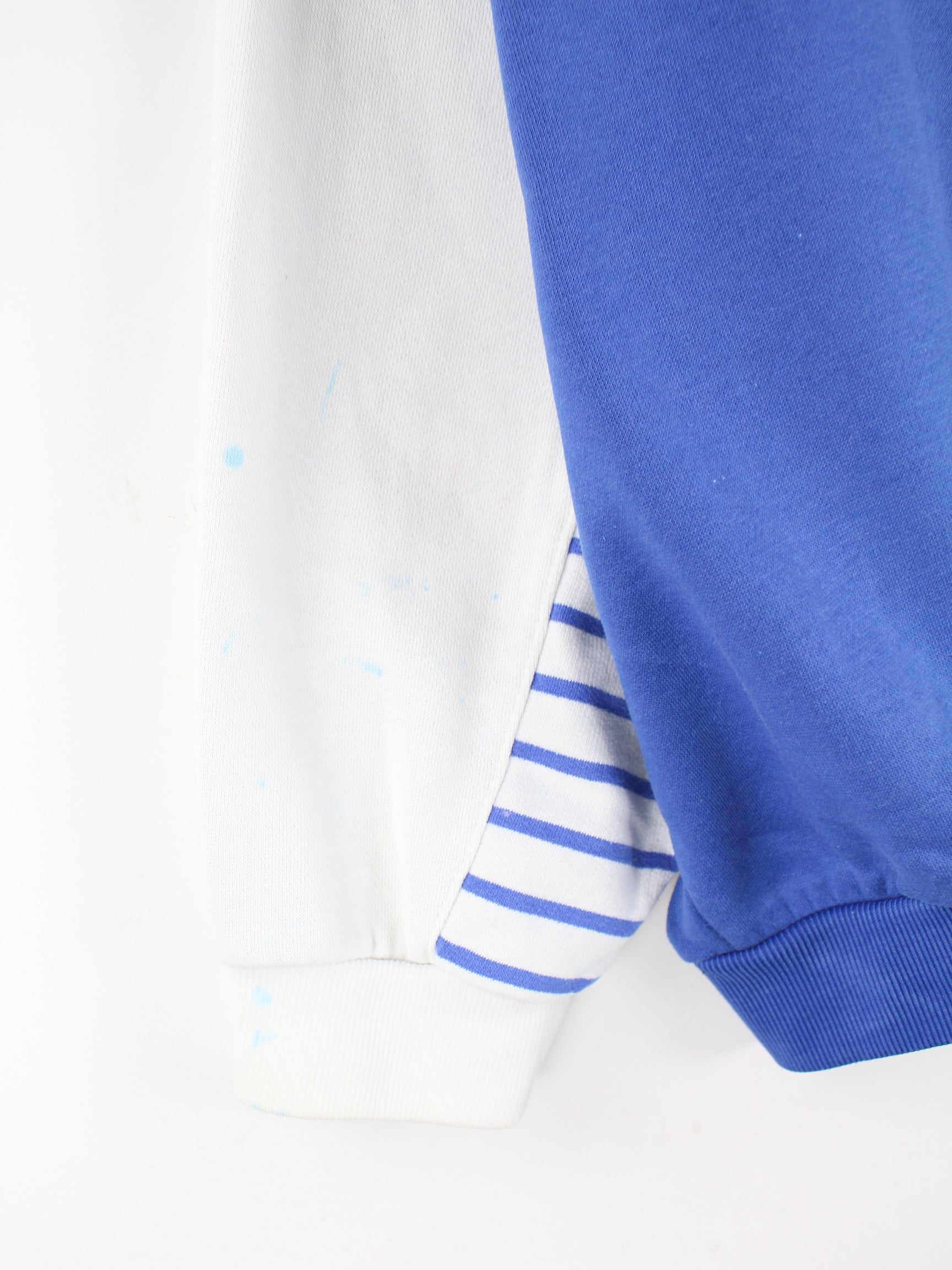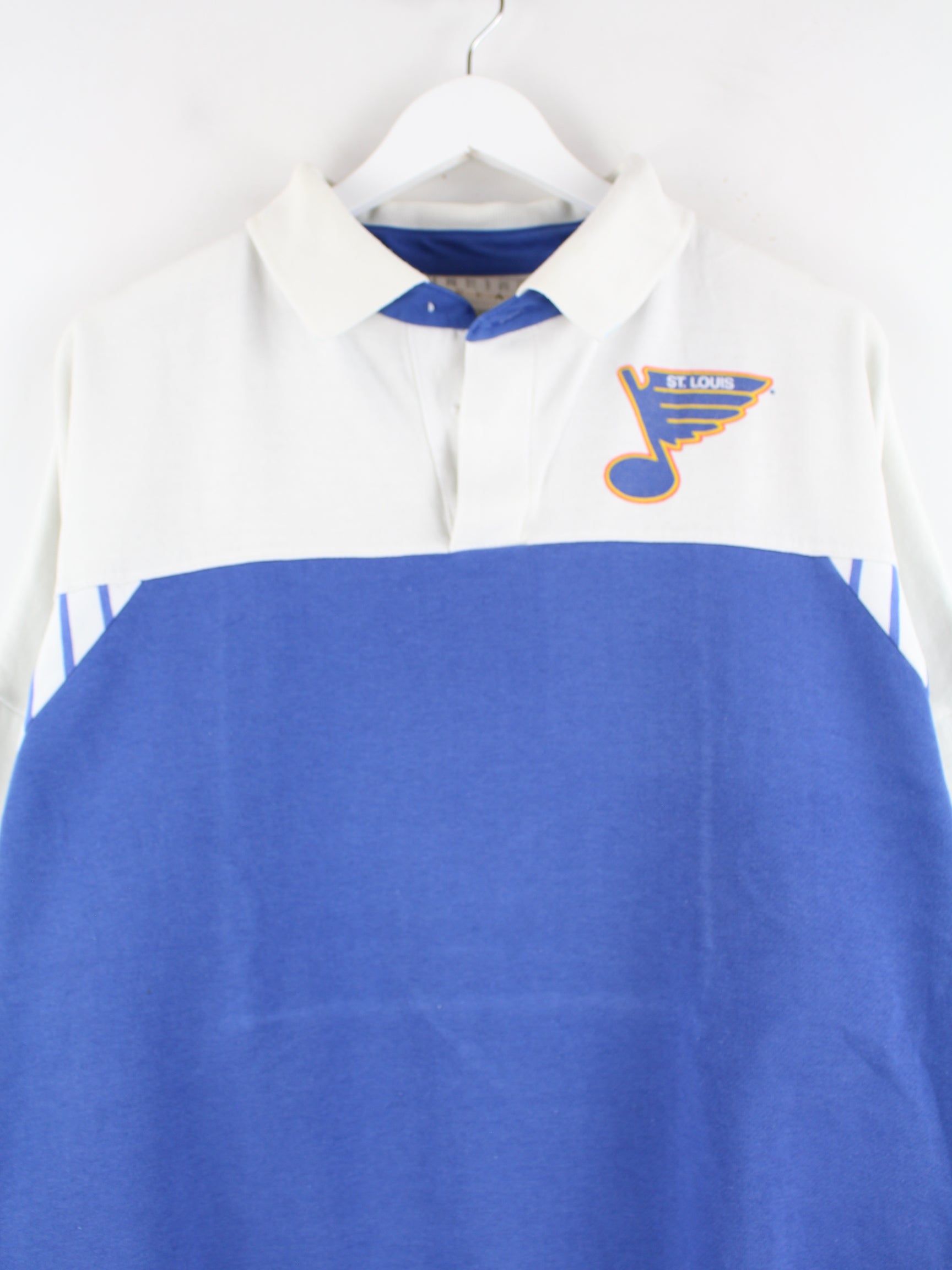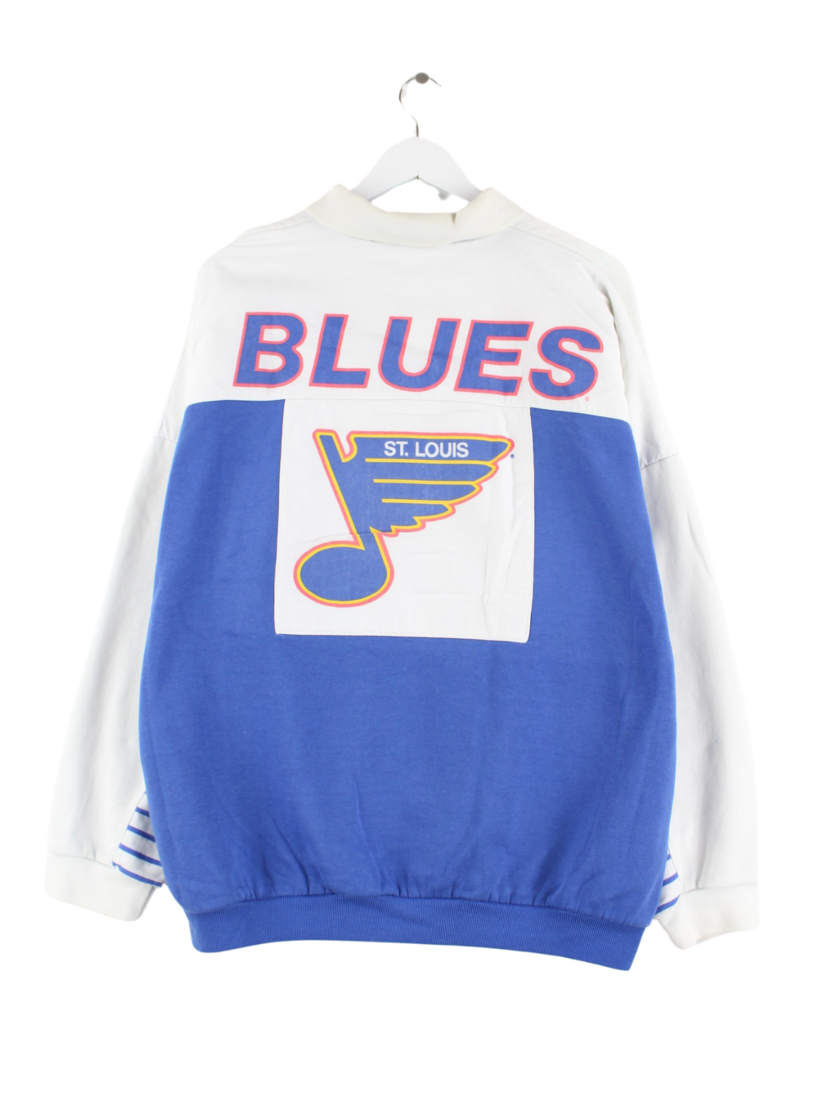 Vintage Sweater in Größe XL aus den 80'ern. Er ist aus einer Baumwollmischung gefertigt und in Blau bei uns zu bekommen. Mit schickem Louis Print.