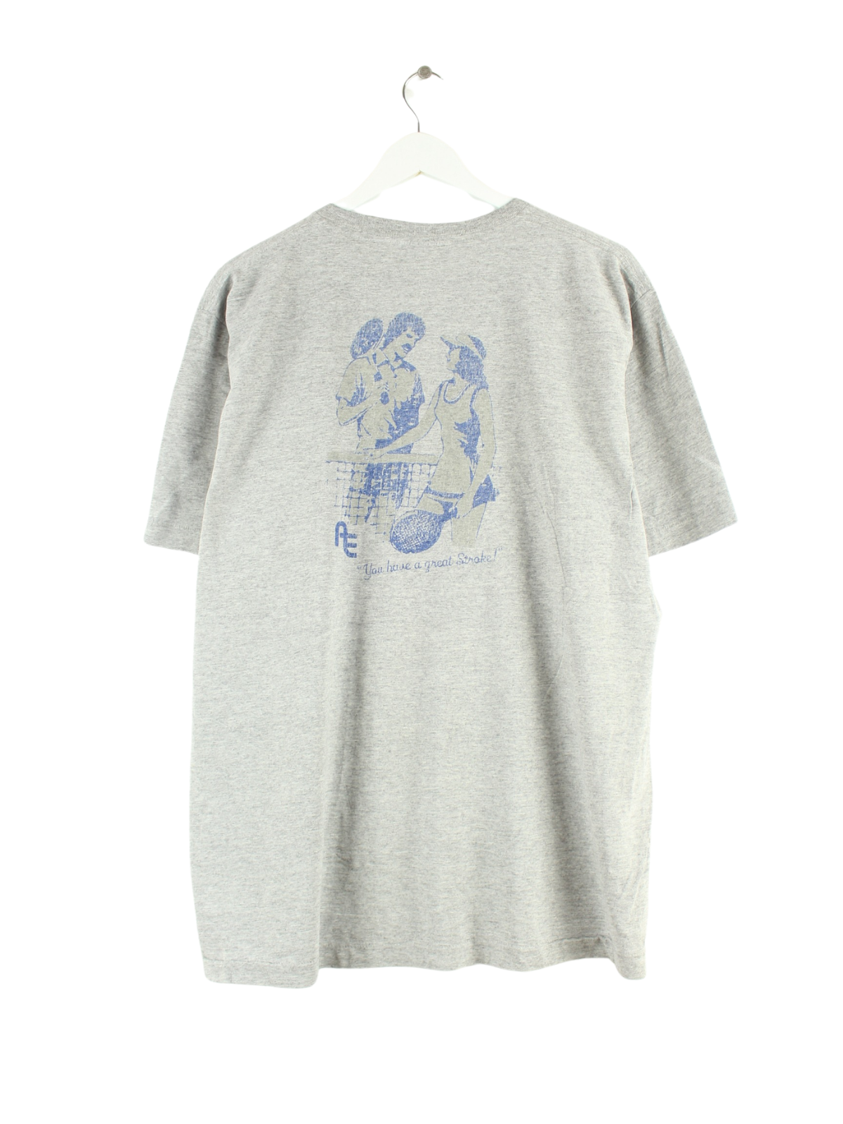 Grey vintage T-shirt from the 80's in size XL. It is made of cotton and is available from us in good condition. With a rare tennis print.