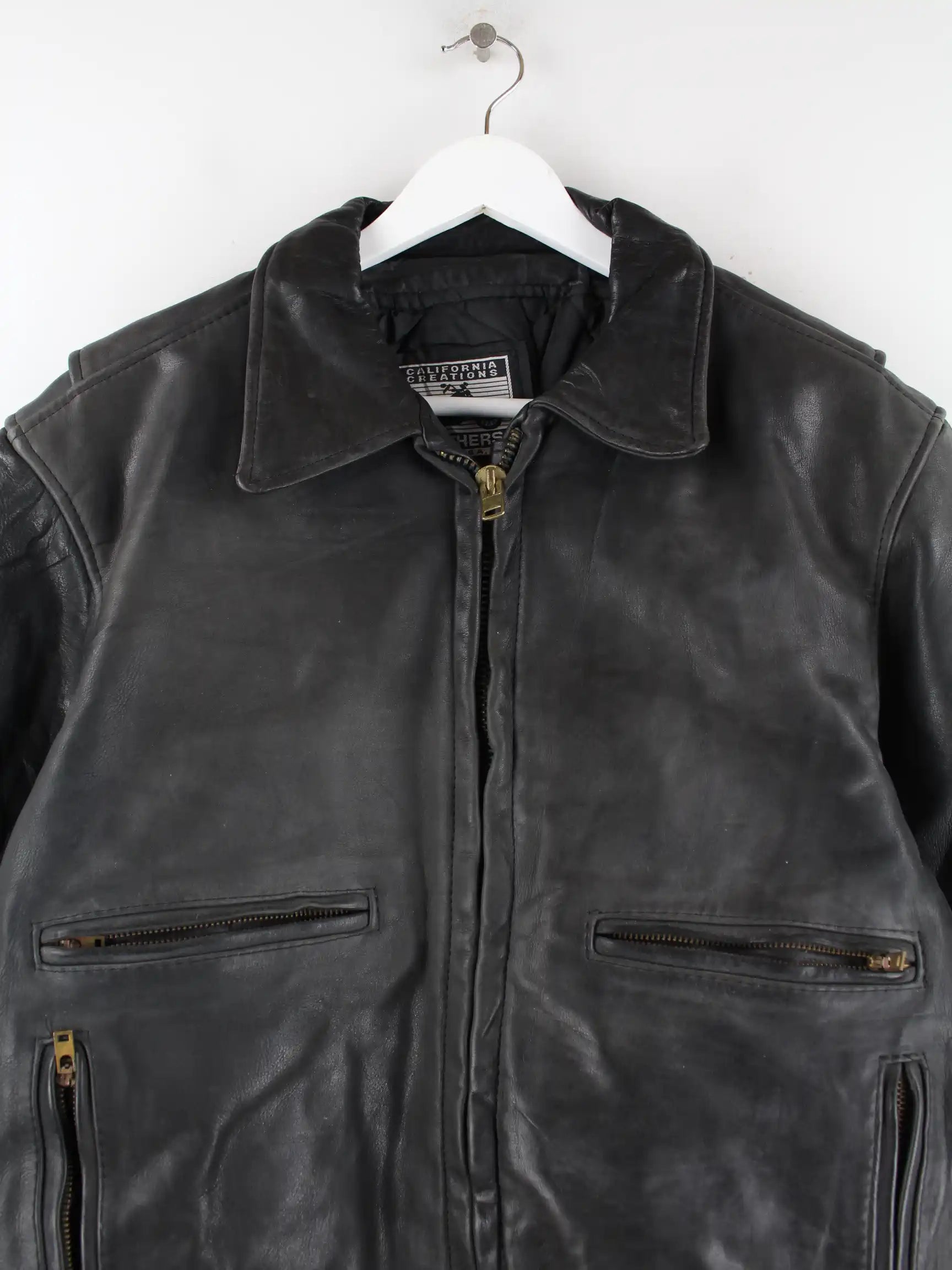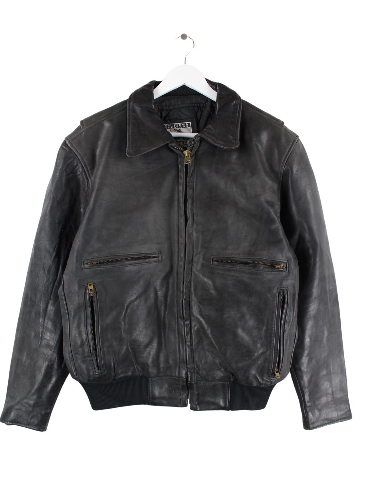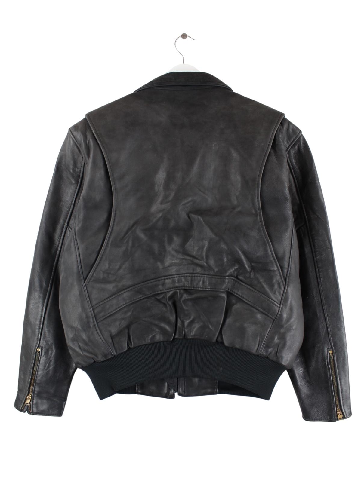 Schwarze Vintage Jacke aus den 90'ern in Größe L. Sie ist aus Leder produziert und in gutem Zustand bei uns zu bekommen.