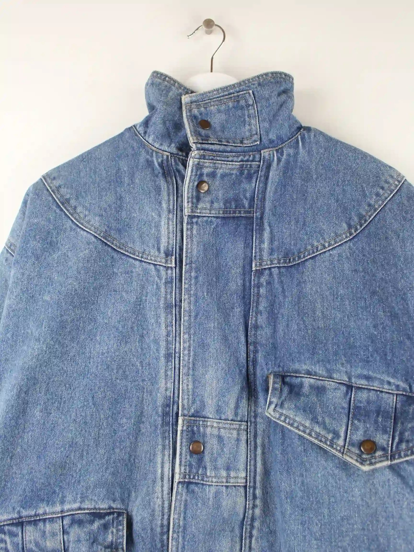 Blaue Vintage Jacke aus den 90'ern in Größe M. Sie ist aus Baumwolle angefertigt. Den Zustand würden wir als 'In Ordnung' bezeichnen (vergl. Bilder).