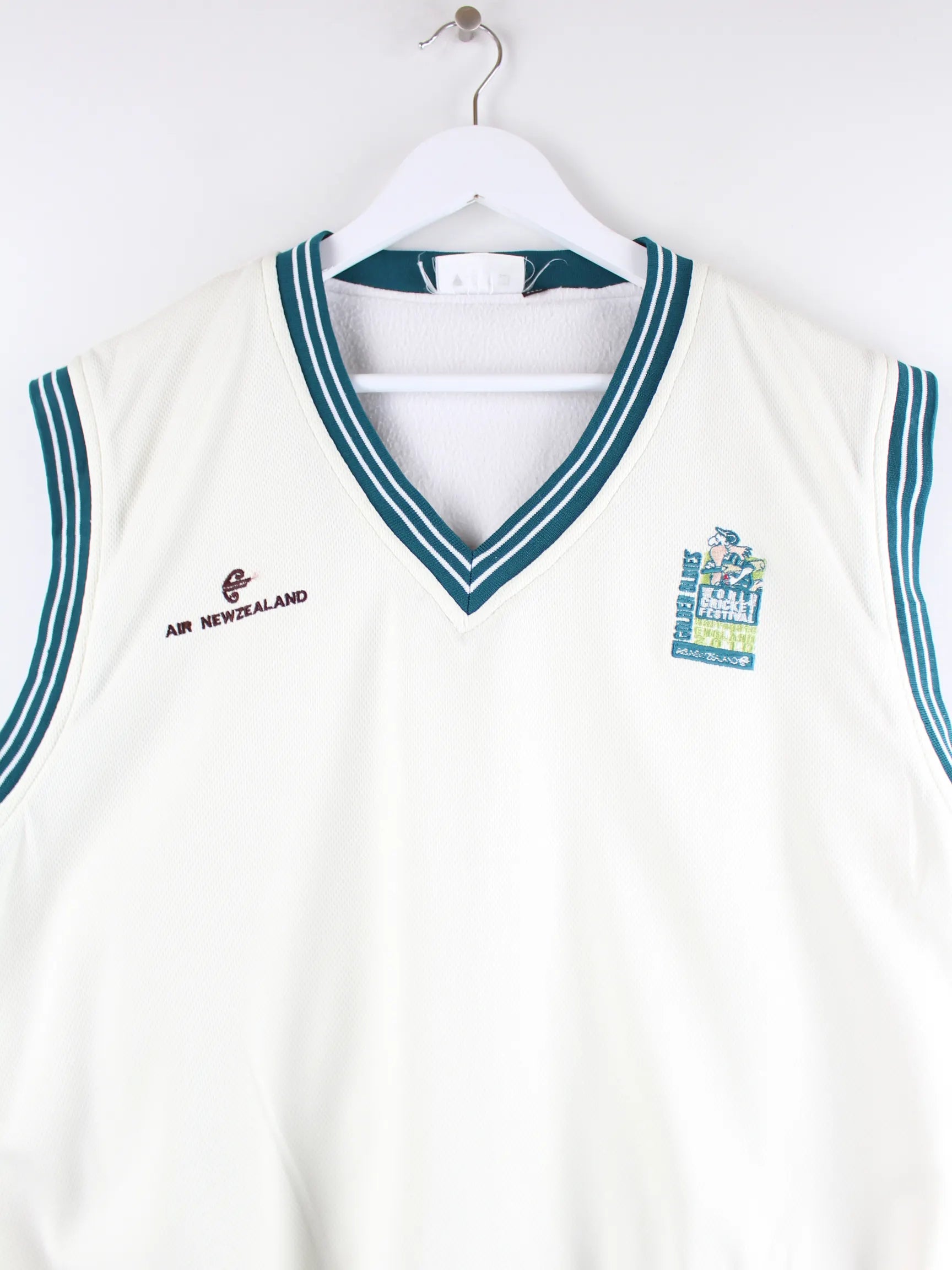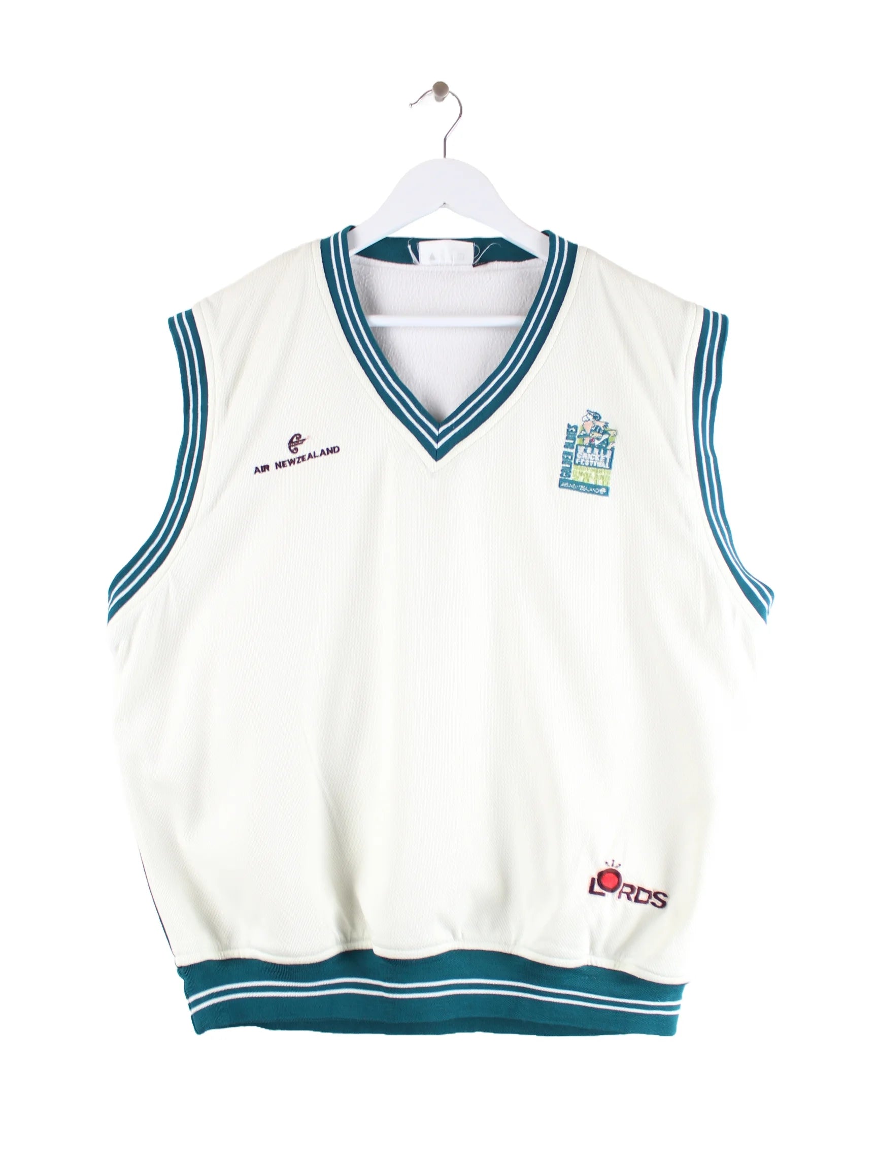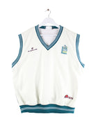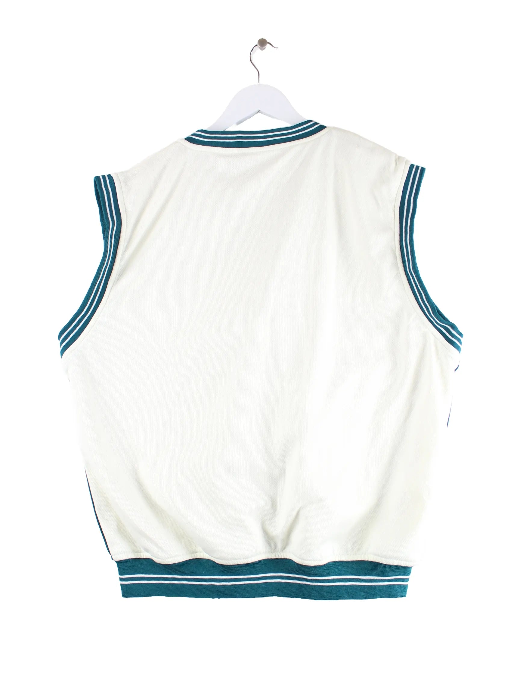 Weißer Vintage Pullunder in Größe XL. Er ist aus Synthetik gemacht und in sehr gutem Zustand bei uns vorrätig.