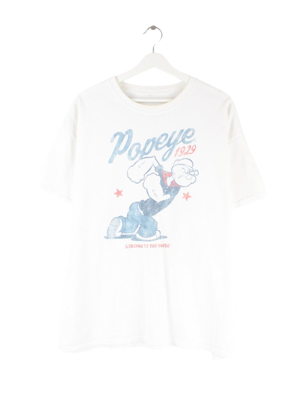 Vintage T-Shirt in Größe XL. Es ist aus Baumwolle angefertigt und in Weiß in Stock. Mit schönem Popeye Print.