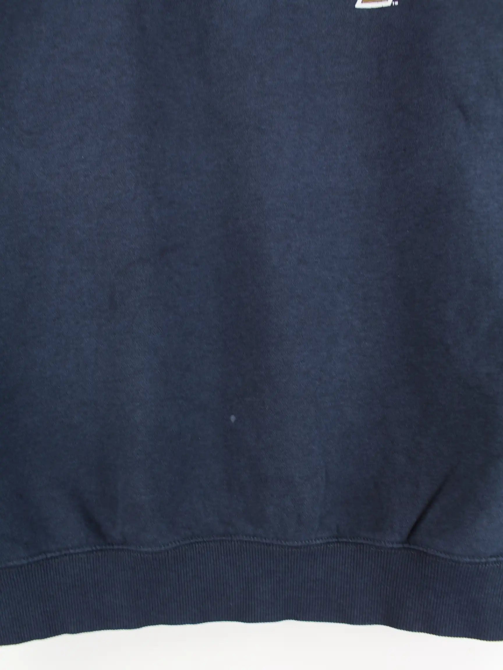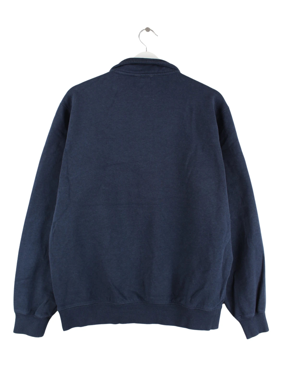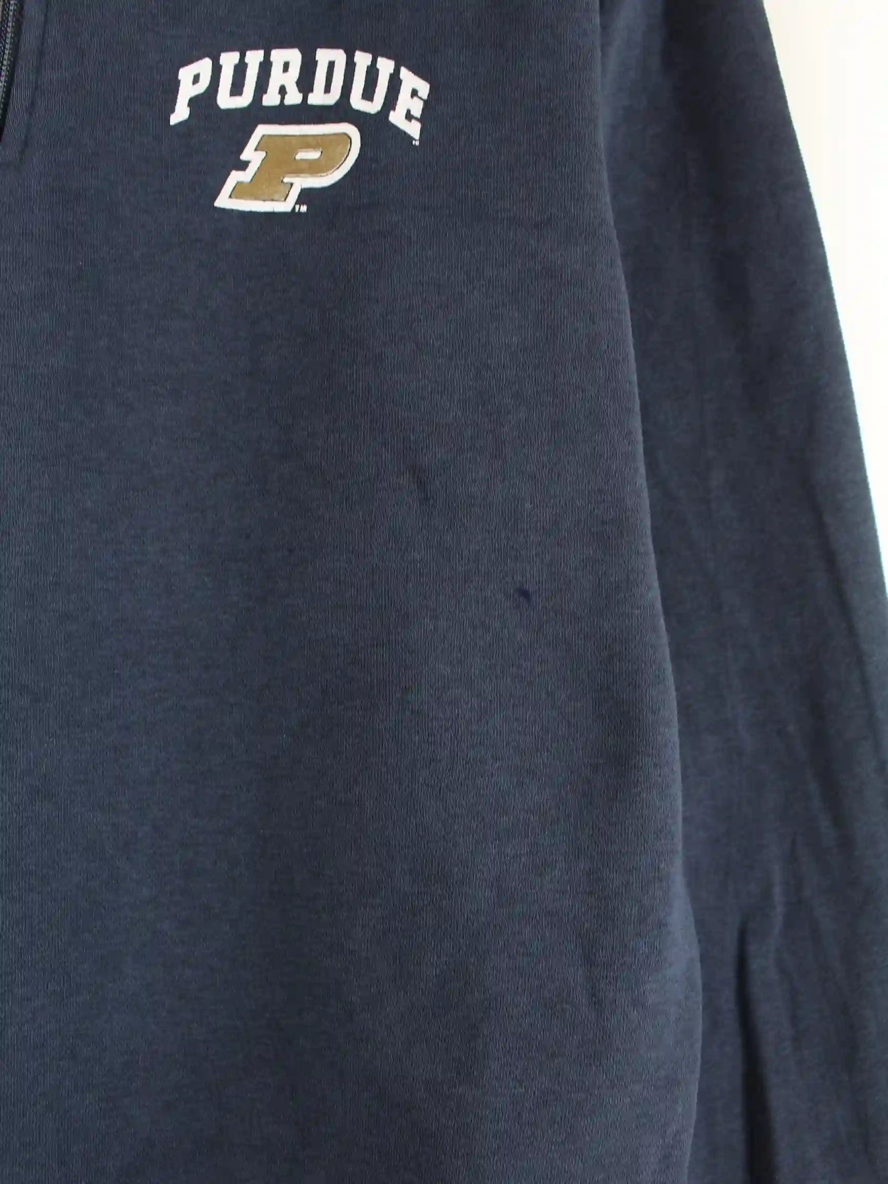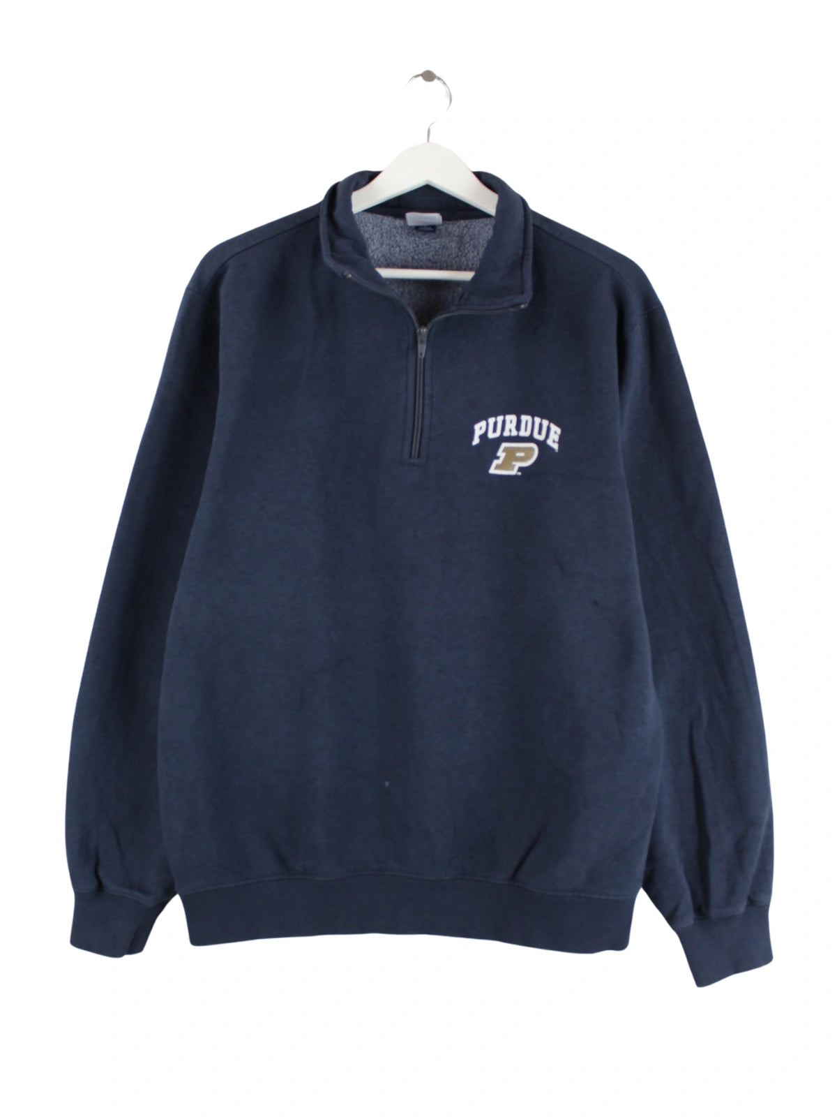 Blauer Vintage Sweater mit halbem Reißverschluß in Größe M. Er ist aus einer Baumwollmischung gemacht. Den Zustand würden wir als 'In Ordnung' bezeichnen (vergl. Bilder).Mit chiquem Purdue Print.