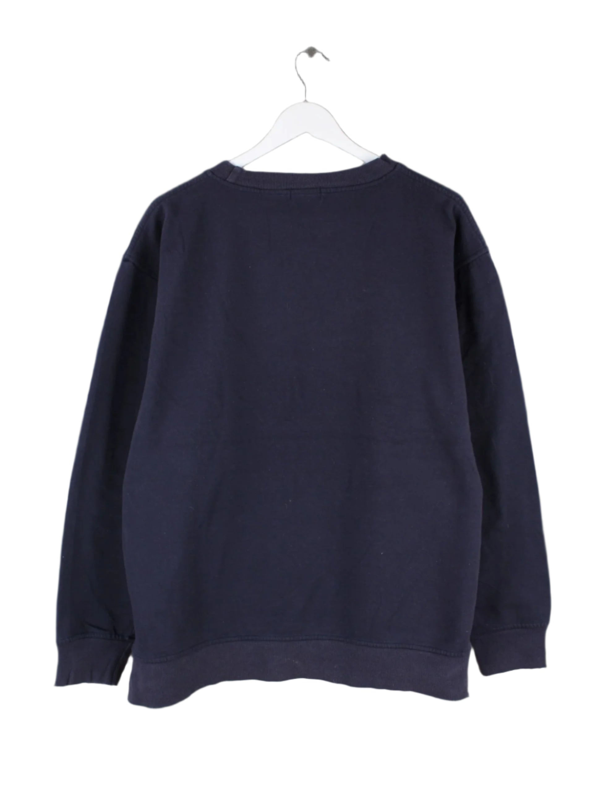 Vintage Sweater mit gesticktem Logo in Größe XL. Er ist aus einer Baumwollmischung gemacht und in Blau zu haben.