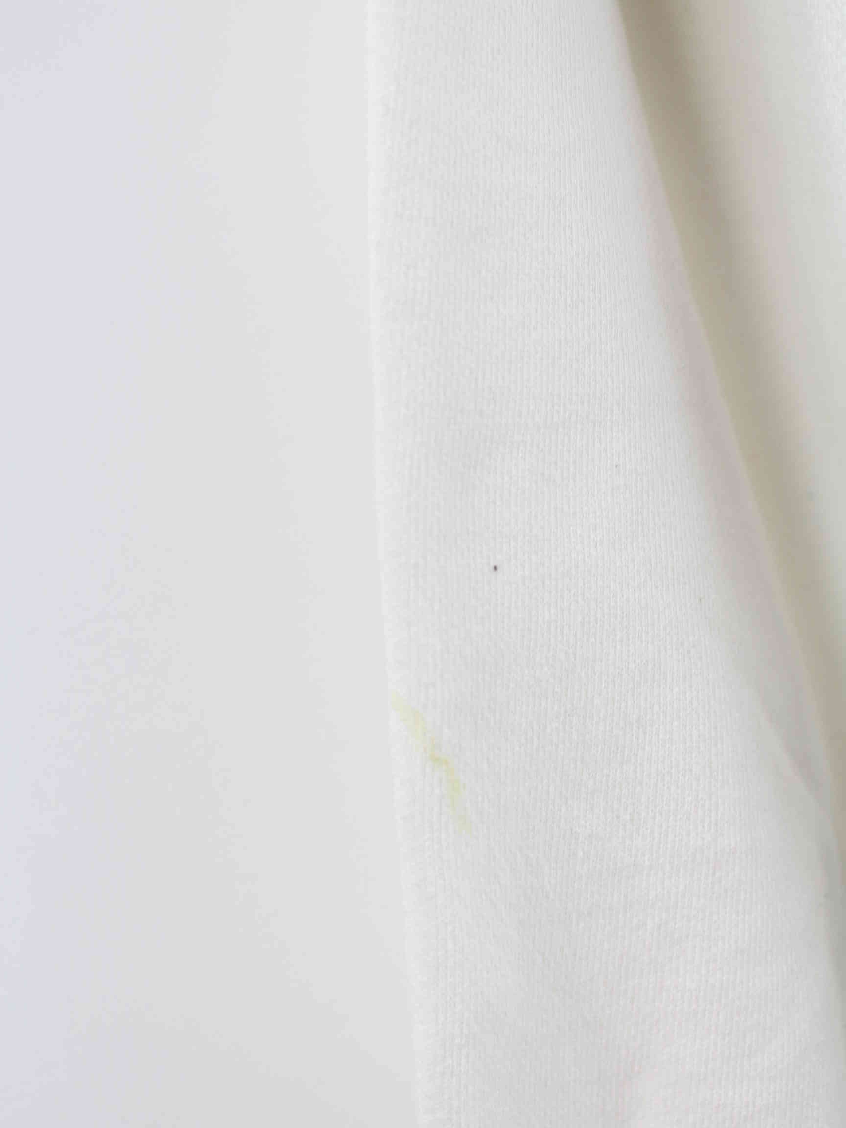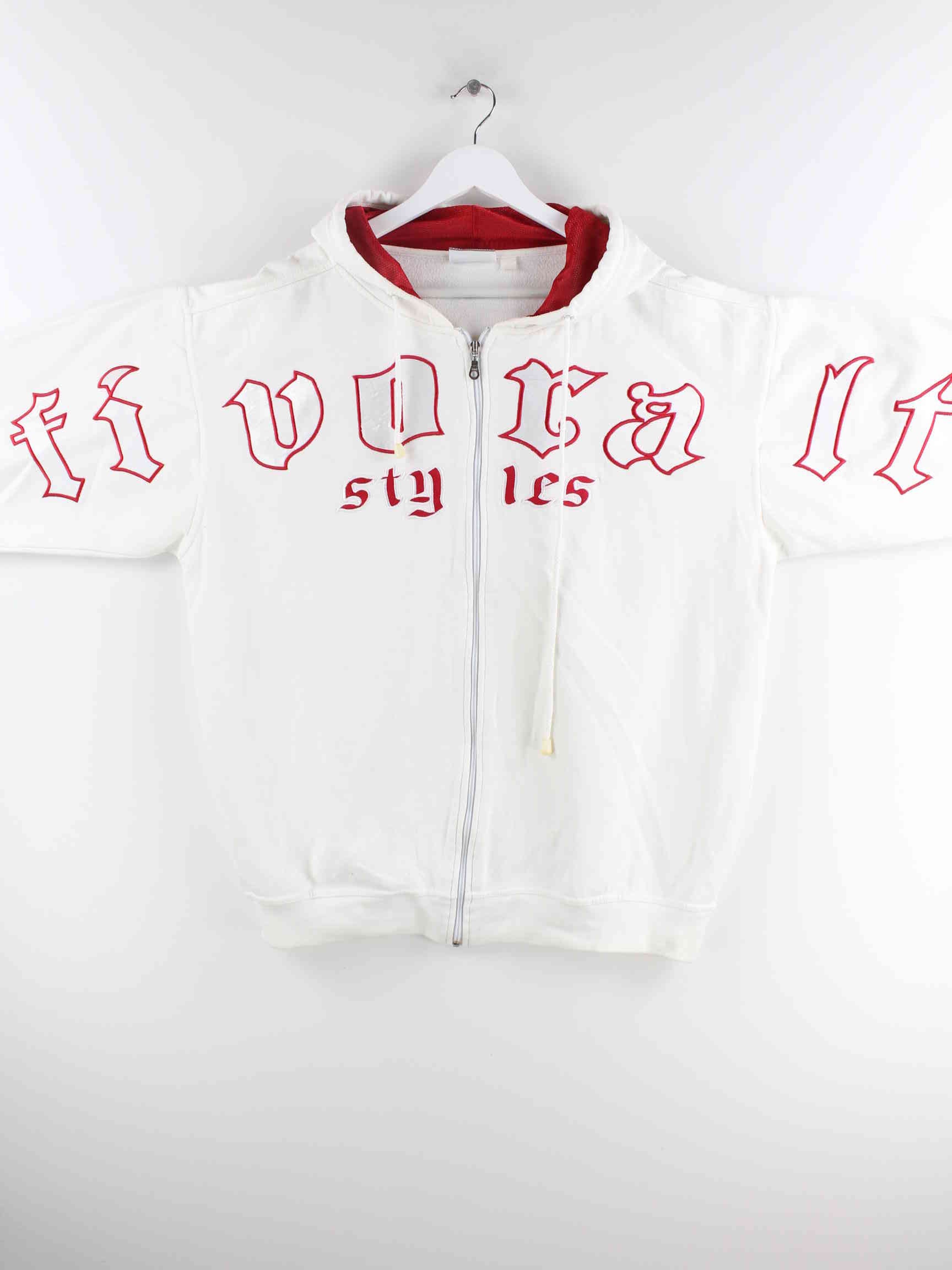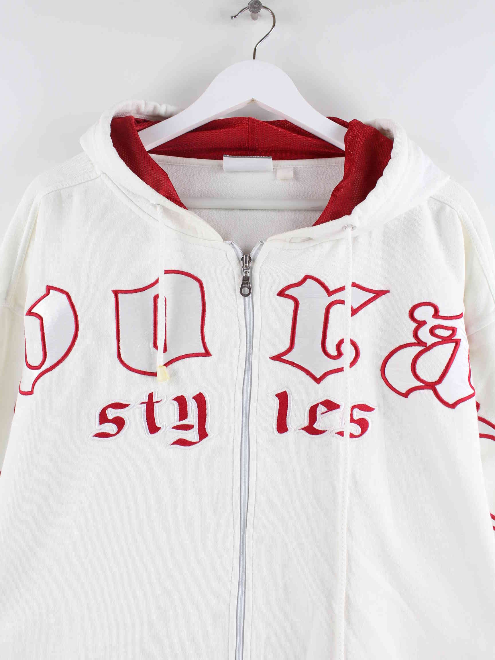 White vintage hoodie with embroidered logo and long zipper from the early 2000s in size XL. It is made from a cotton blend and is in stock in good condition.
