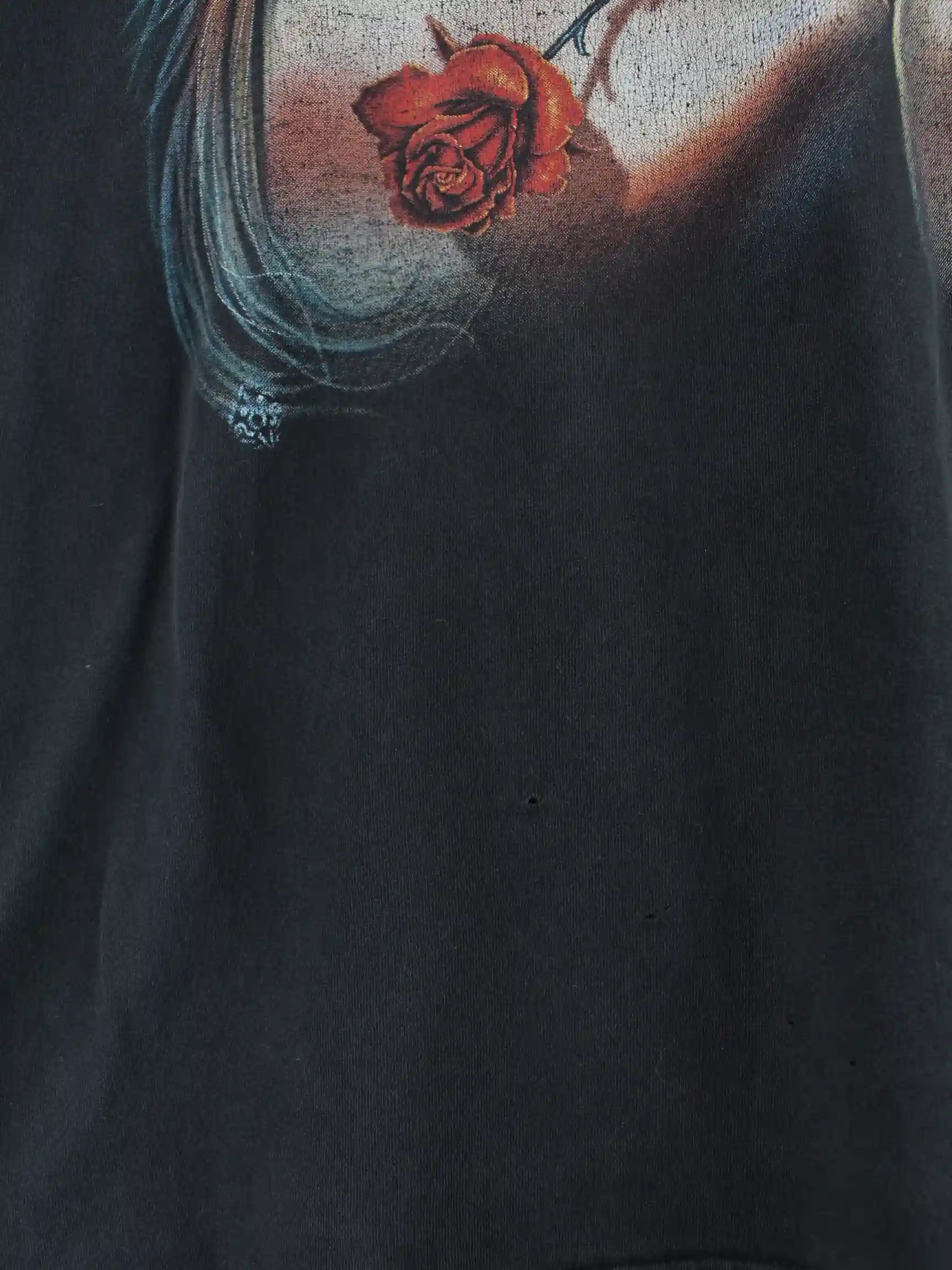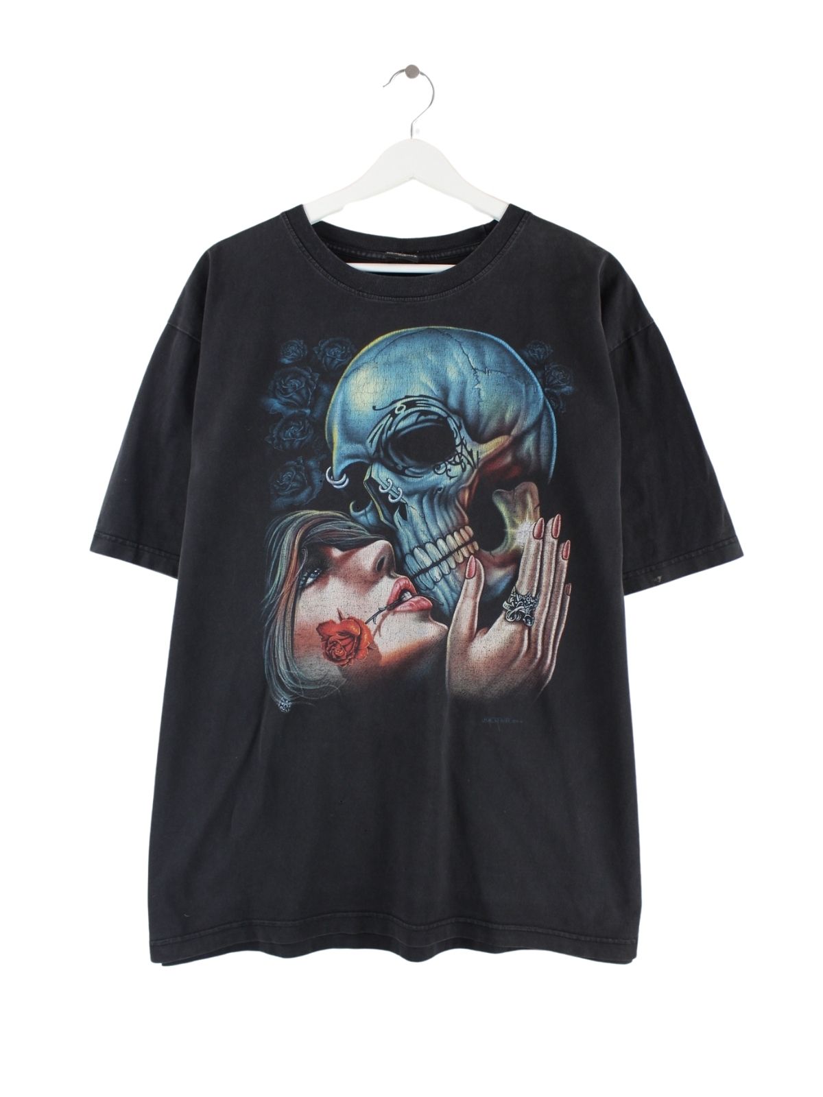 Vintage T-Shirt in Größe XXL aus Anfang der 2000'er. Es ist aus einer Baumwollmischung angefertigt und in Schwarz bei uns vorrätig. Mit chiquem Skull Print.