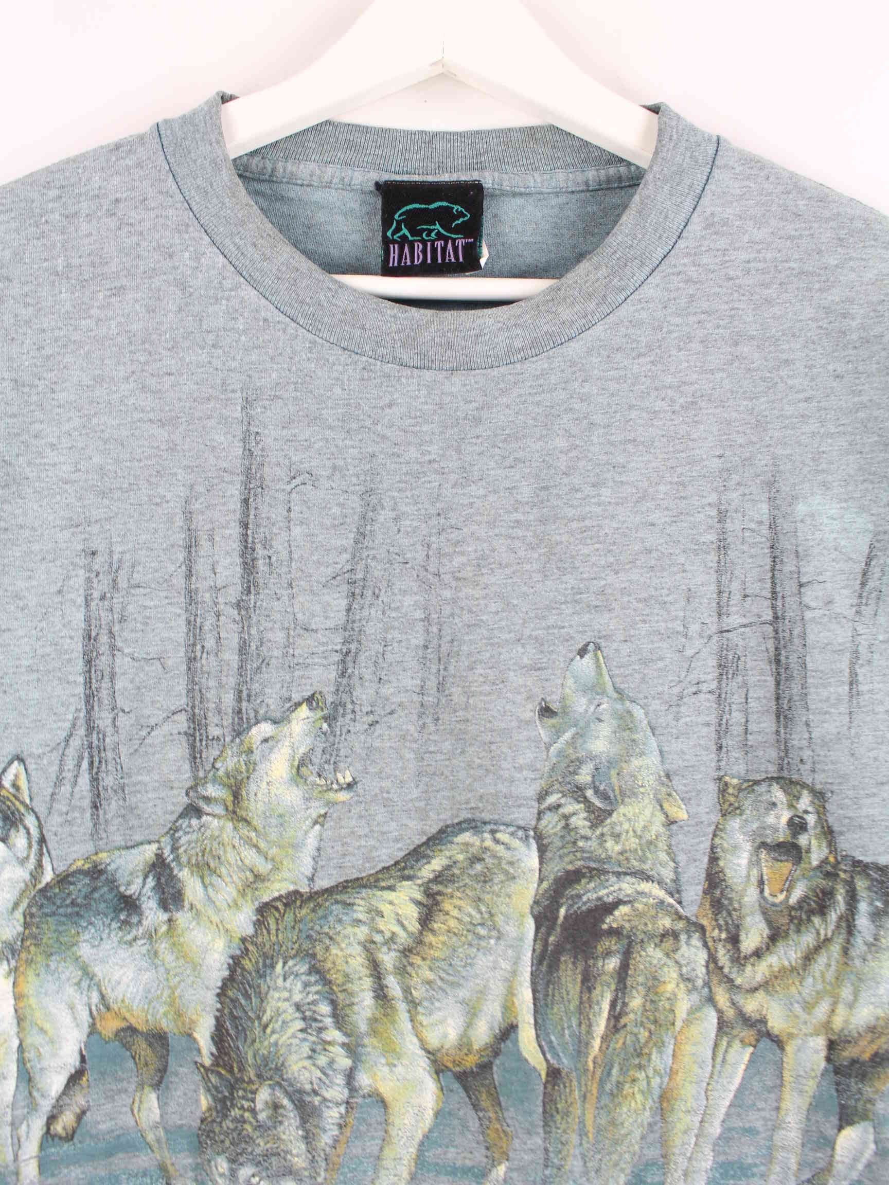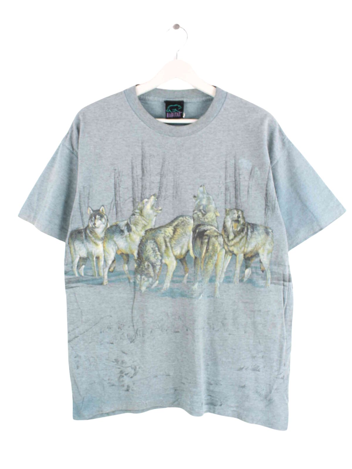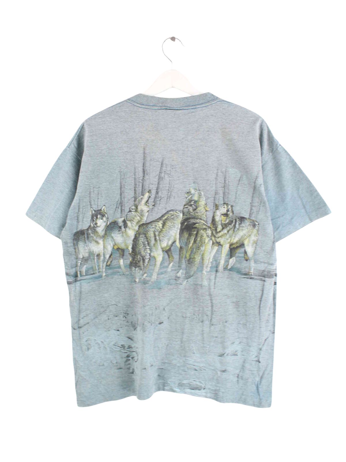 Blue vintage t-shirt from the early 2000s in size L. It is made of cotton and is in stock in very good condition. With a chic wolf print.