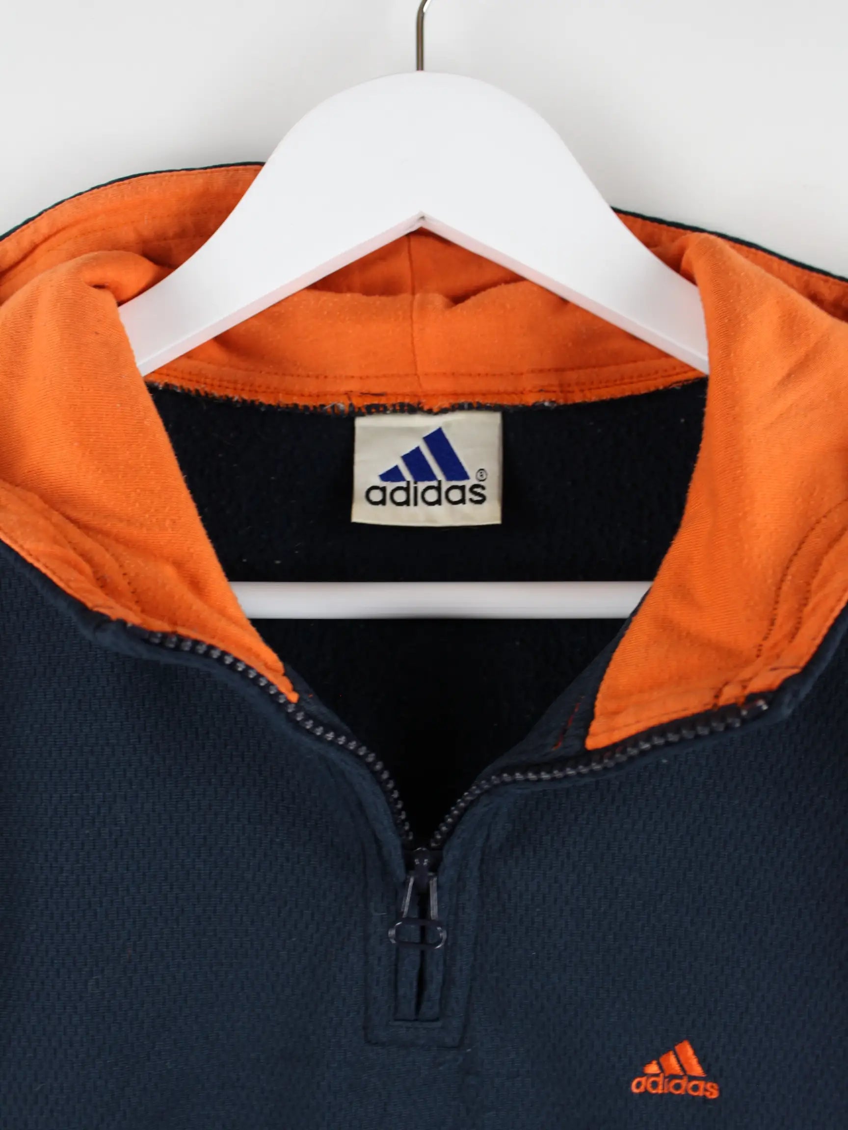 Hoodie des Labels Adidas mit half Zip in Größe S aus den 90'ern. Er ist aus Synthetik produziert und in Blau zu bekommen.