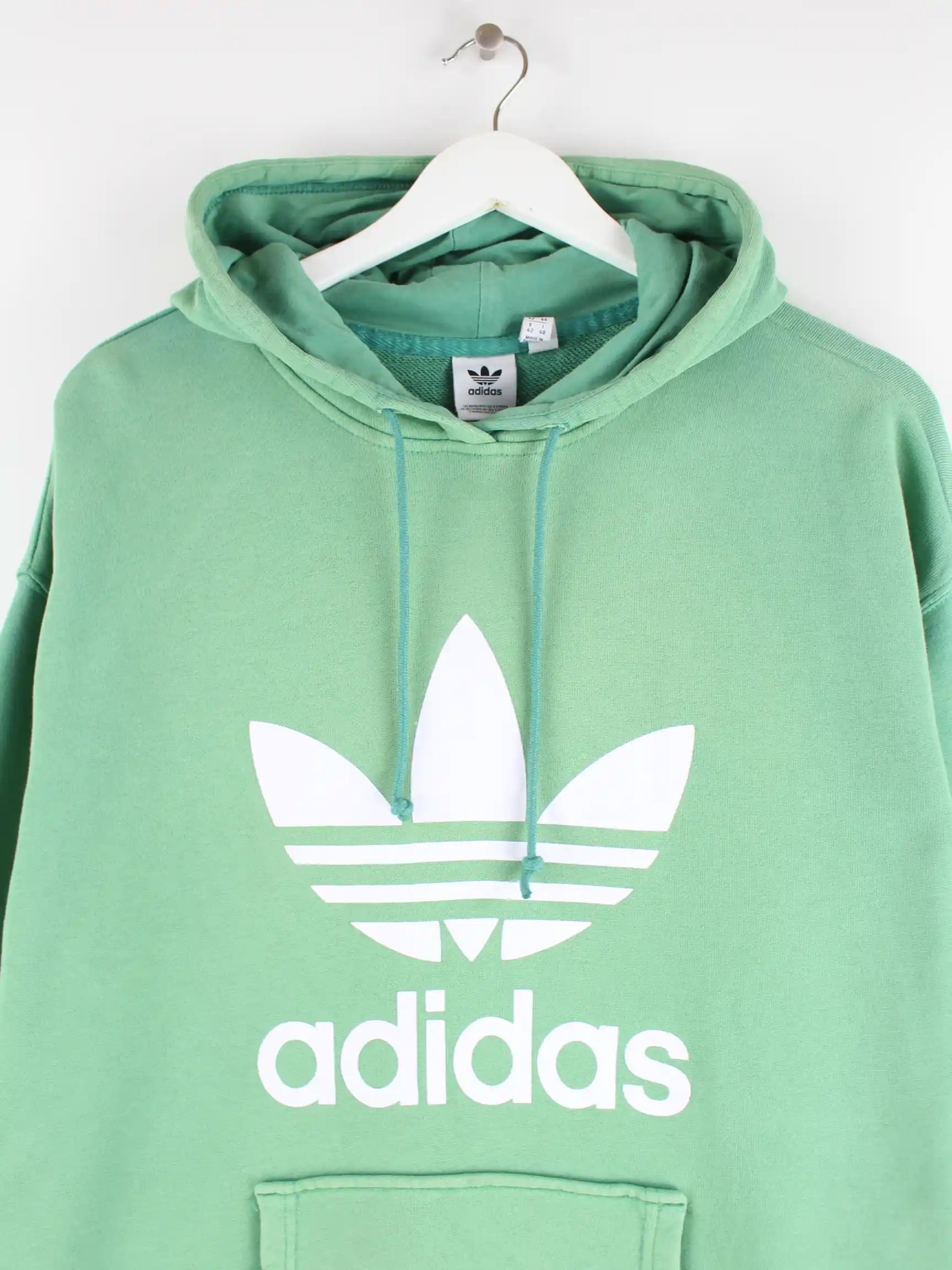 Hoodie der Brand Adidas in Größe XL. Er ist aus einer Baumwollmischung gefertigt und in Grün bei uns vorrätig. Mit schönem Trefoil Print.