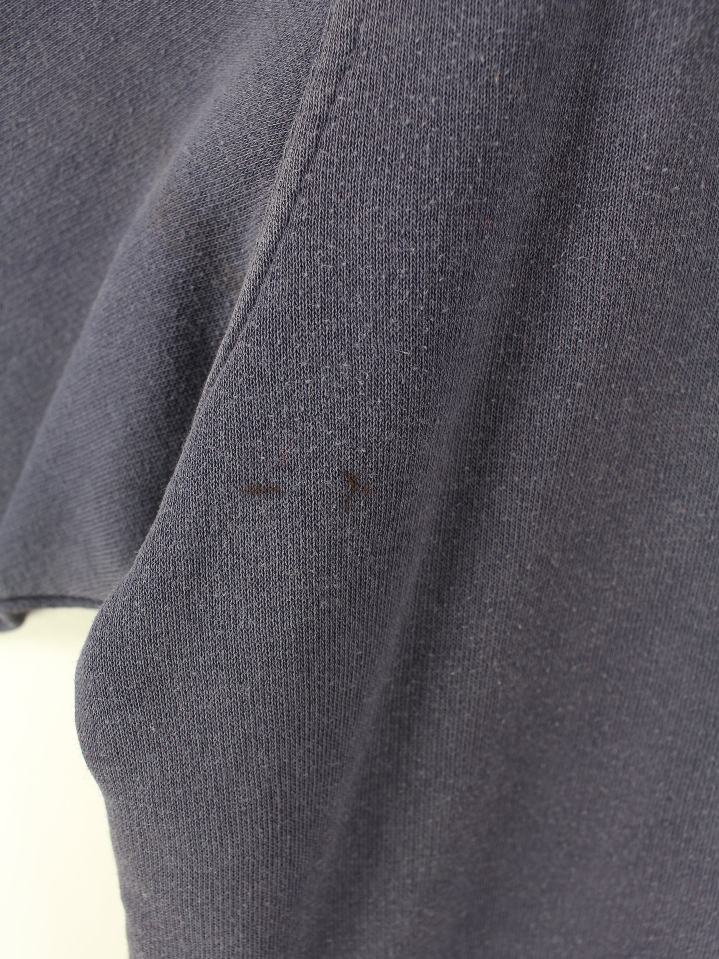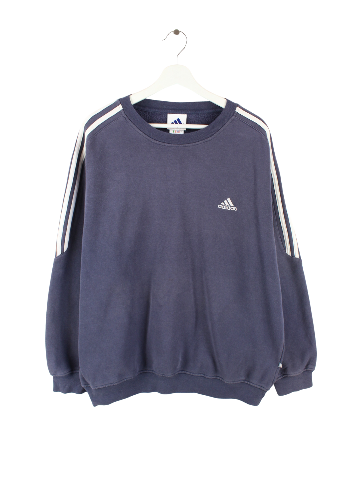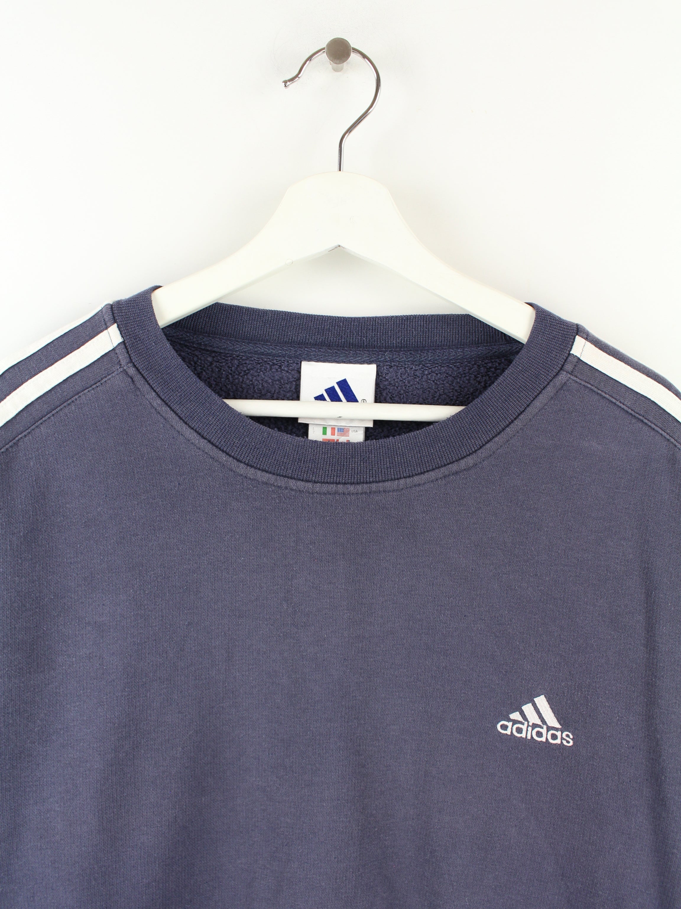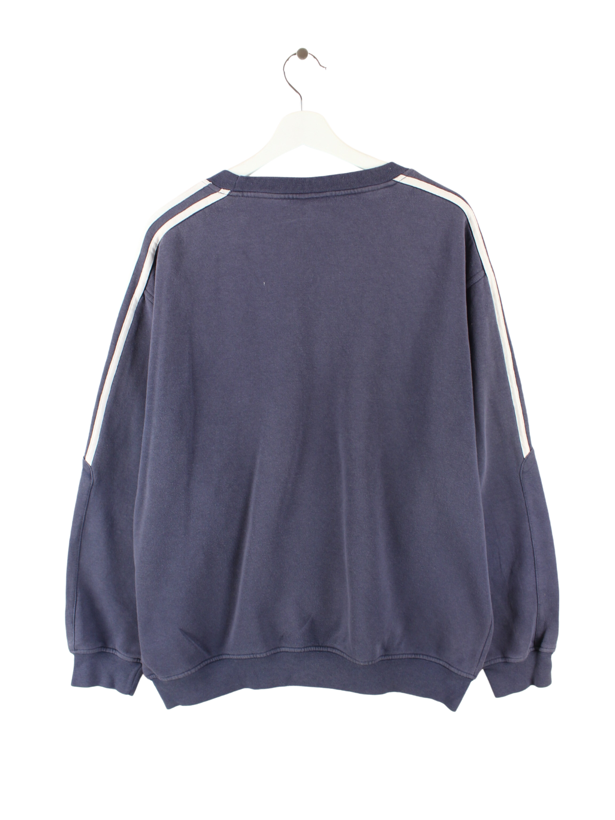 Pull basique Adidas vintage bleu des années 90 avec les trois bandes typiques sur les manches.