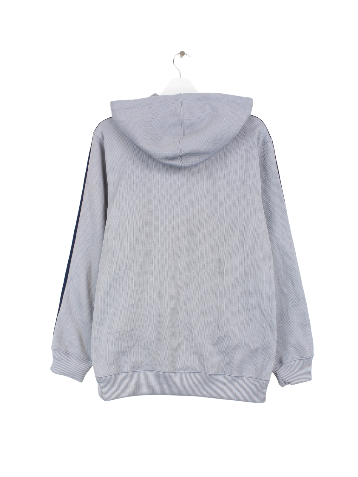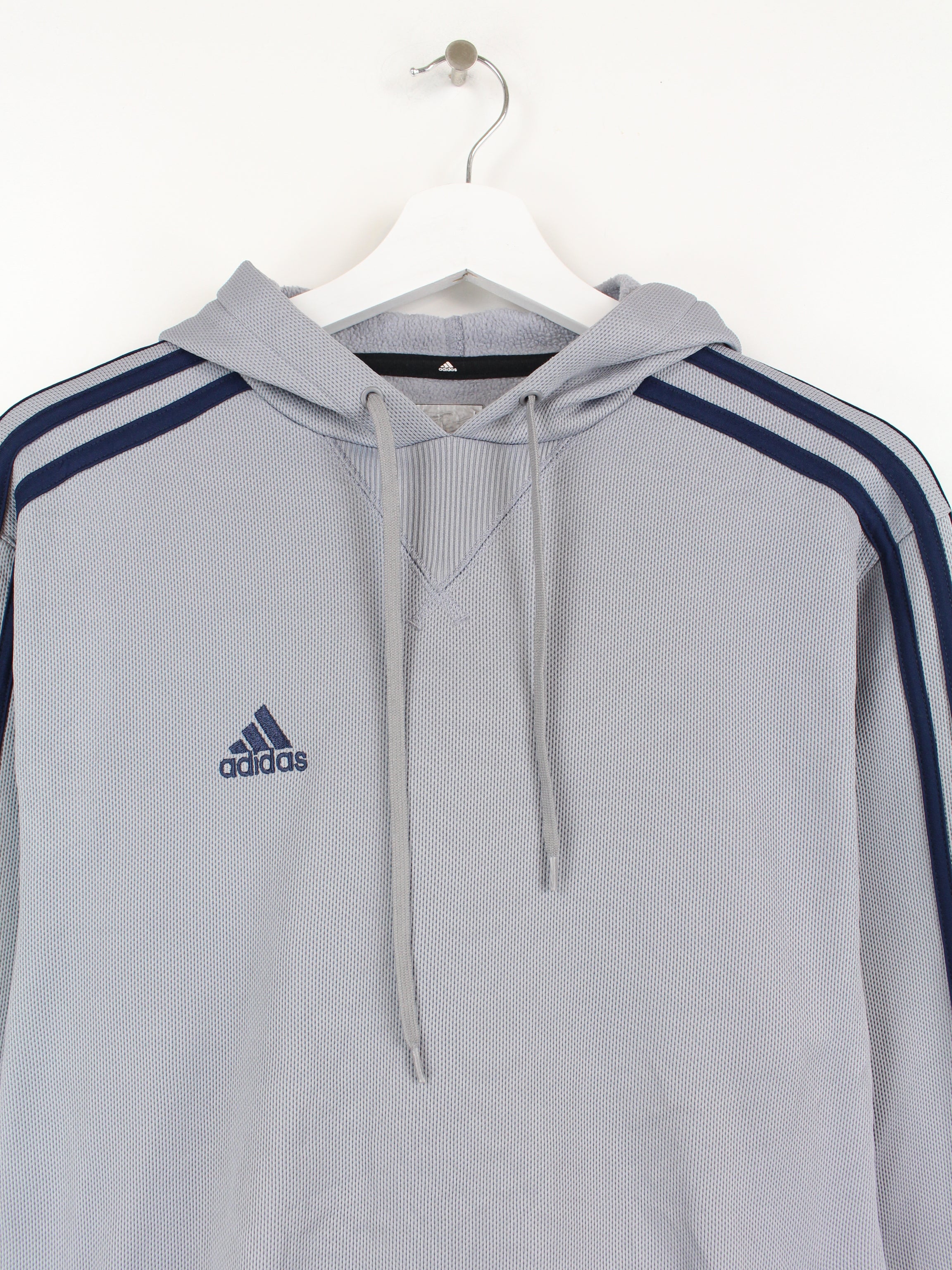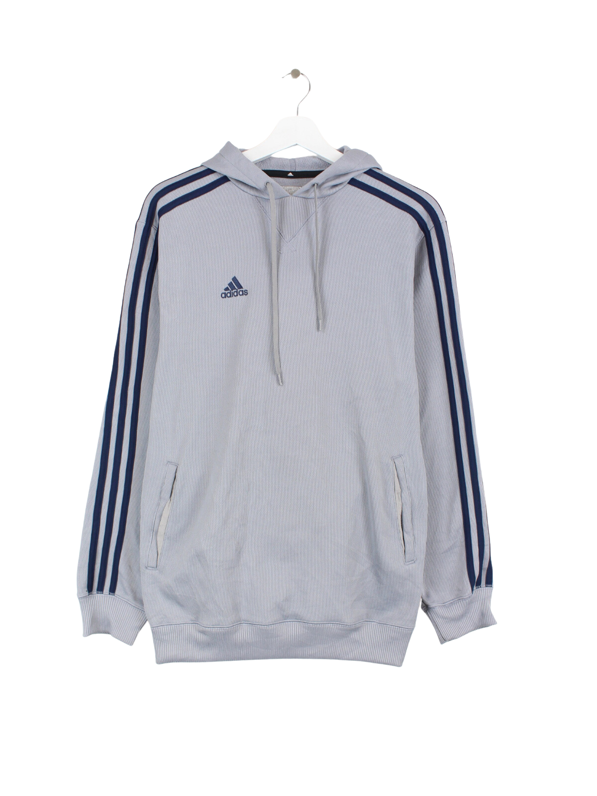 Sweat à capuche Adidas gris avec rayures noires sur les manches.