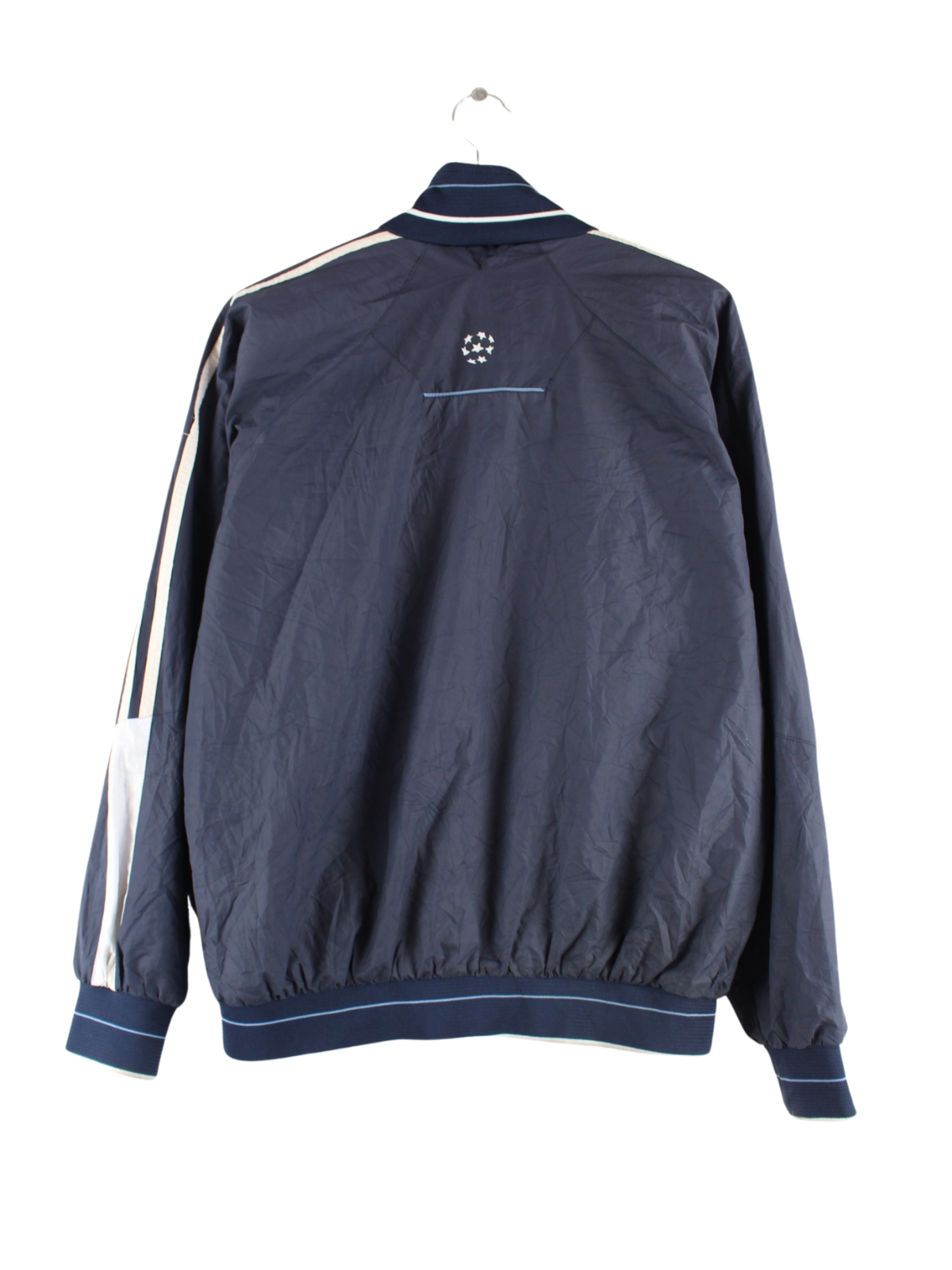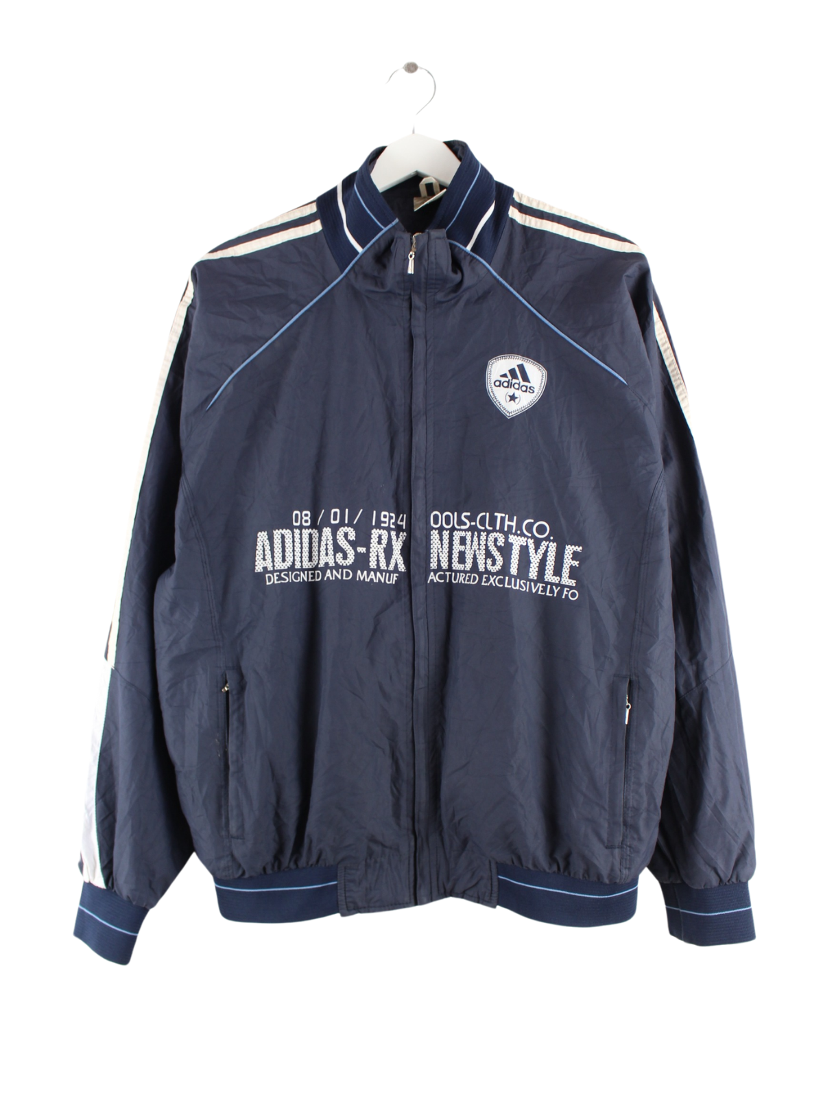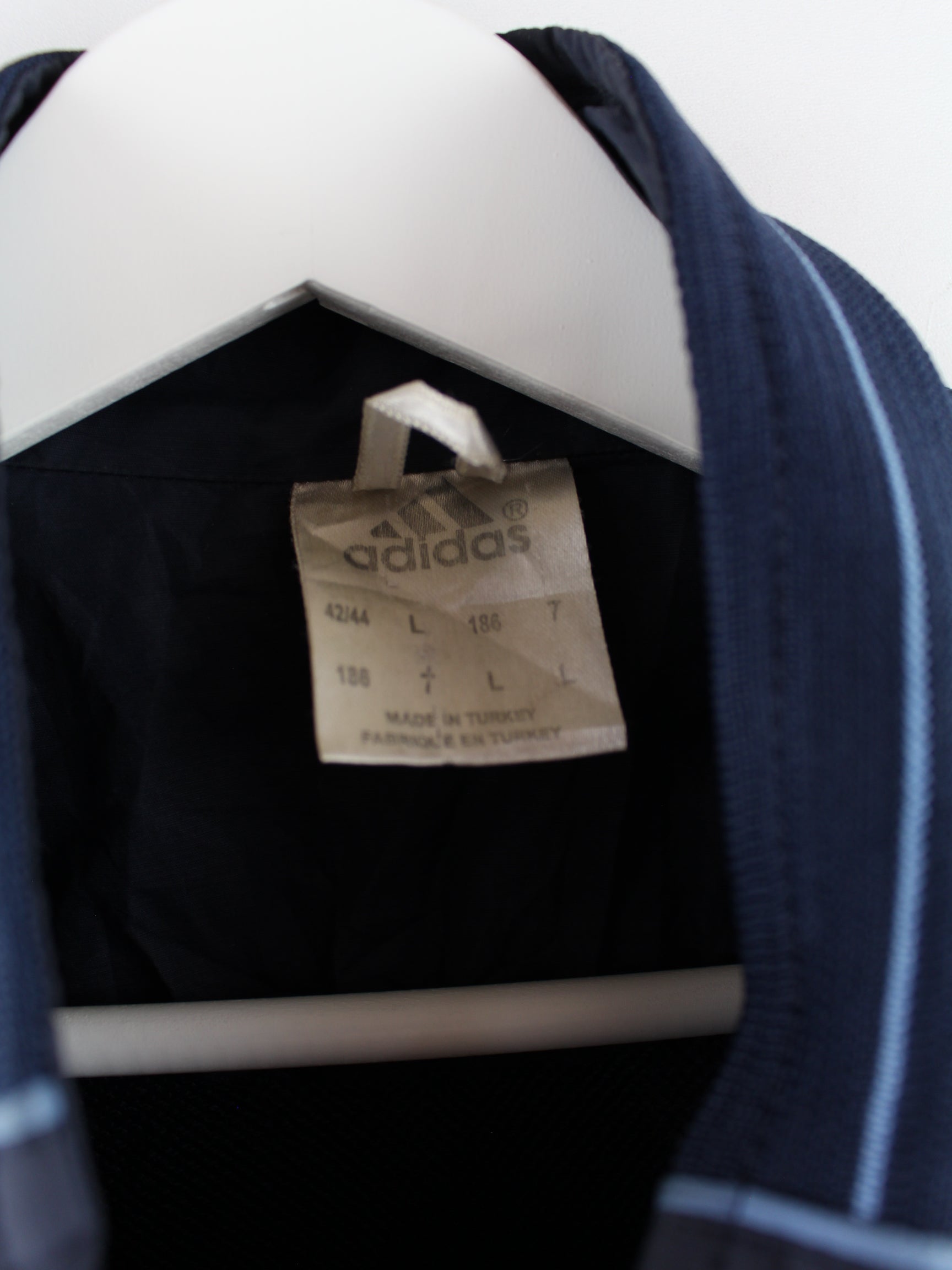 Leichte Jacke vom Label Adidas in Größe M aus Anfang der 2000'er. Sie ist aus Synthetik hergestellt und in Blau bei uns zu bekommen.