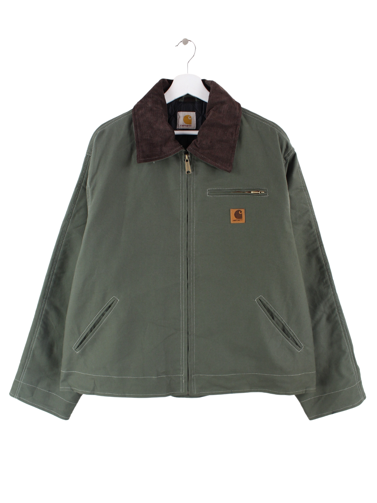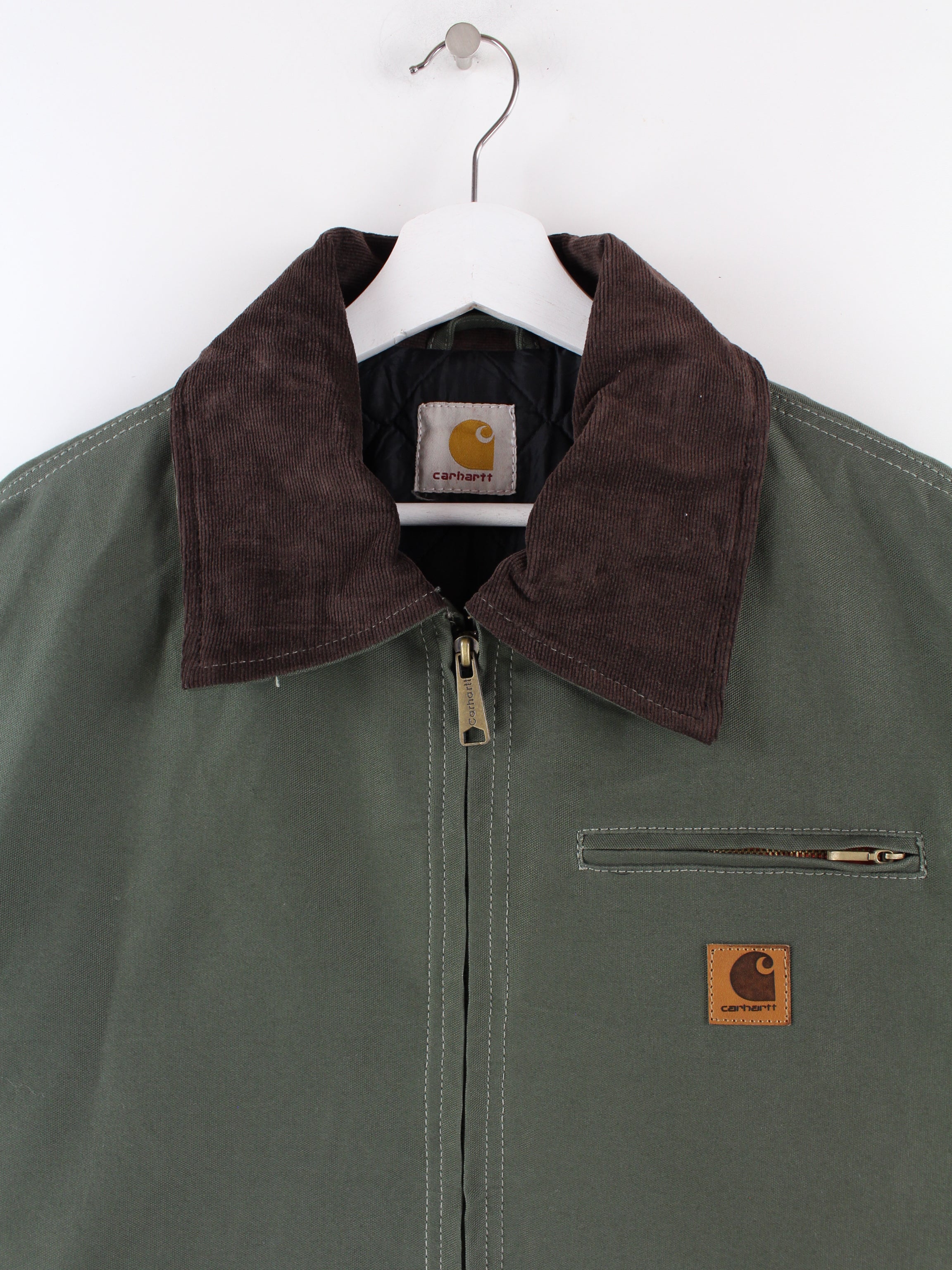 Veste verte Carhartt avec col en velours côtelé.
