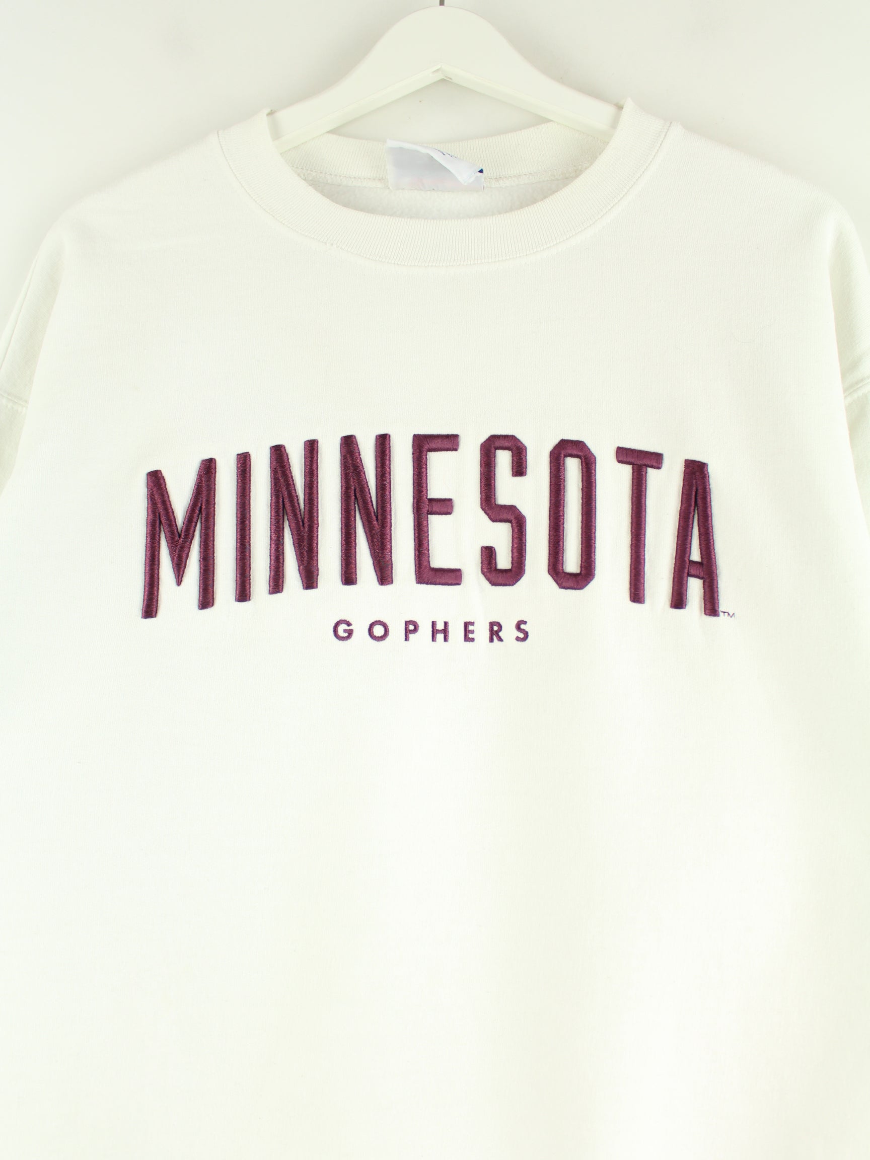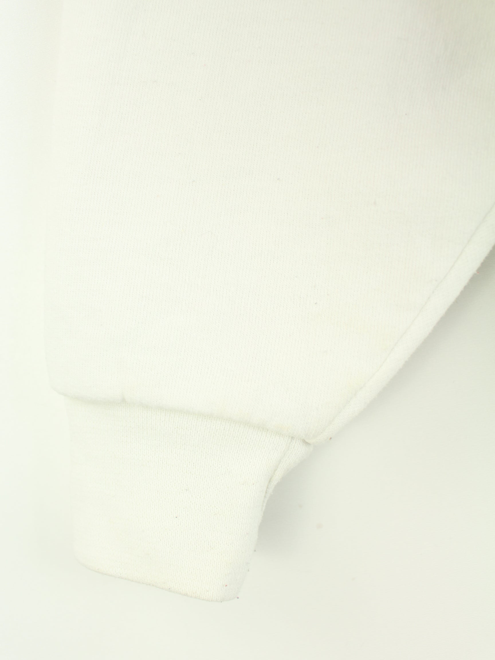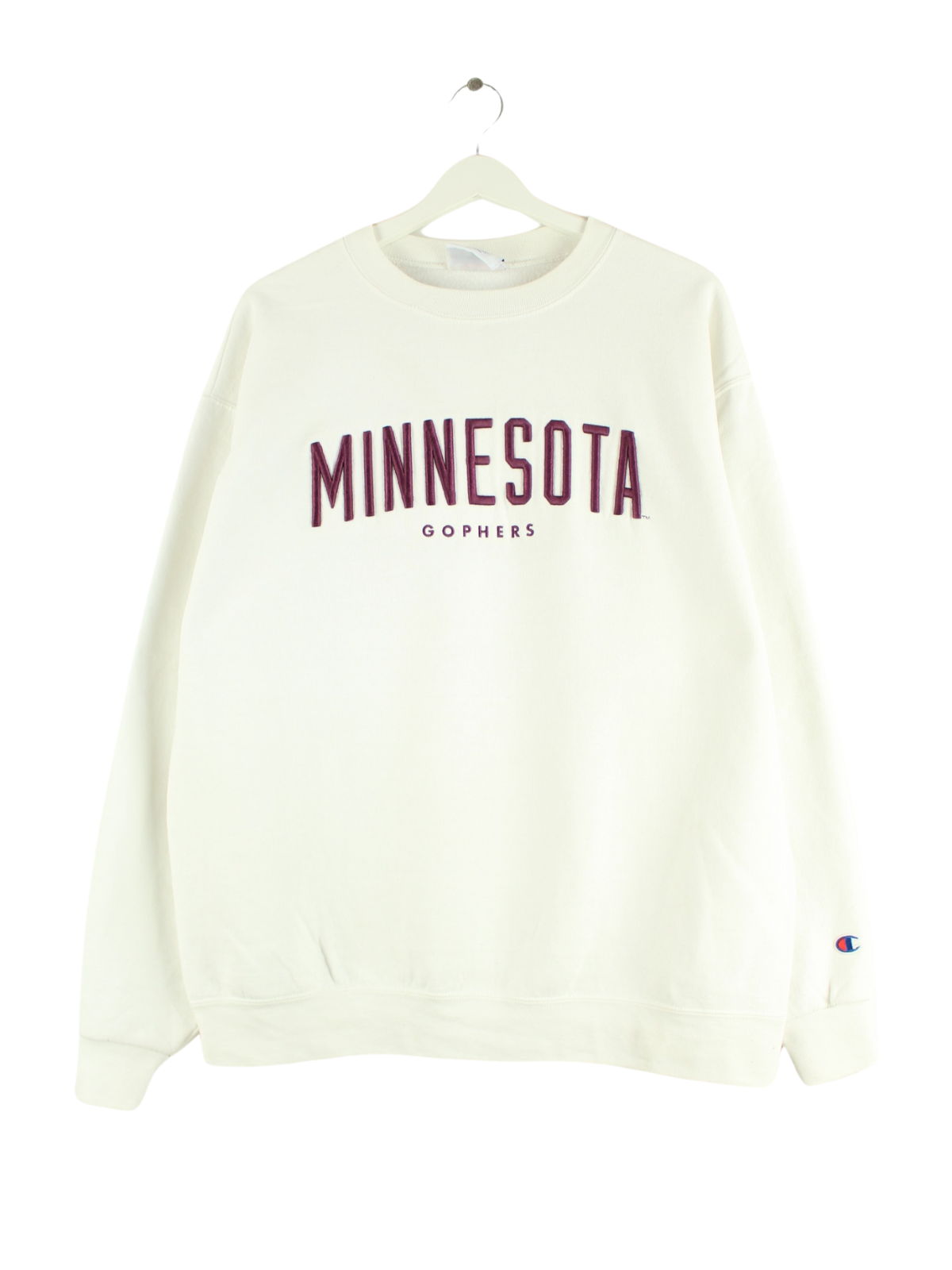 Weißer Sweater mit Stickereien vom Label Champion in Größe L. Er ist aus einer Baumwollmischung gemacht und in gutem Zustand bei uns zu bekommen.