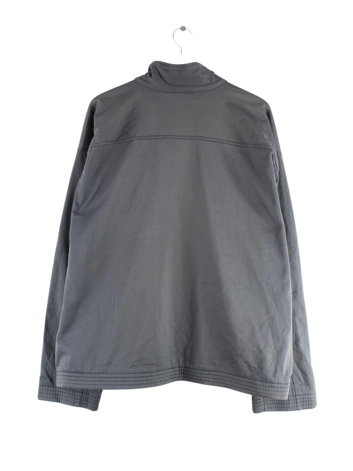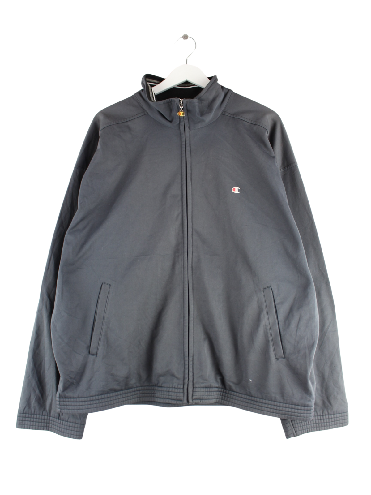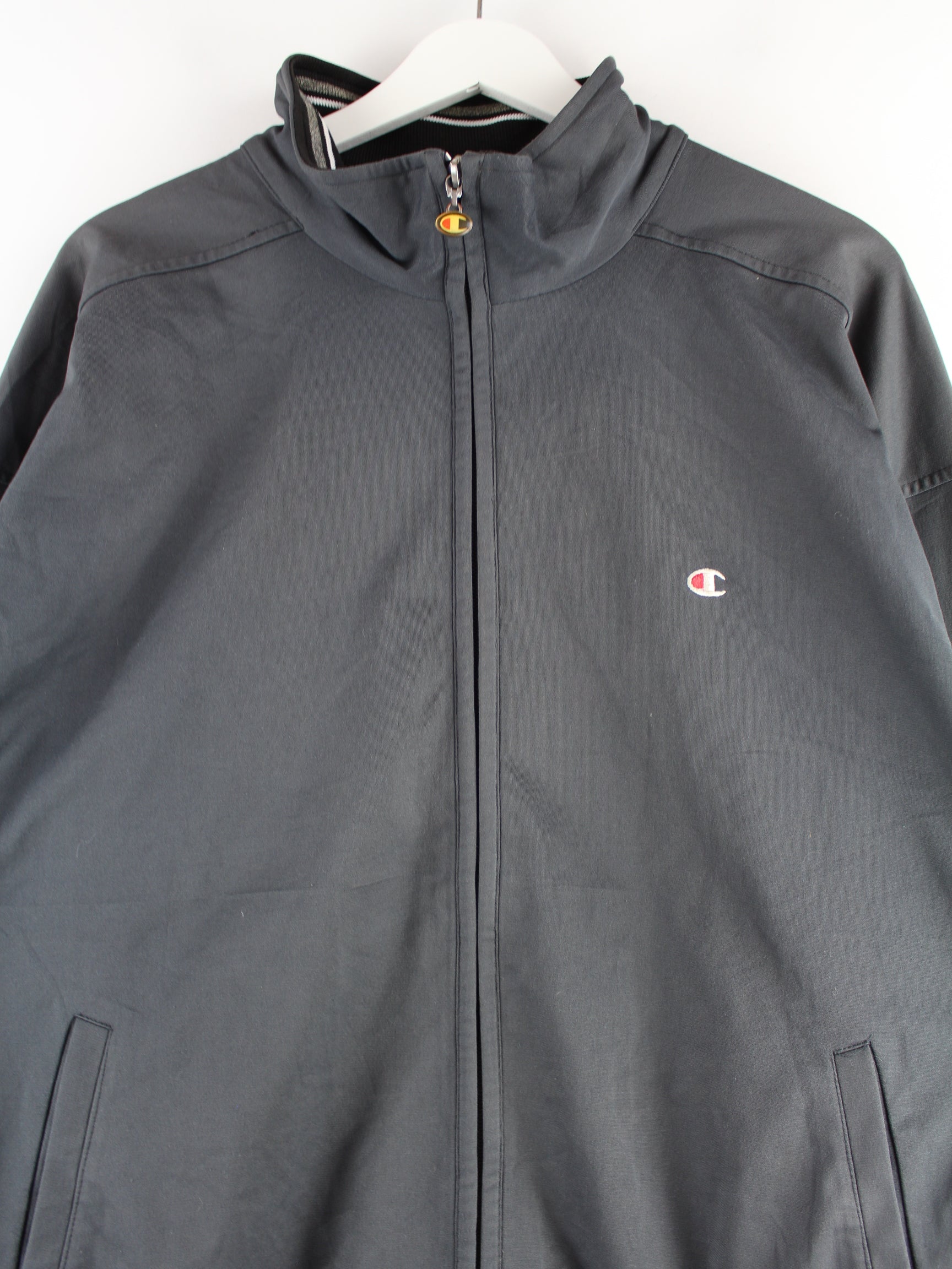 Graue Trainingsjacke aus dem Hause Champion aus Anfang der 2000'er in Größe XL. Sie ist aus Synthetik und in gutem Zustand bei uns vorrätig.