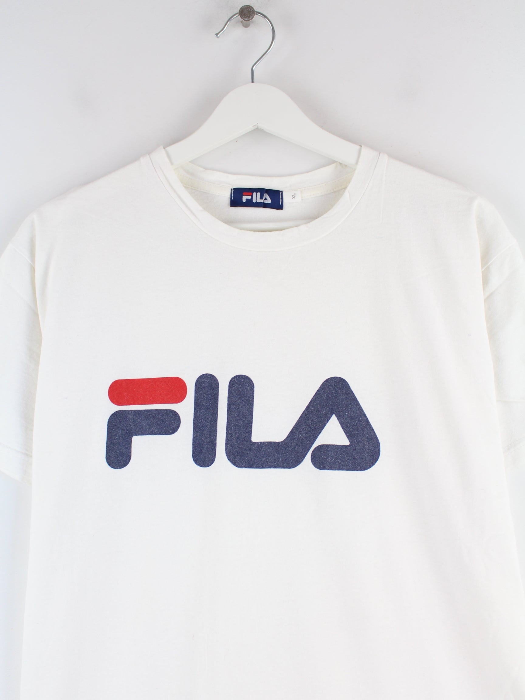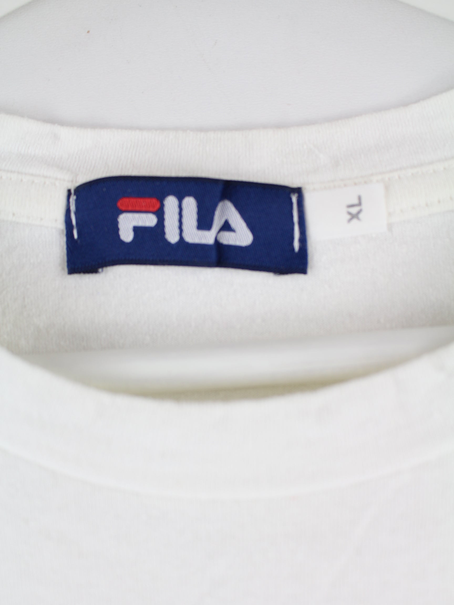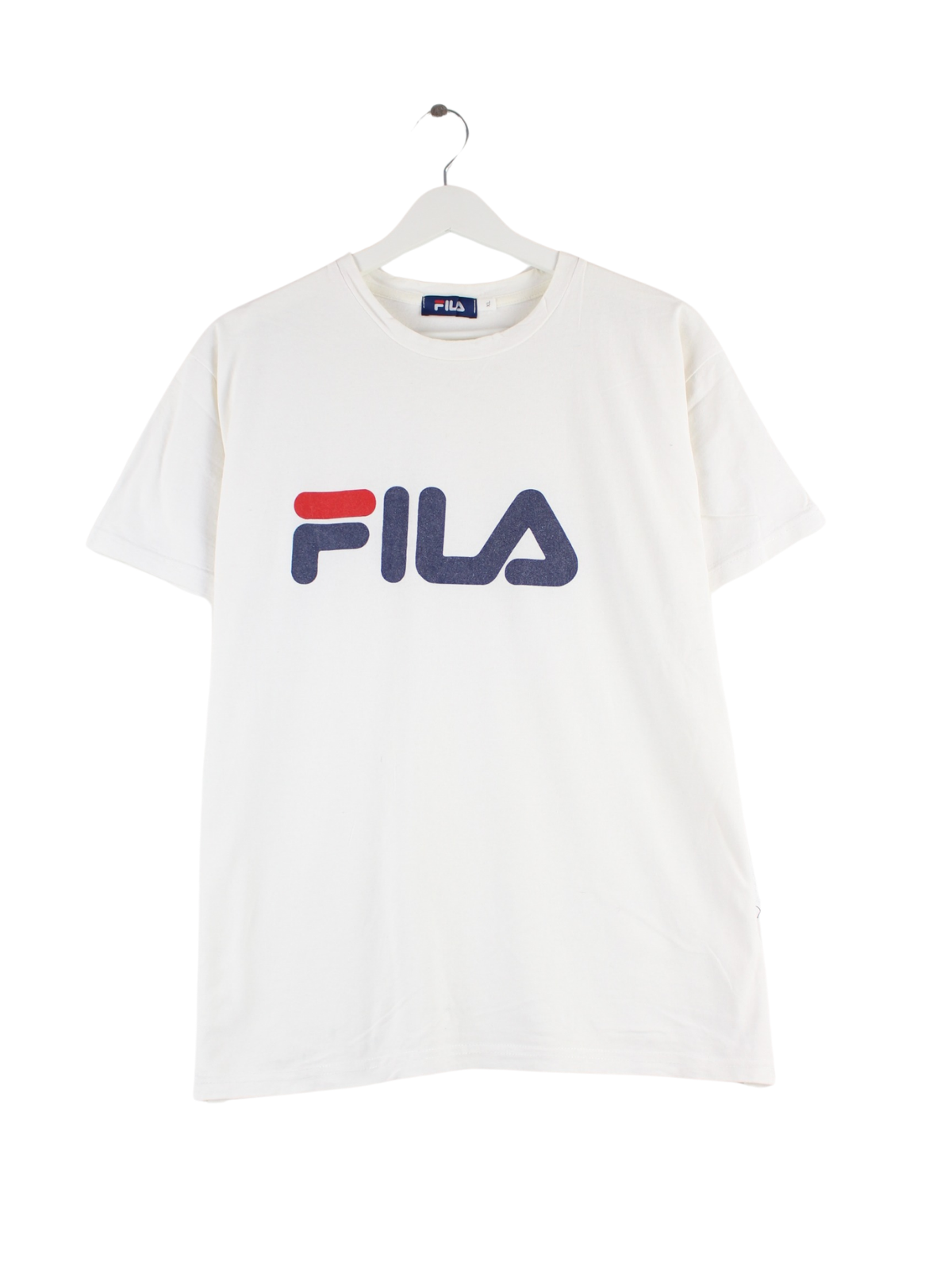 Weißes T-Shirt aus dem Hause Fila in Größe M. Es ist aus einer Baumwollmischung und in sehr gutem Zustand bei uns zu bekommen. Mit chiquem Print.
