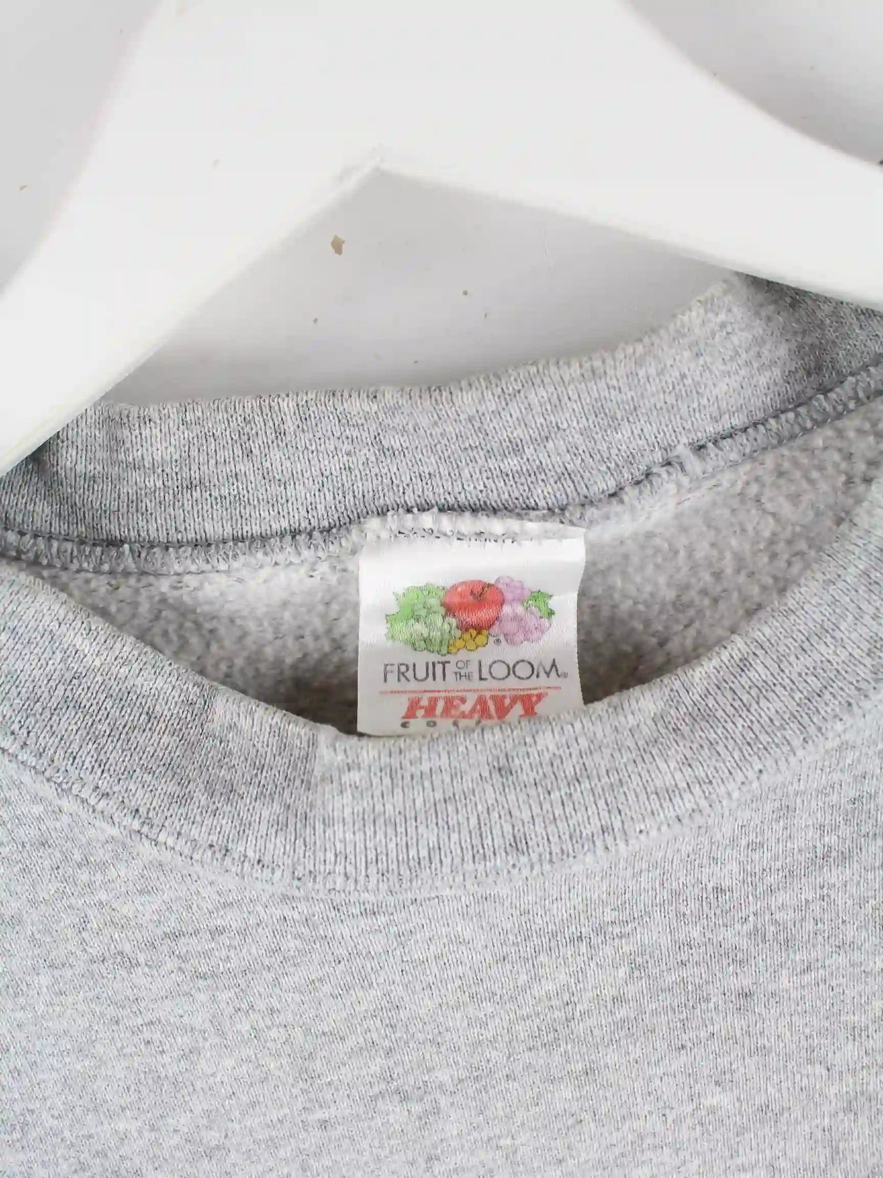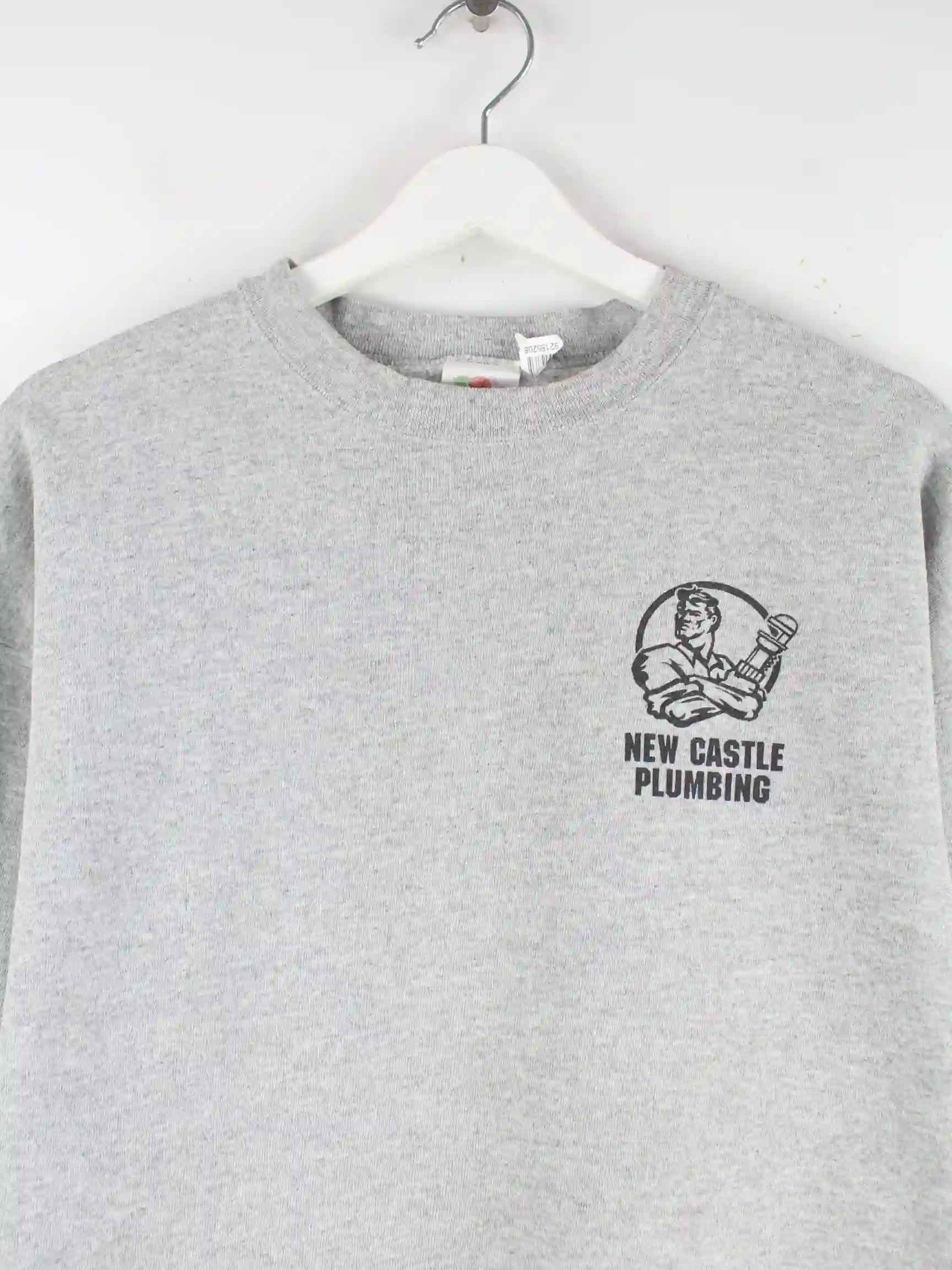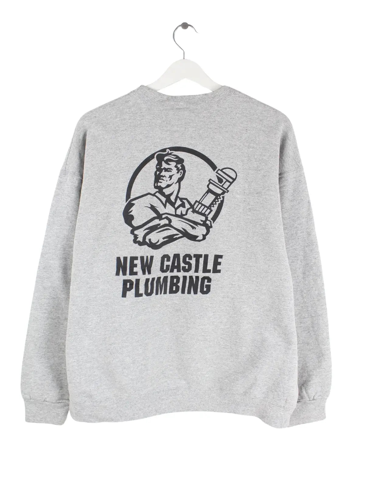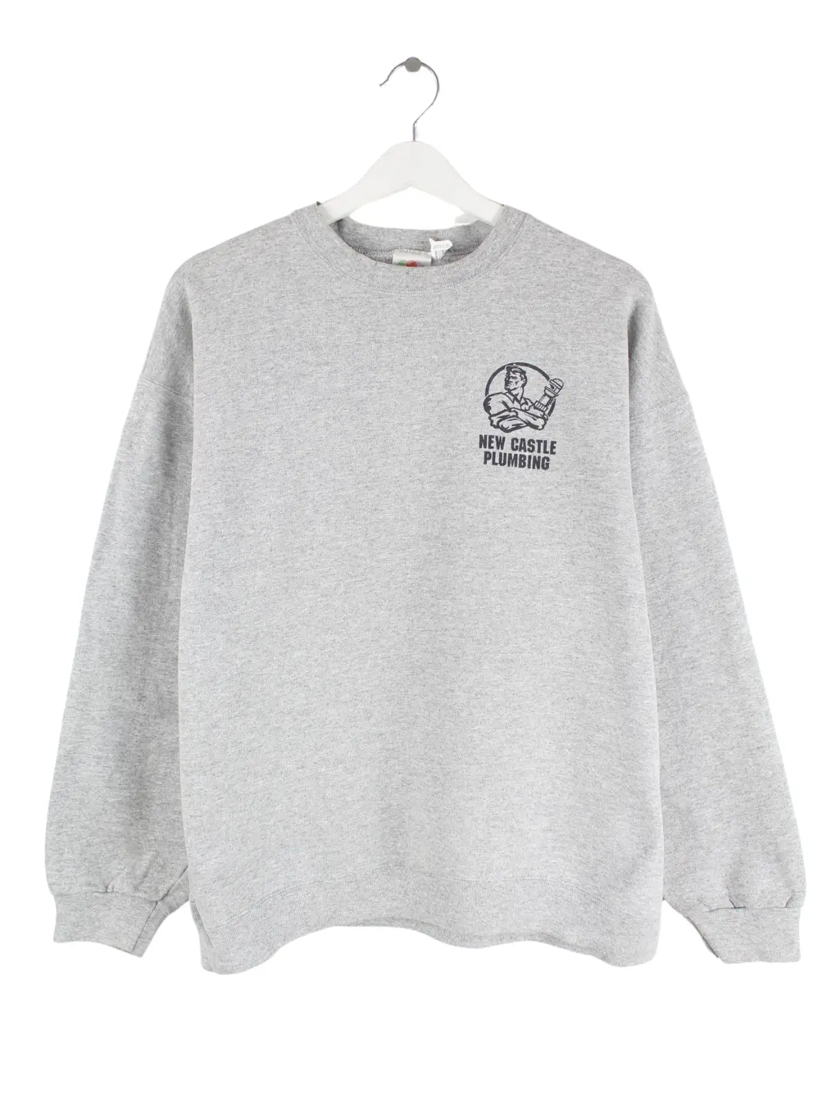Grauer Sweater vom Brand Fruit of the Loom in Größe M. Er ist aus einer Baumwollmischung hergestellt und in sehr gutem Zustand bei uns zu bekommen. Mit chiquem Plumbing Print.