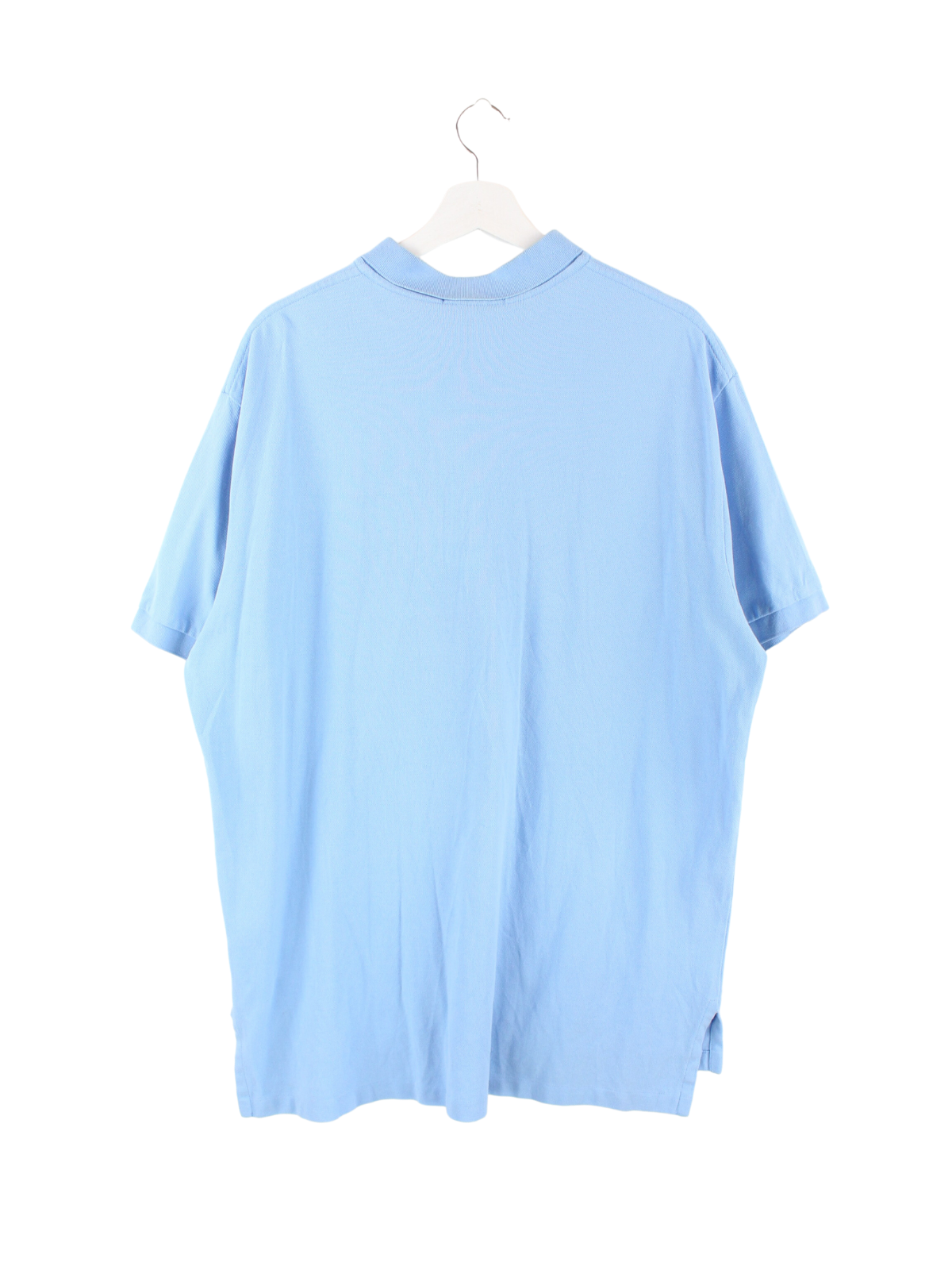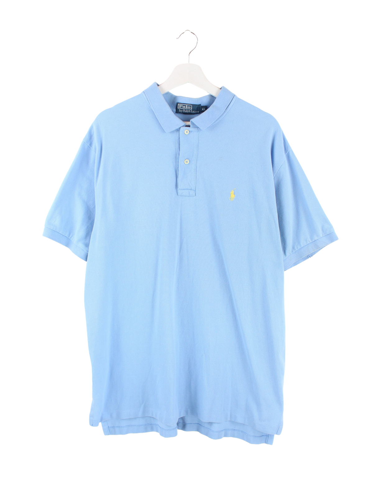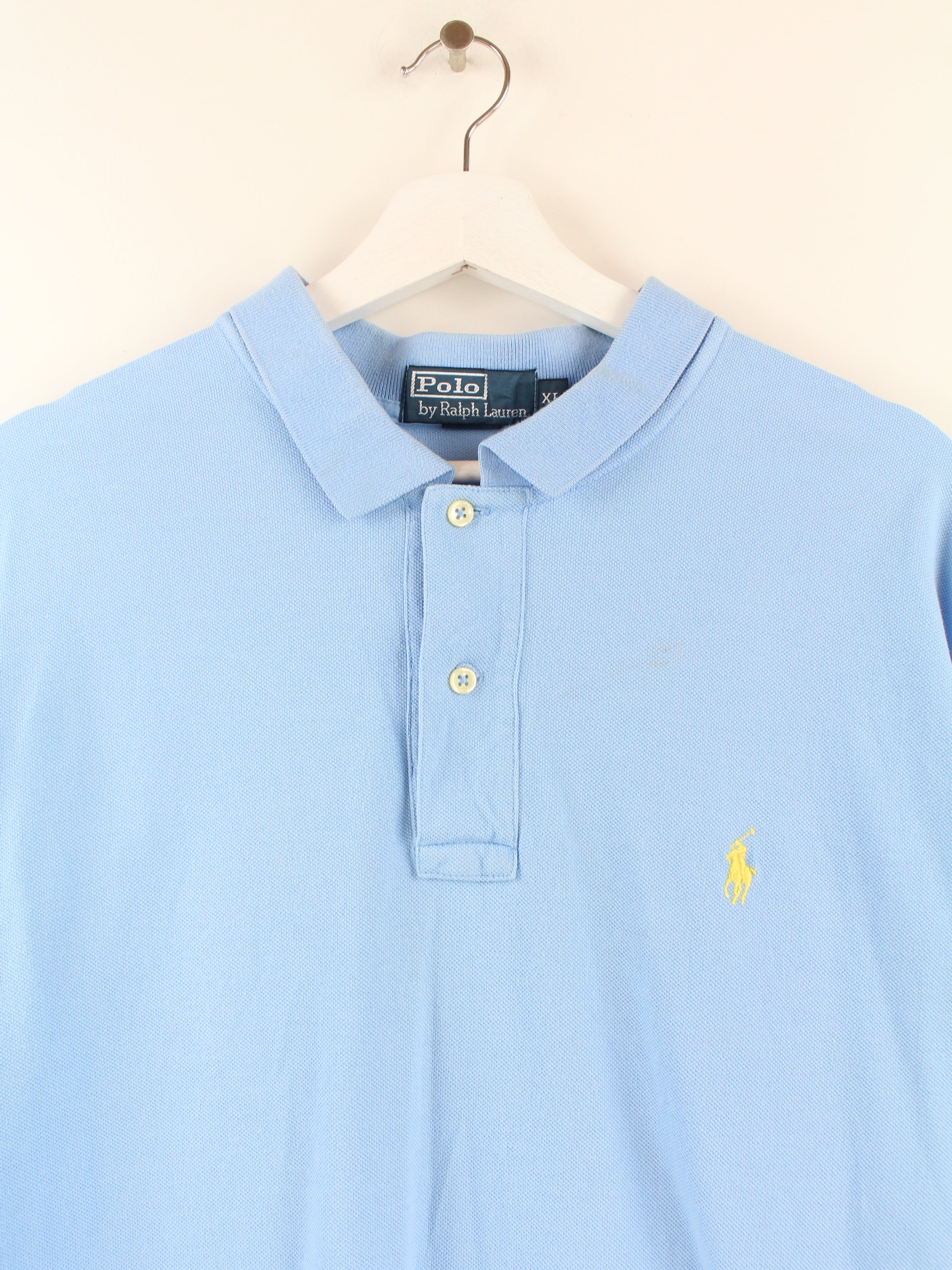 Blaues Polo der Marke Ralph Lauren mit gelbem Reiter.