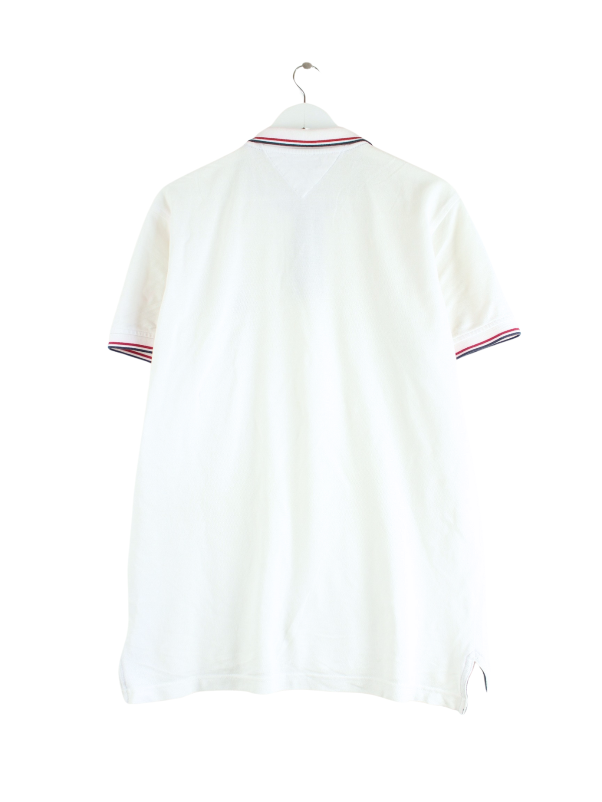 Weißes Poloshirt von Tommy Hilfiger in Größe L. Es ist aus Baumwolle gefertigt und in sehr gutem Zustand auf Lager.