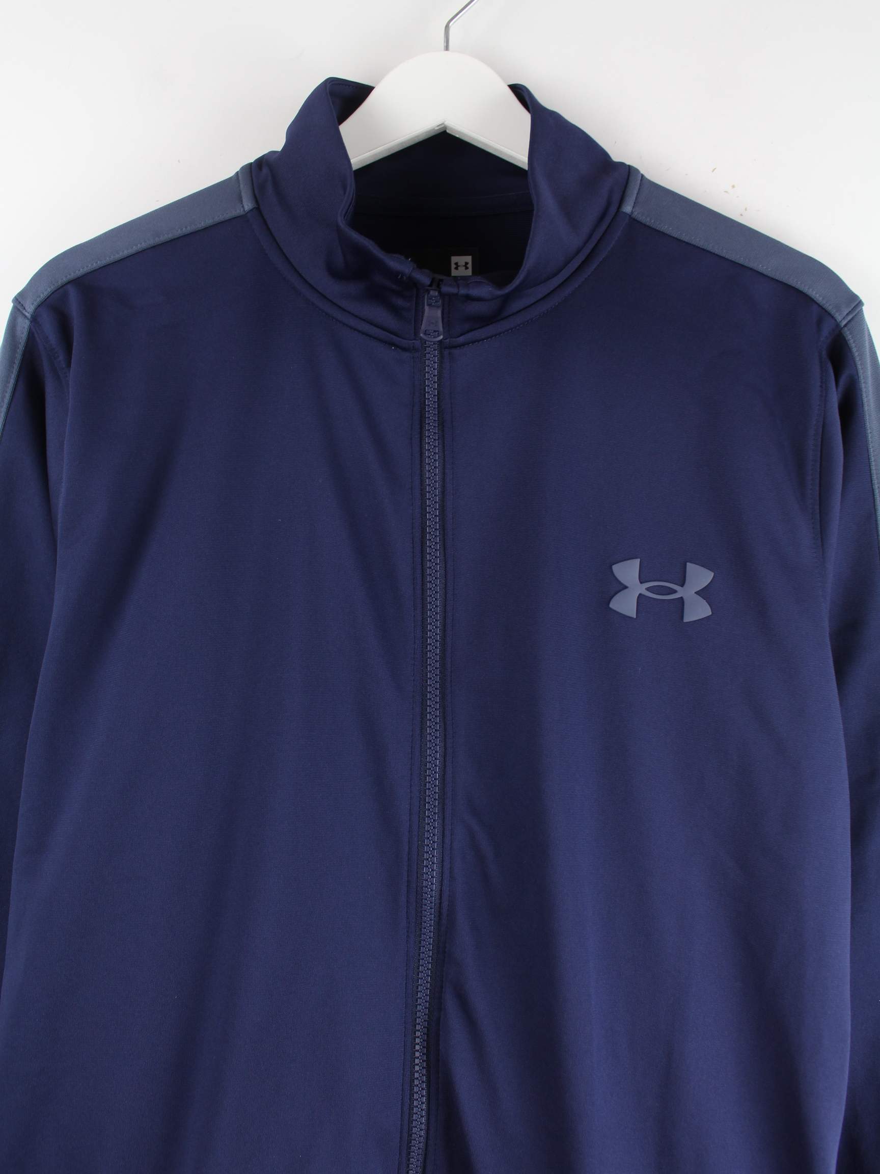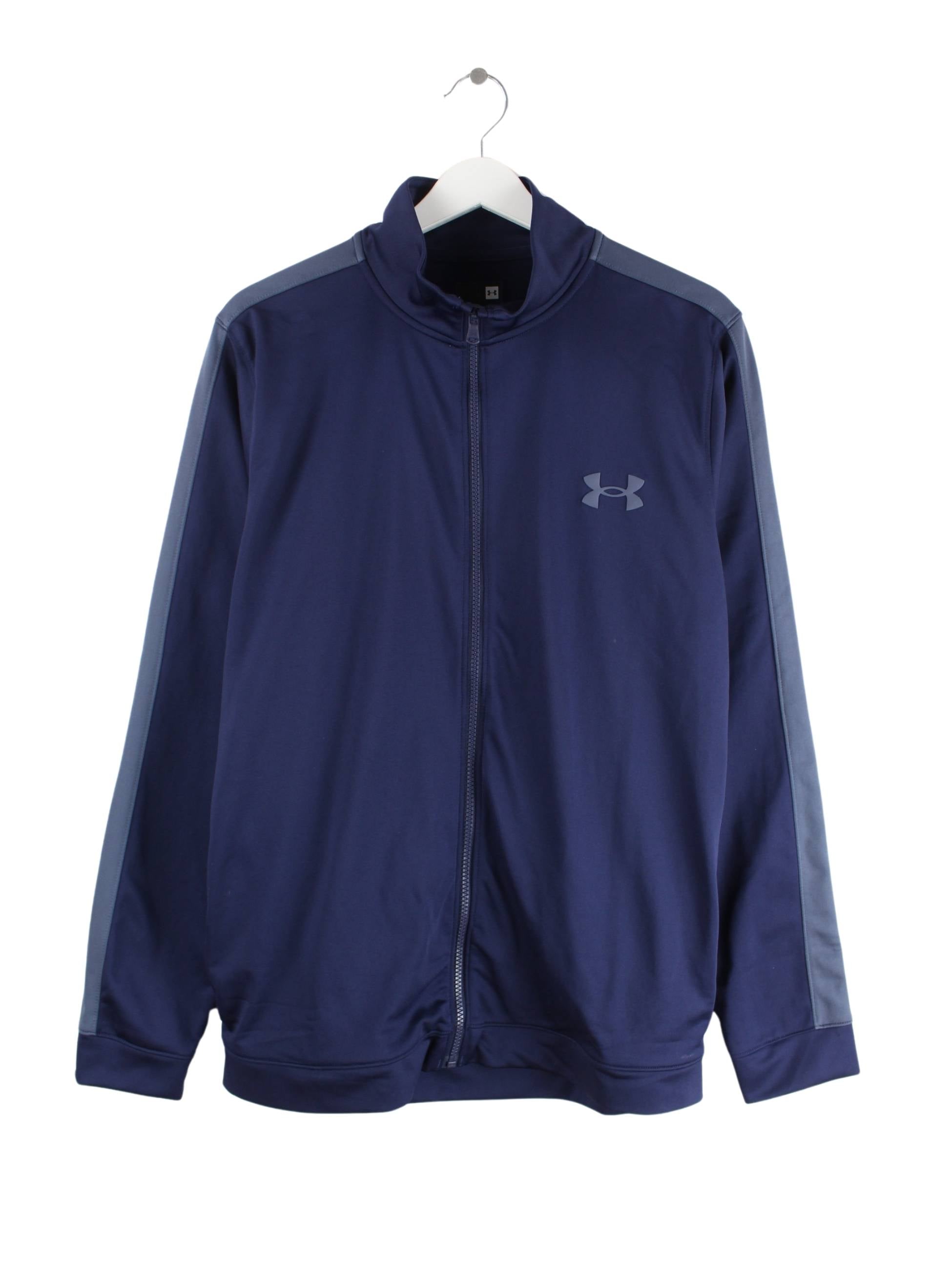 Blaue Trainingsjacke der Marke Under Armour in Größe L. Sie ist aus Synthetik und in sehr gutem Zustand bei uns vorrätig. Mit chiquem Print.