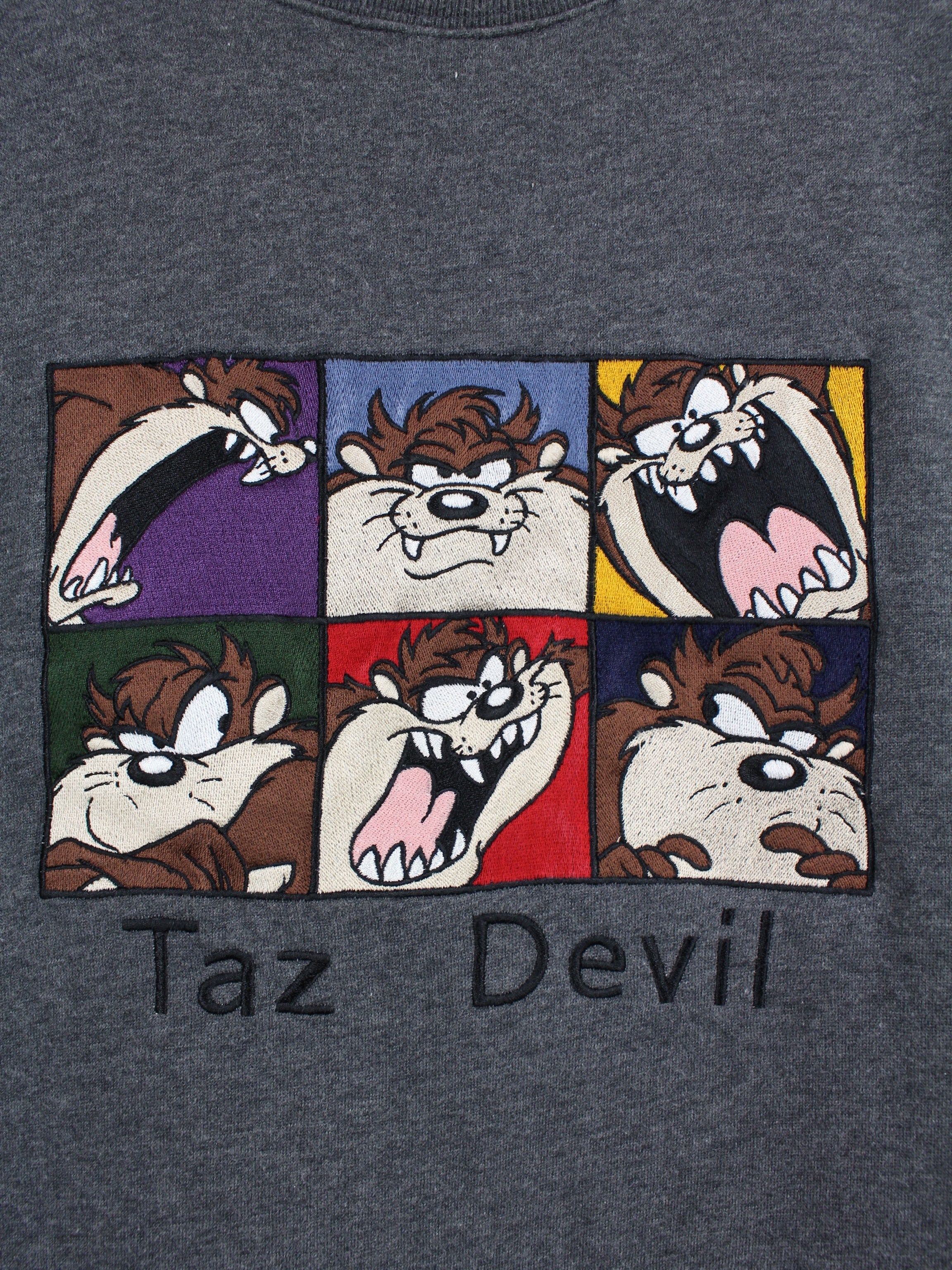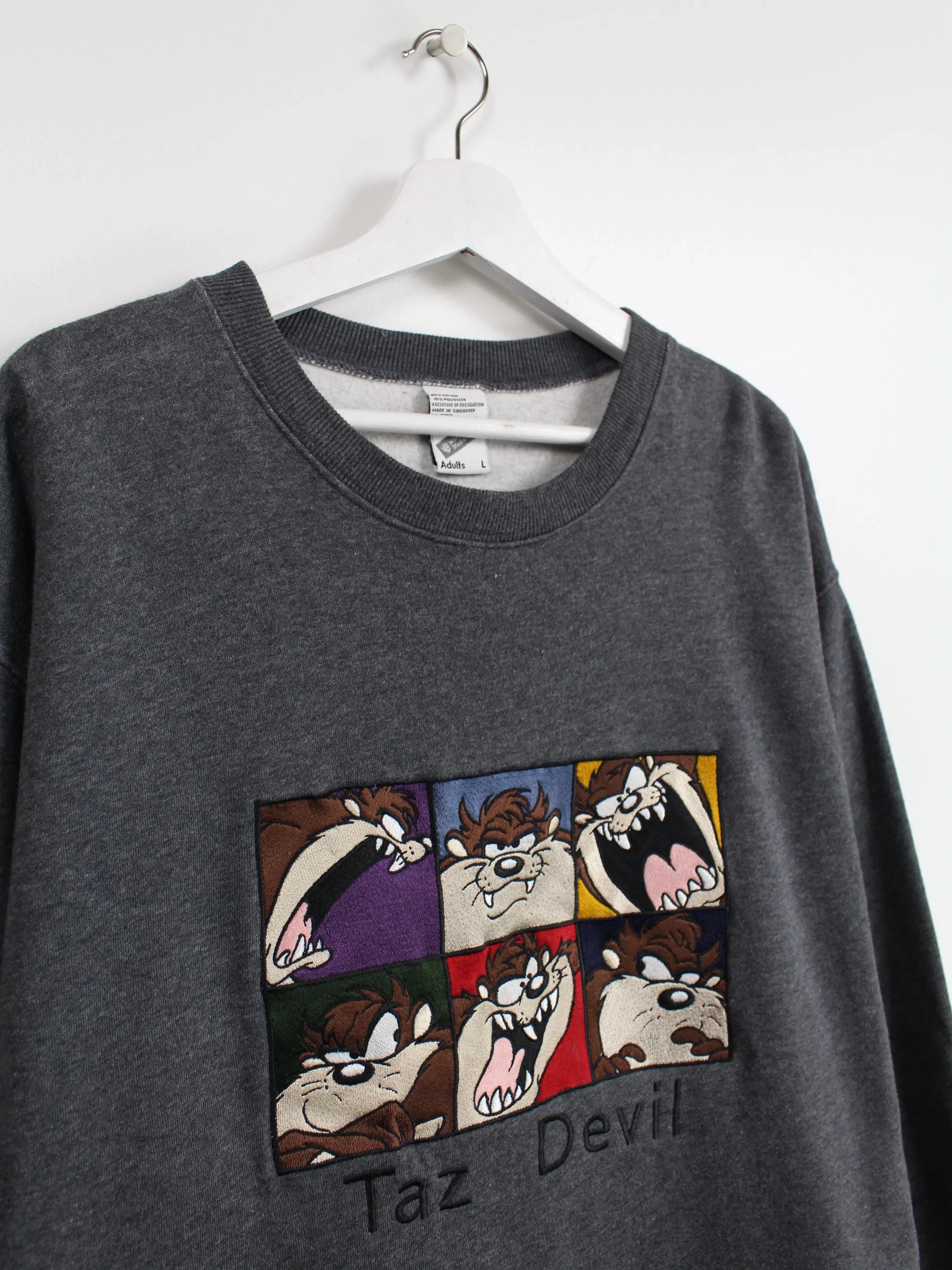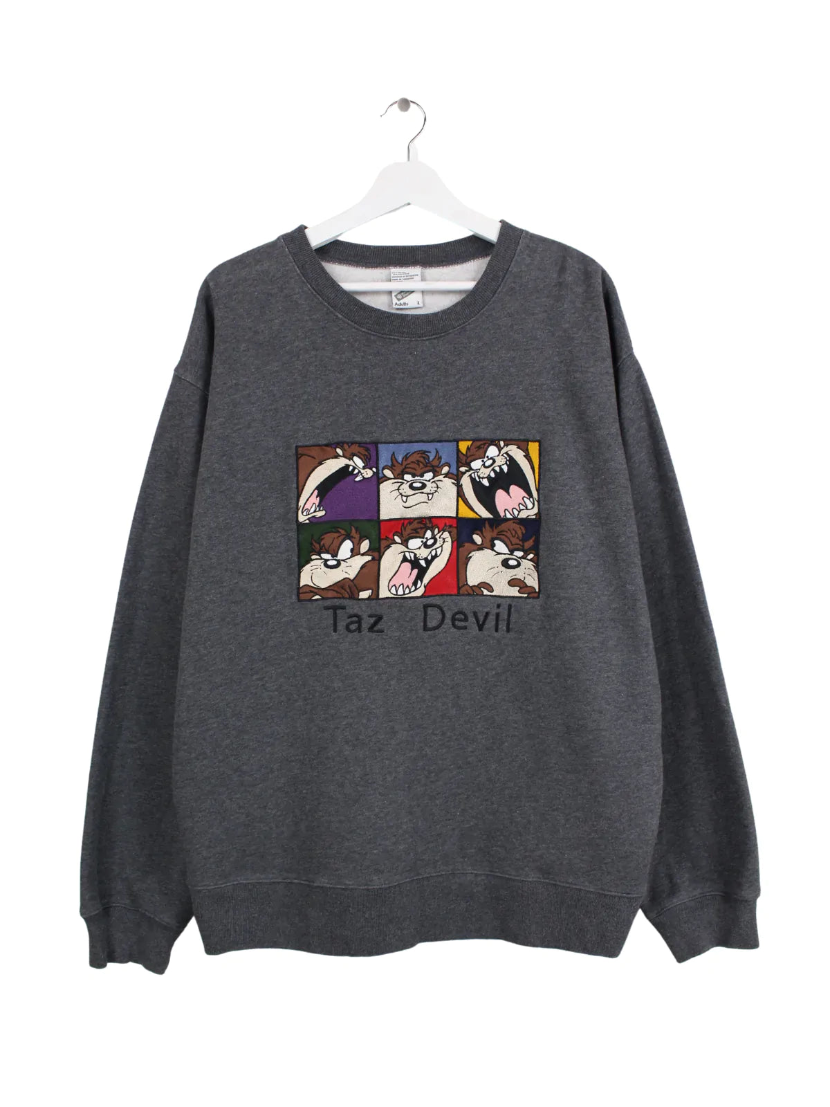 Pull gris Warner Bros avec motif brodé du diable de Tasmanie de la série Looney Tunes.