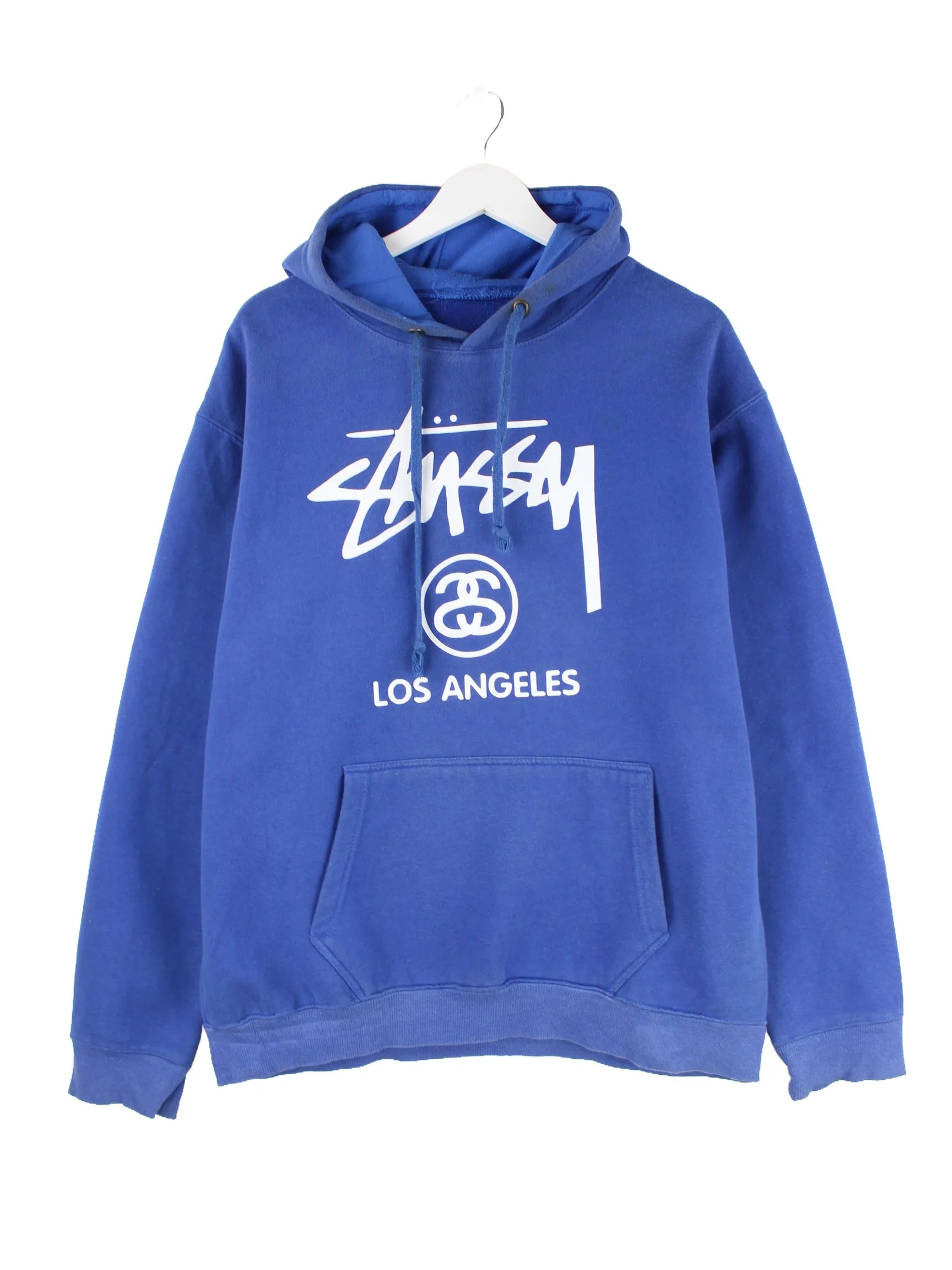 Hoodie des Labels Stussy in Größe L. Er ist aus einer Baumwollmischung gemacht und in Blau bei uns zu bekommen. Mit seltenem Print.