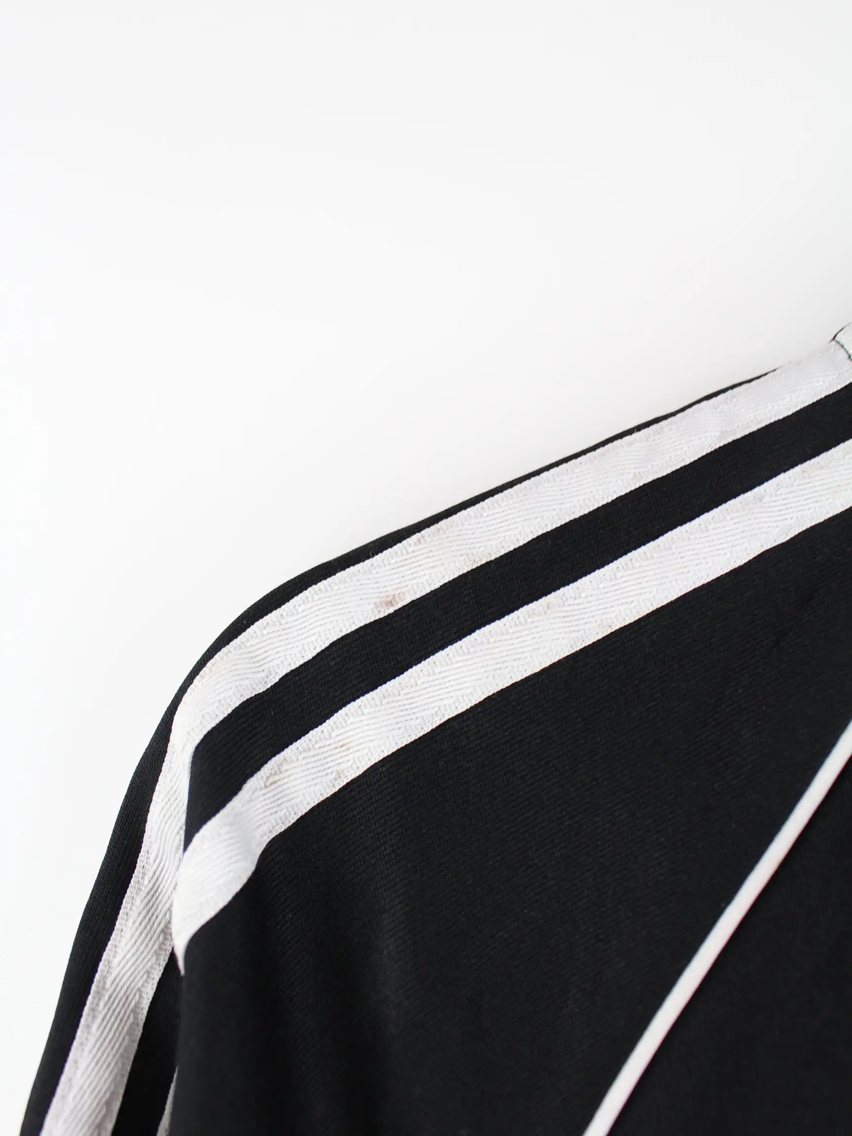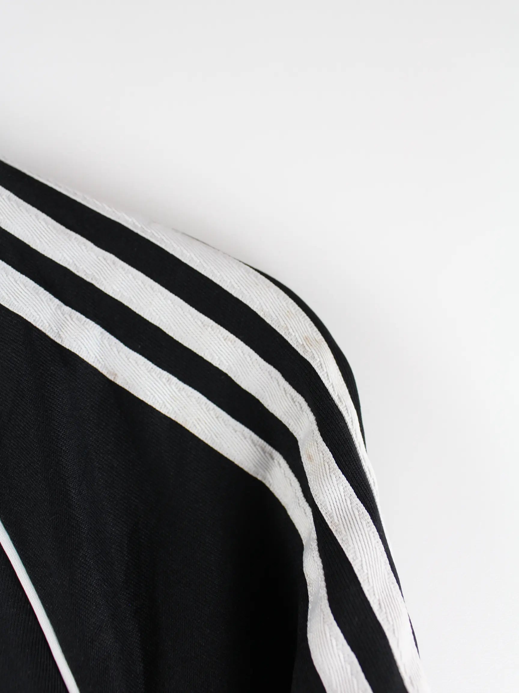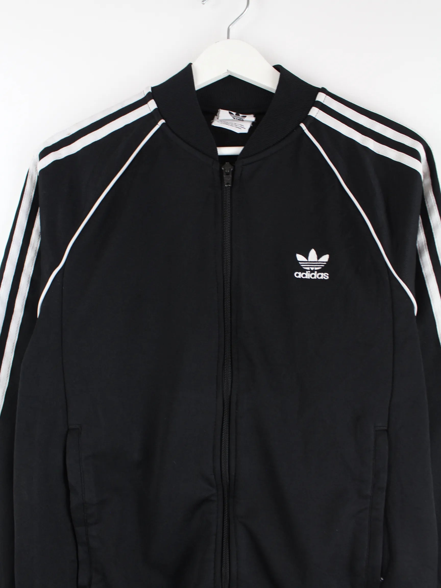 Schwarze 3-Stripes Trainingsjacke von Adidas in Größe M. Sie ist aus Synthetik produziert und in sehr gutem Zustand zu bekommen.