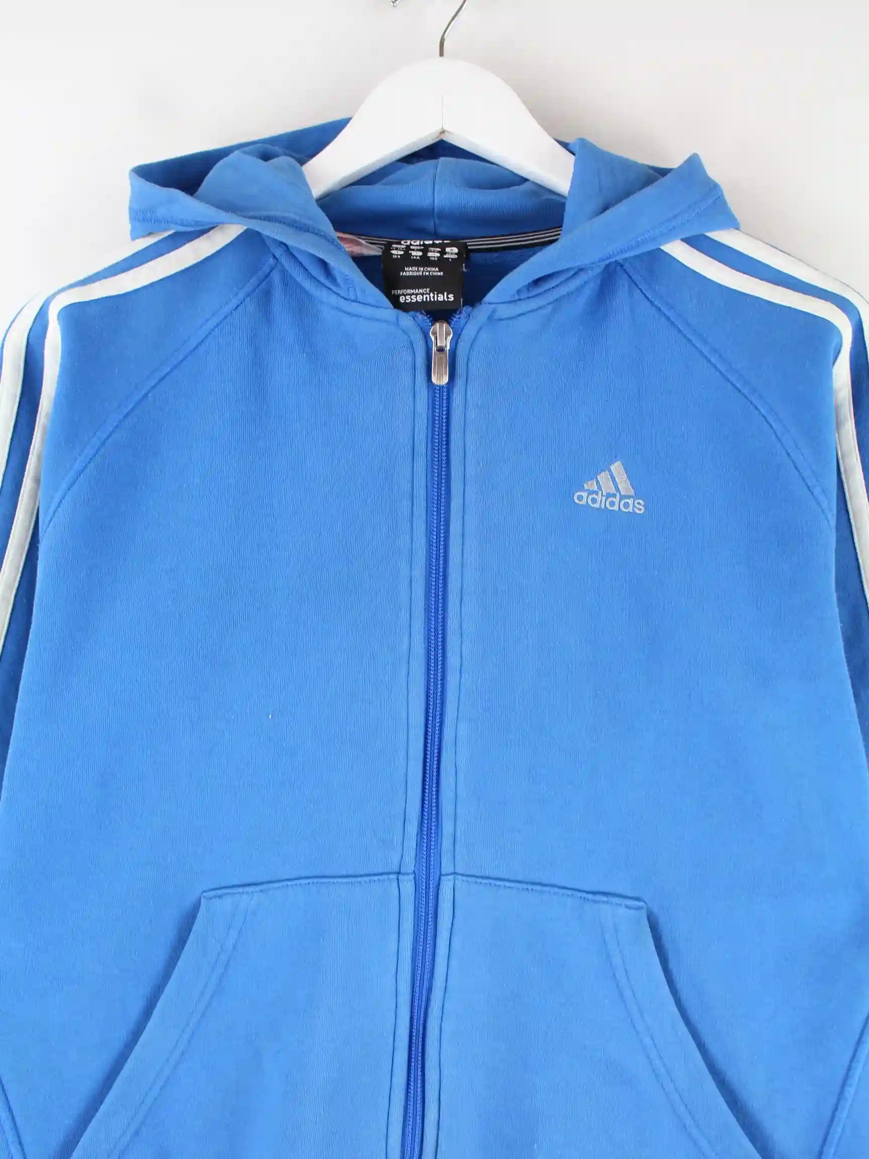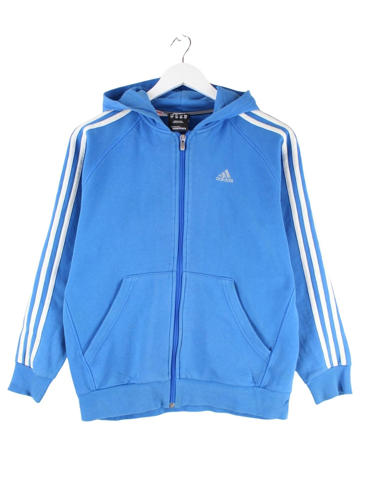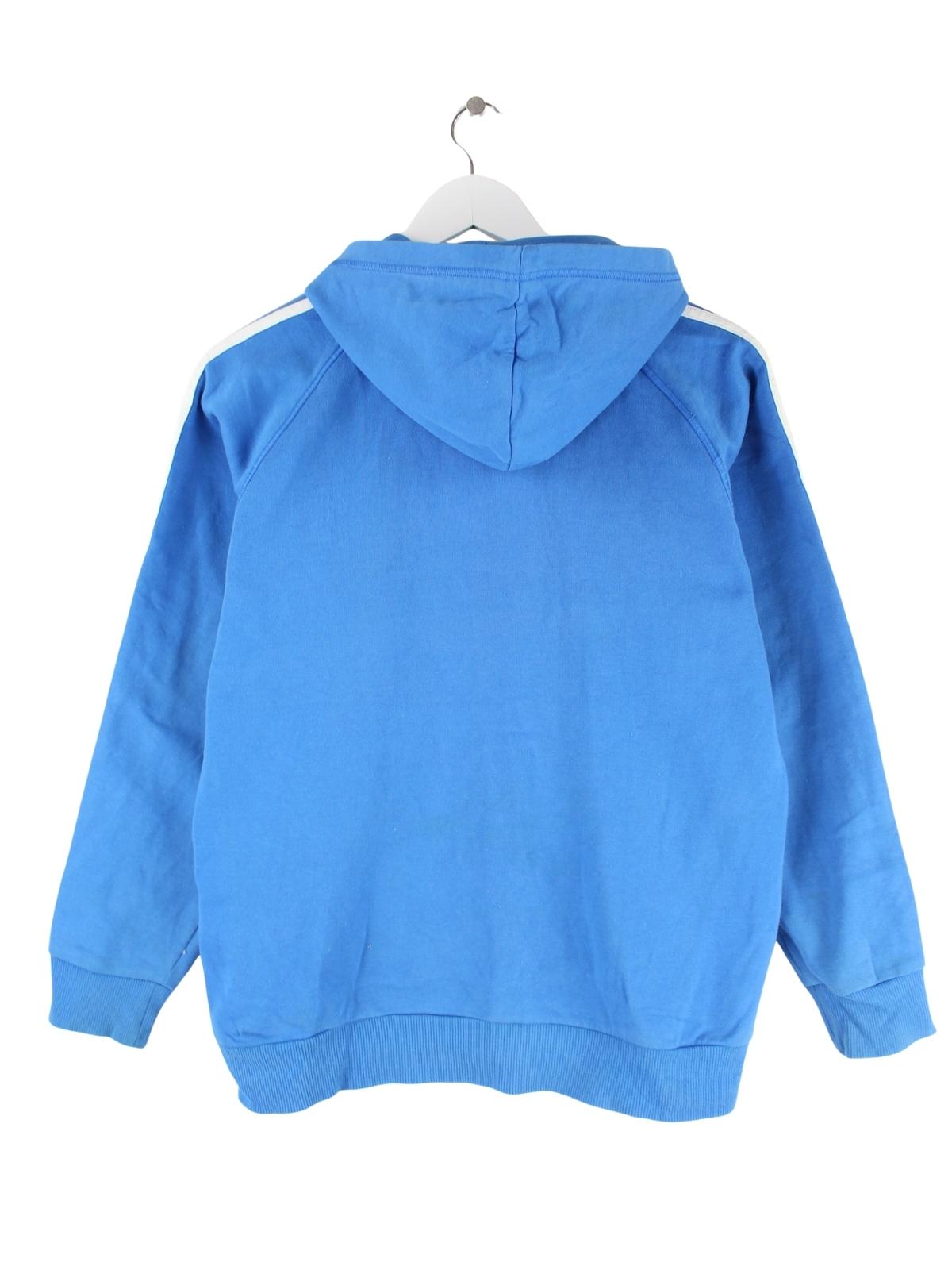 Hoodie des Labels Adidas mit Zip in Größe S. Er ist aus einer Baumwollmischung angefertigt und in Blau zu haben.
