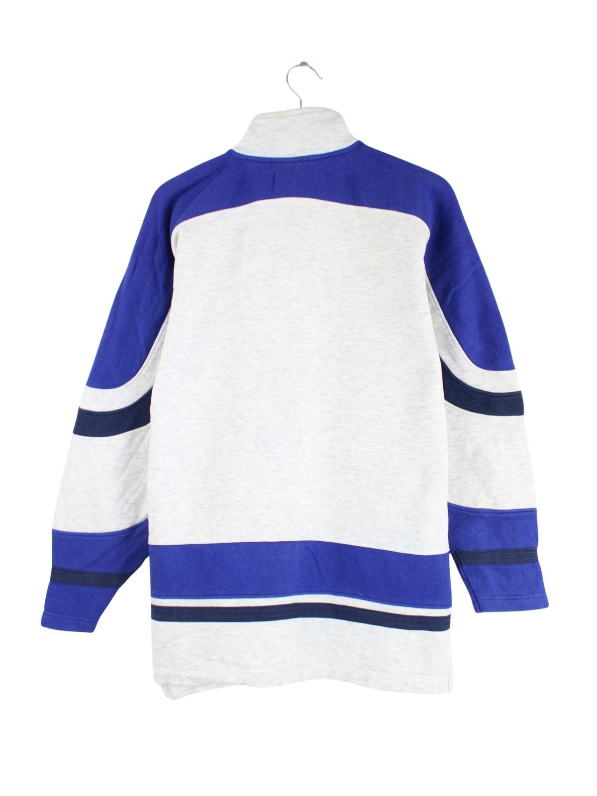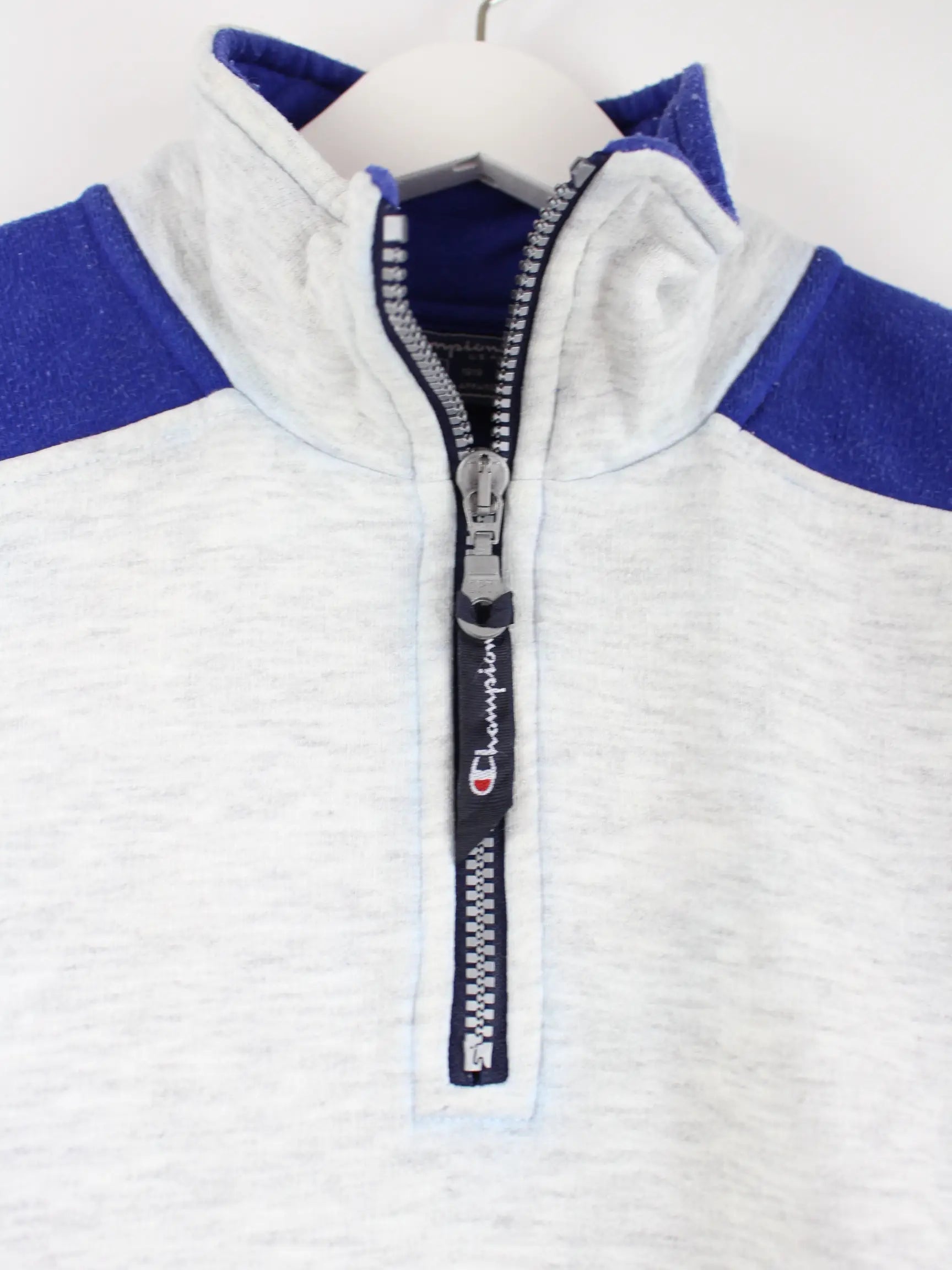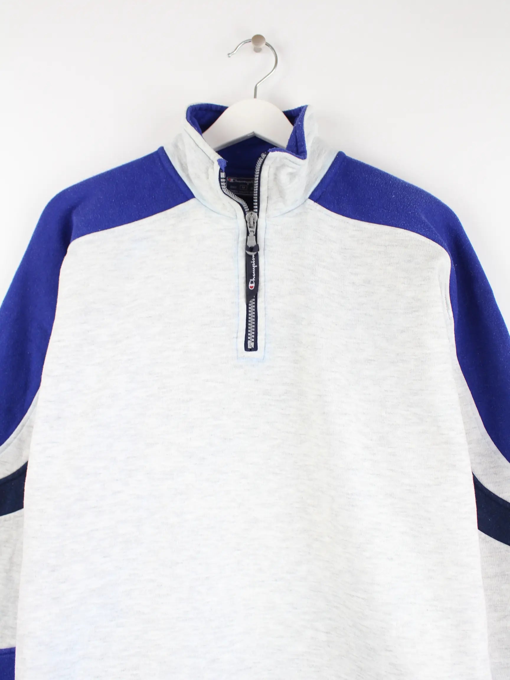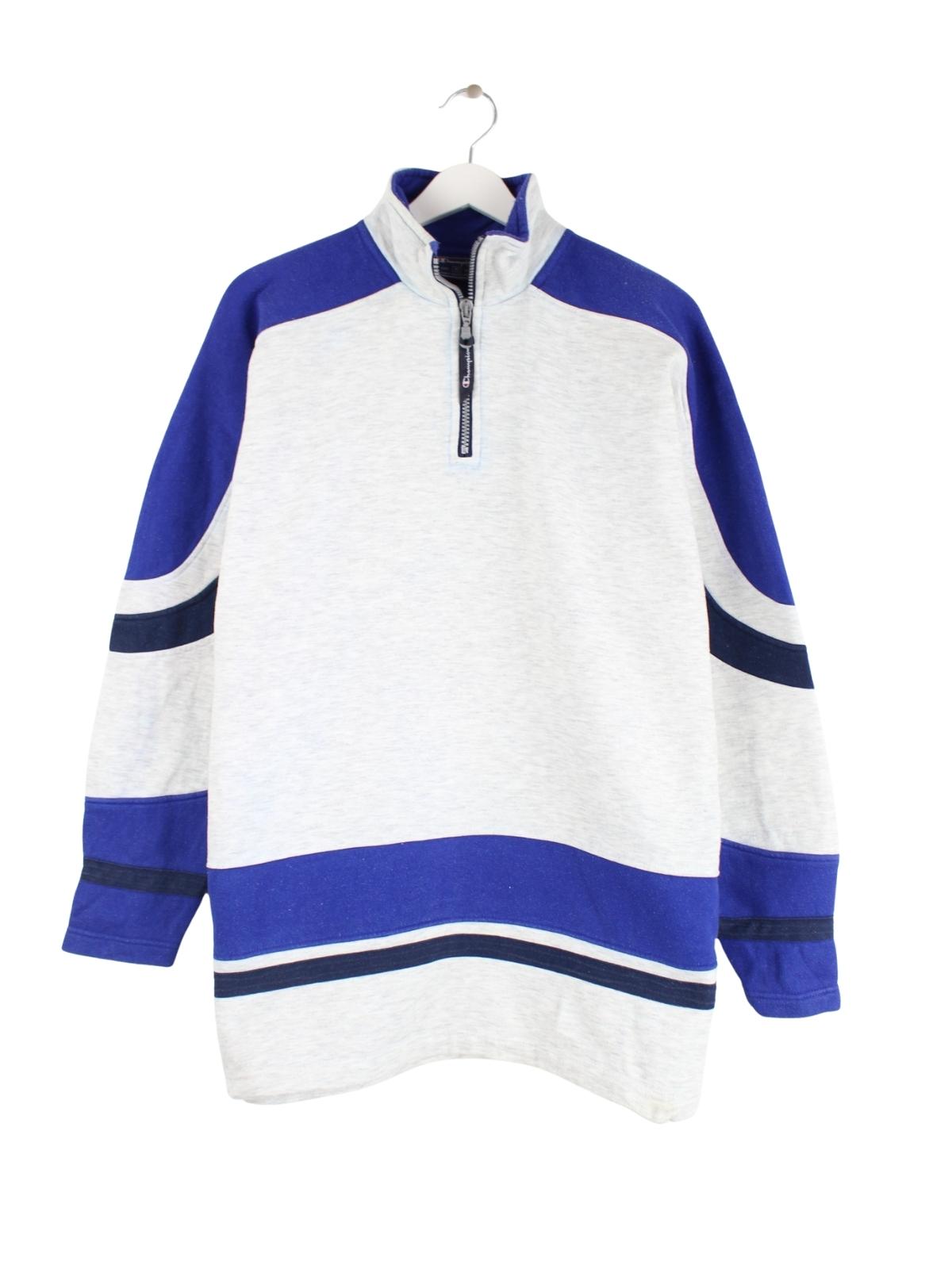 Grauer Sweater mit kurzem Reißverschluß von Champion in Größe L. Er ist aus einer Baumwollmischung gefertigt und in gutem Zustand zu haben.