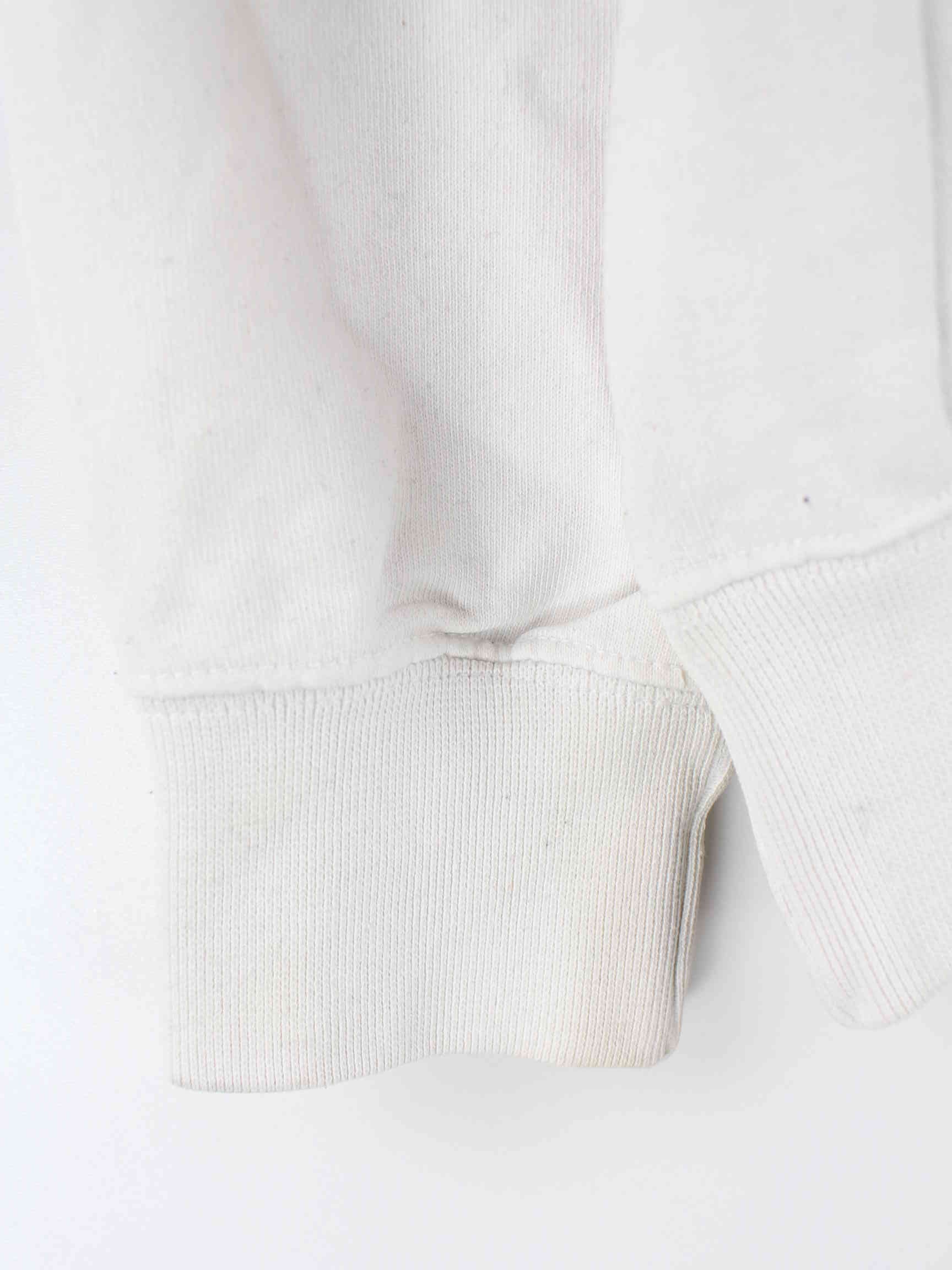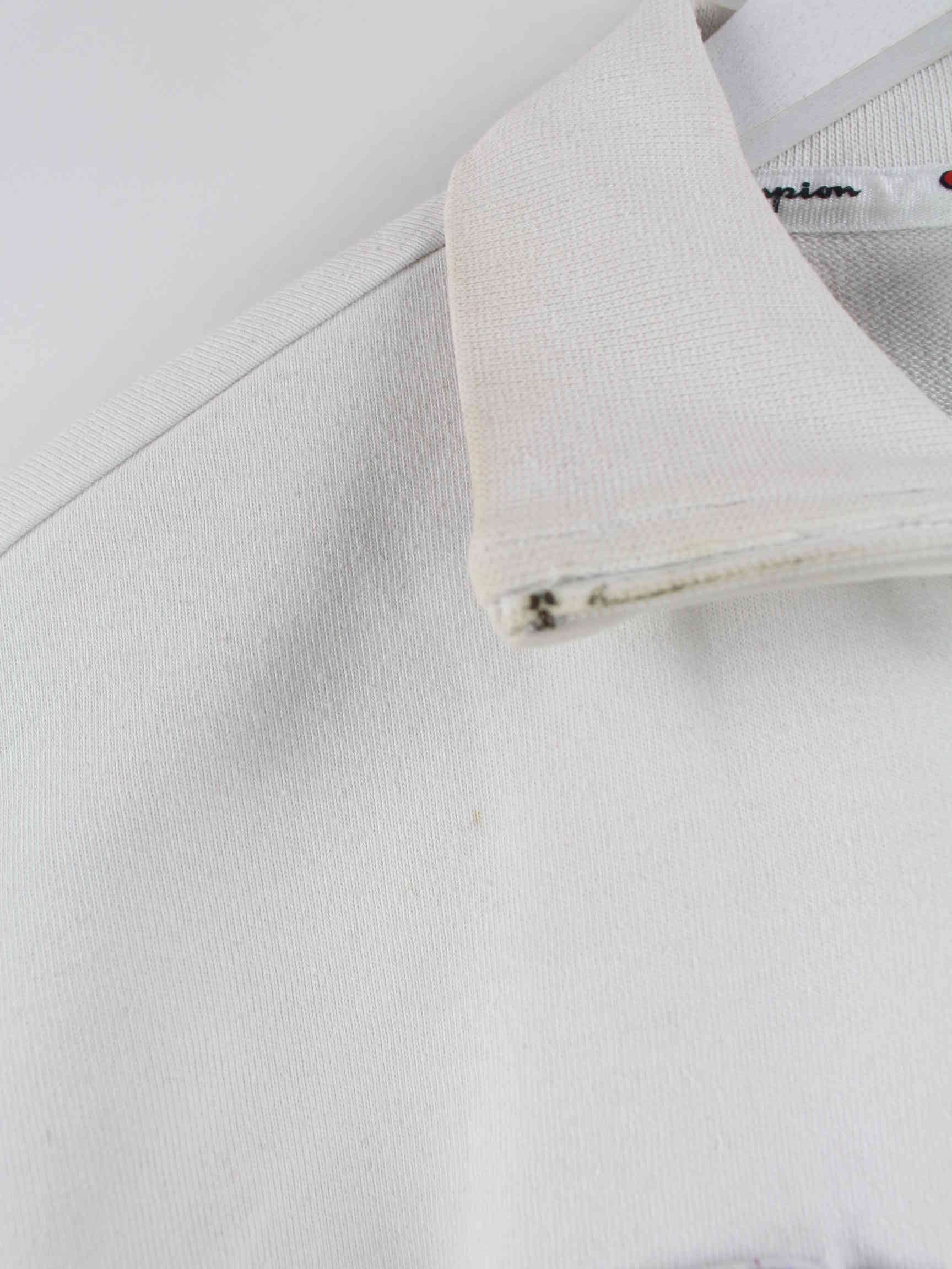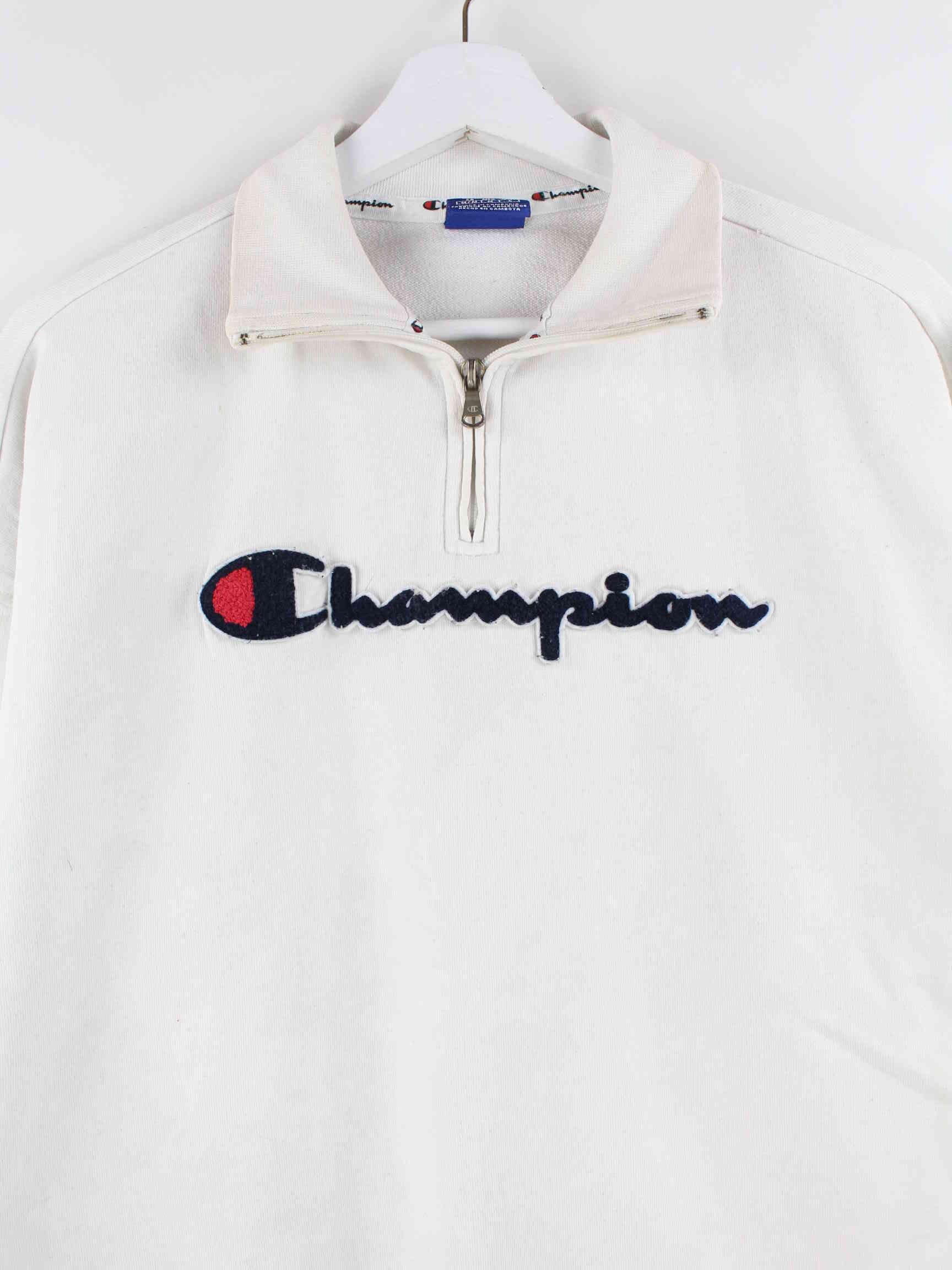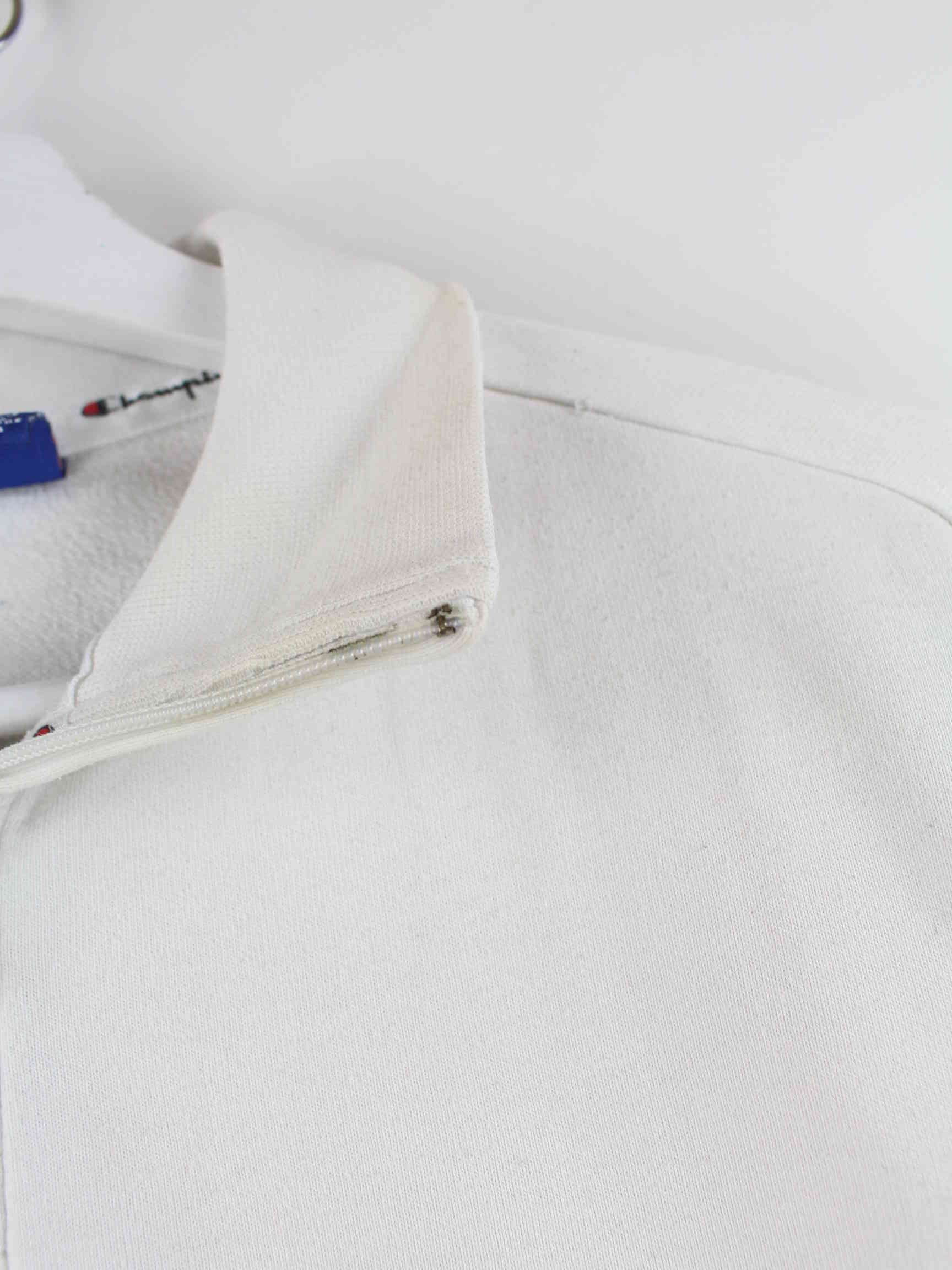 Weißer Sweater mit gestickten Mustern und halbem Reißverschluß von Champion in Größe M. Er ist aus einer Baumwollmischung hergestellt. Den Zustand würden wir als 'In Ordnung' bezeichnen (vergl. Bilder).