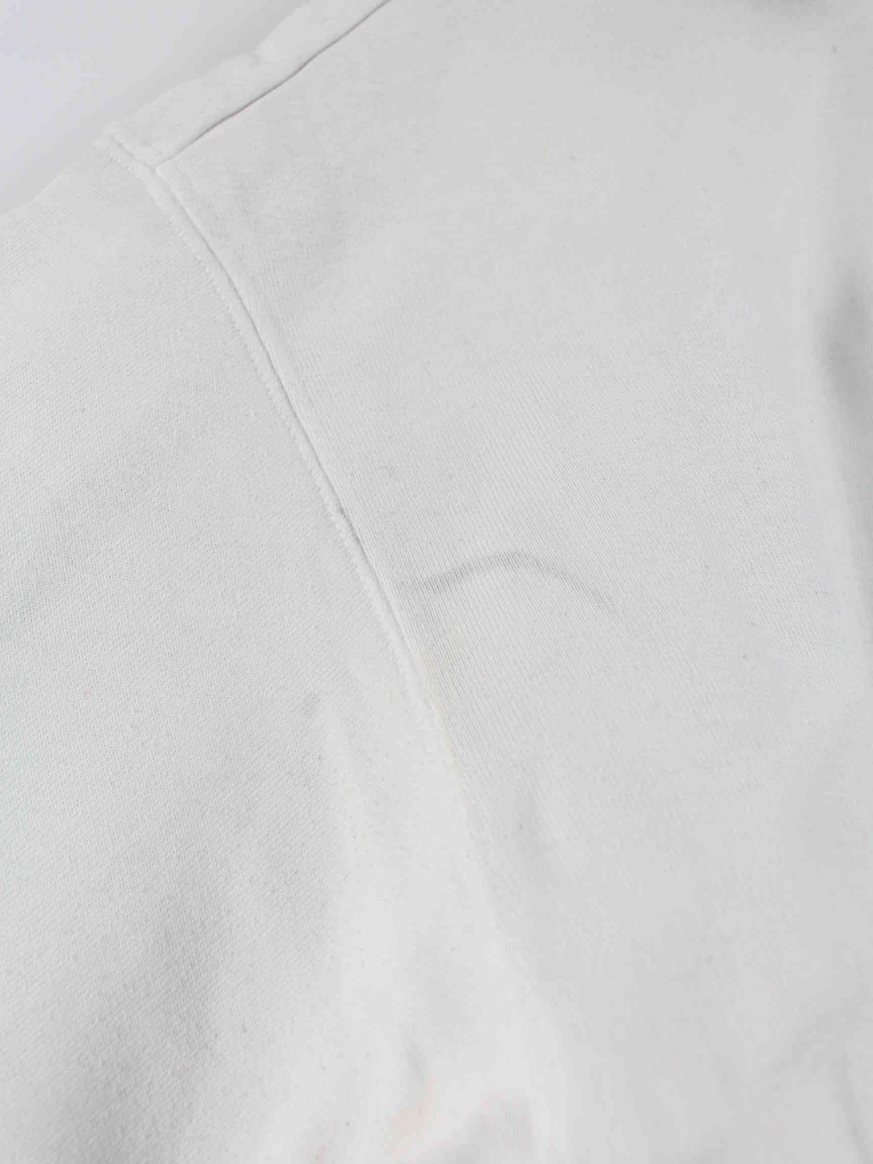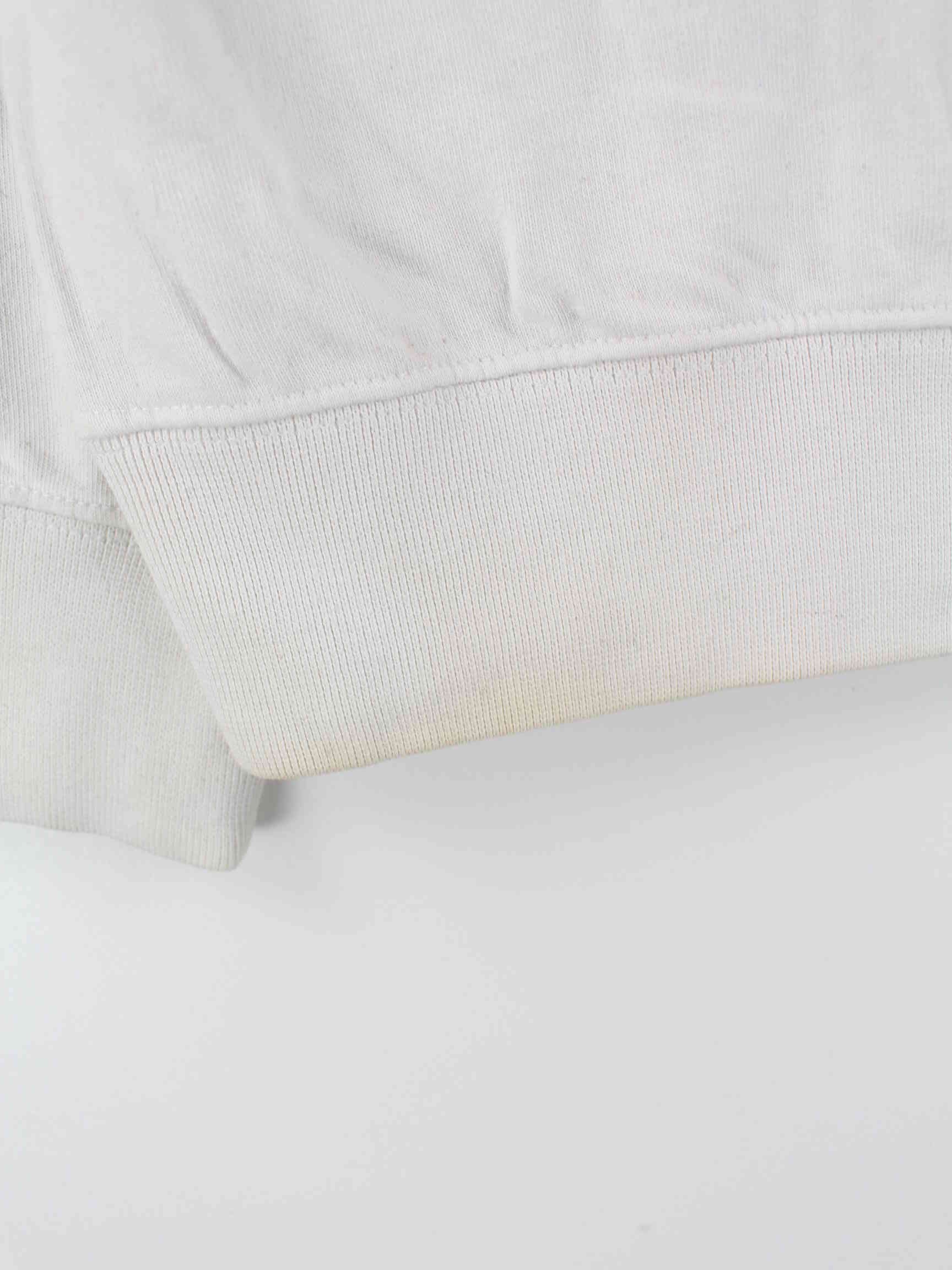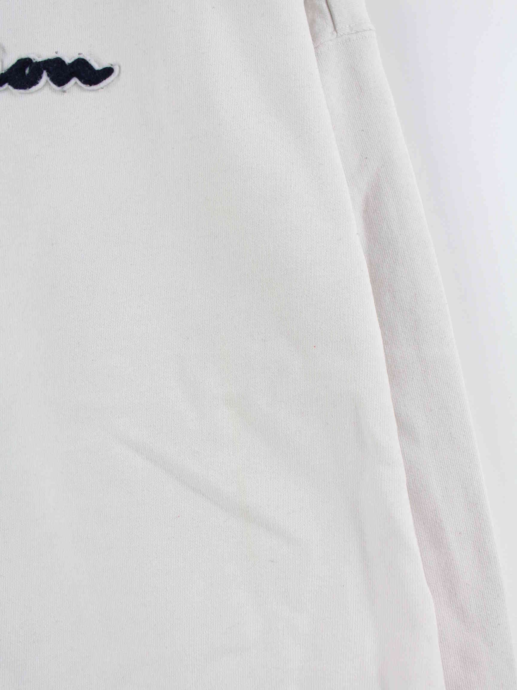 Weißer Sweater mit gestickten Mustern und halbem Reißverschluß von Champion in Größe M. Er ist aus einer Baumwollmischung hergestellt. Den Zustand würden wir als 'In Ordnung' bezeichnen (vergl. Bilder).