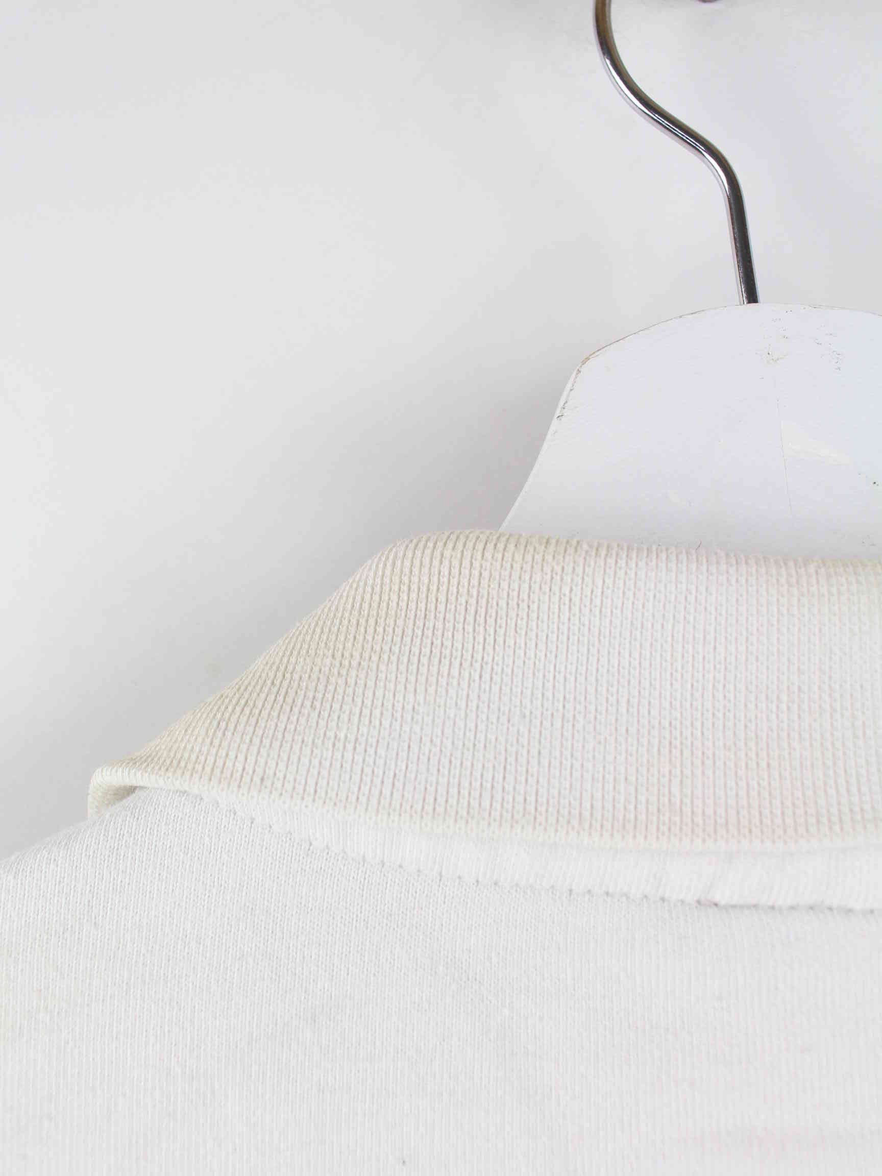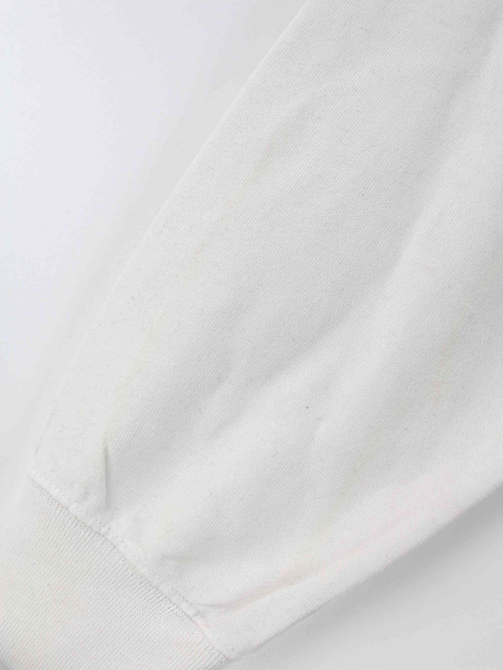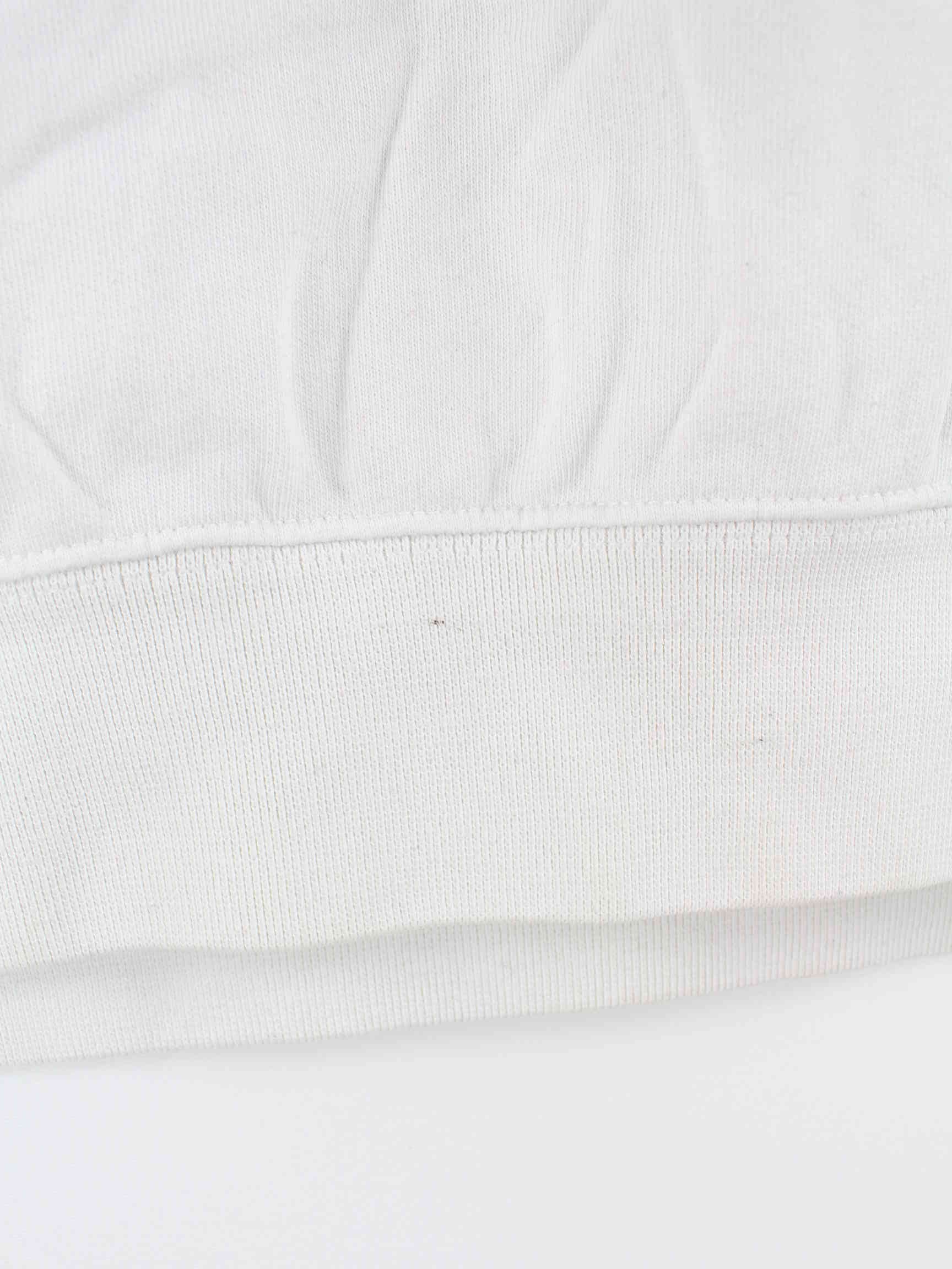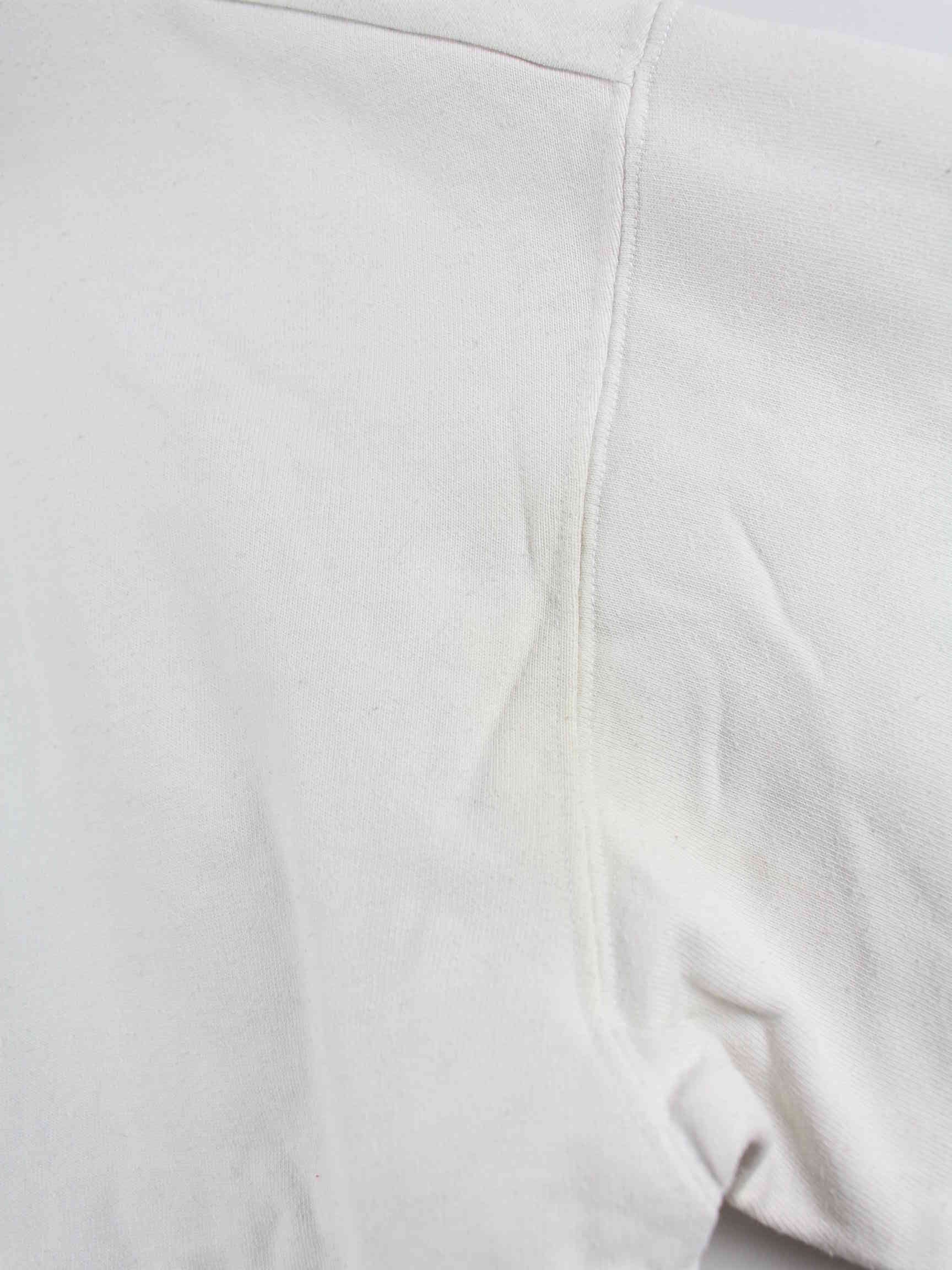 Weißer Sweater mit gestickten Mustern und halbem Reißverschluß von Champion in Größe M. Er ist aus einer Baumwollmischung hergestellt. Den Zustand würden wir als 'In Ordnung' bezeichnen (vergl. Bilder).