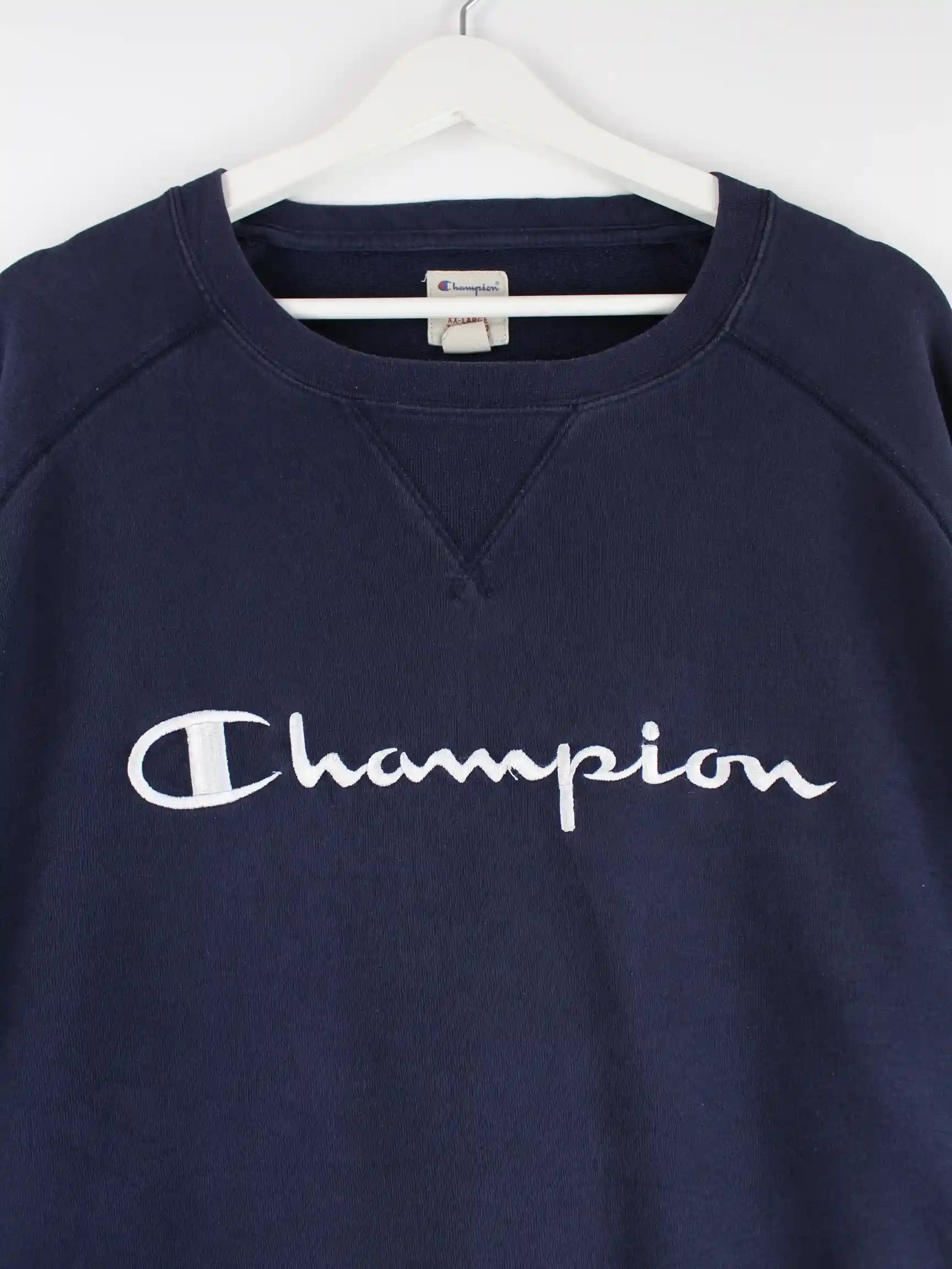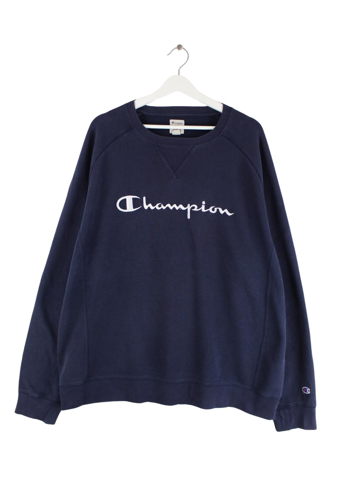Blauer Sweater der Marke Champion in Größe XXL. Er ist aus einer Baumwollmischung angefertigt. Den Zustand würden wir als 'In Ordnung' bezeichnen (vergl. Bilder).
