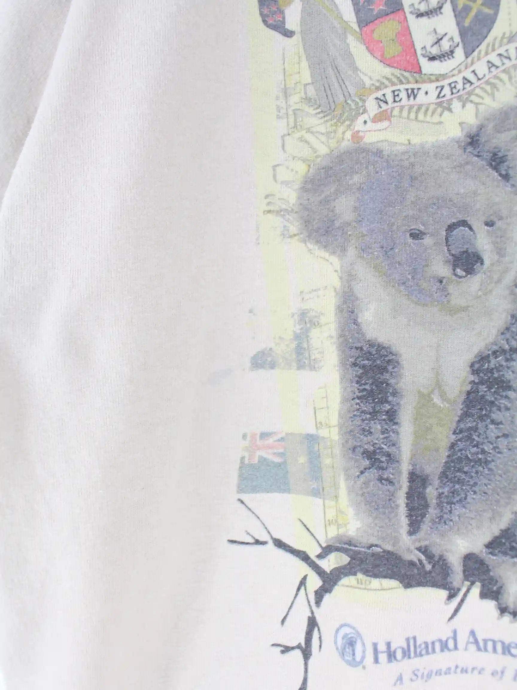 Beigefarbenes T-Shirt der Marke Gildan in Größe L. Es ist aus Baumwolle gemacht und in gutem Zustand auf Lager. Mit seltenem Outback Print.