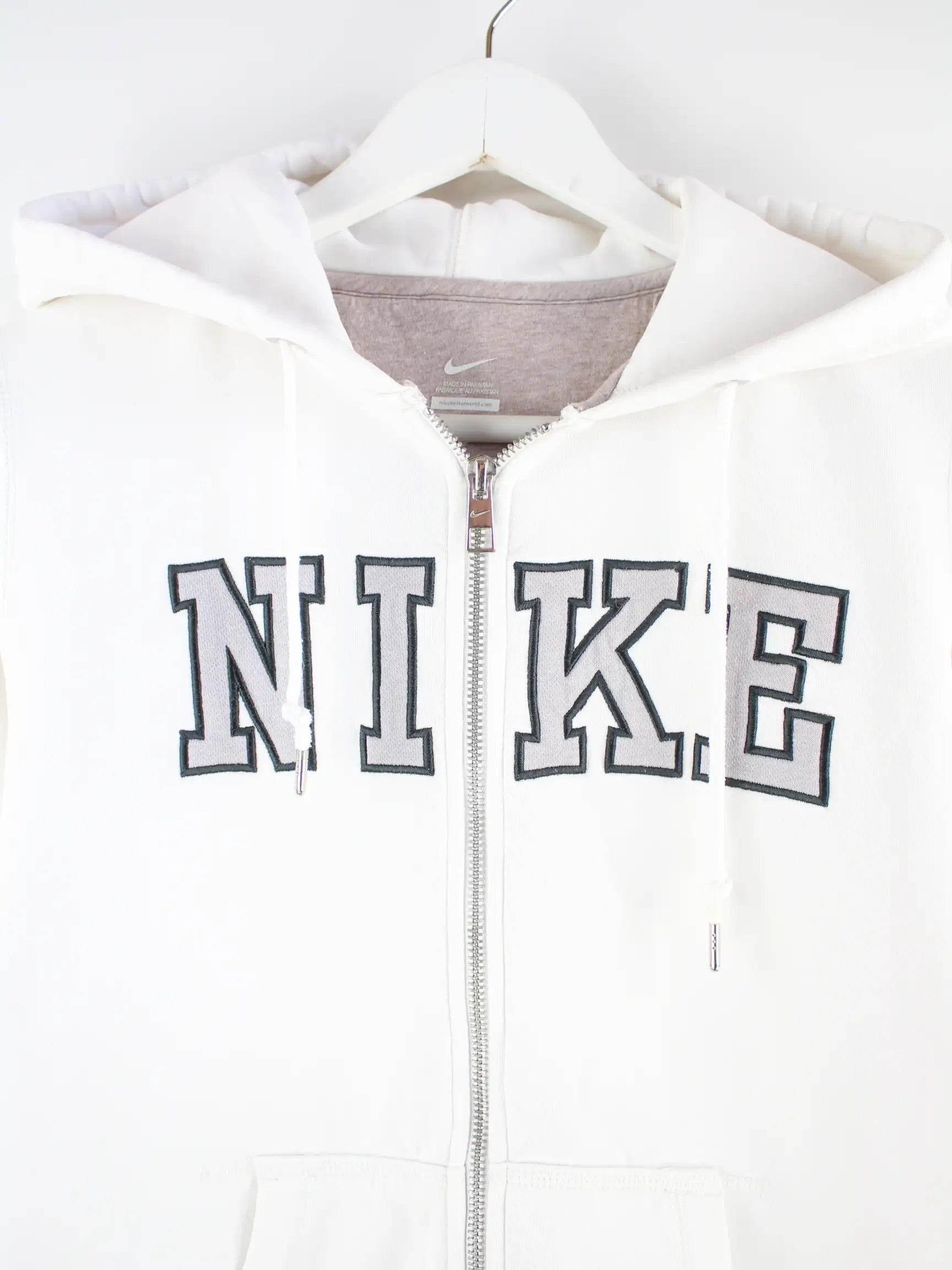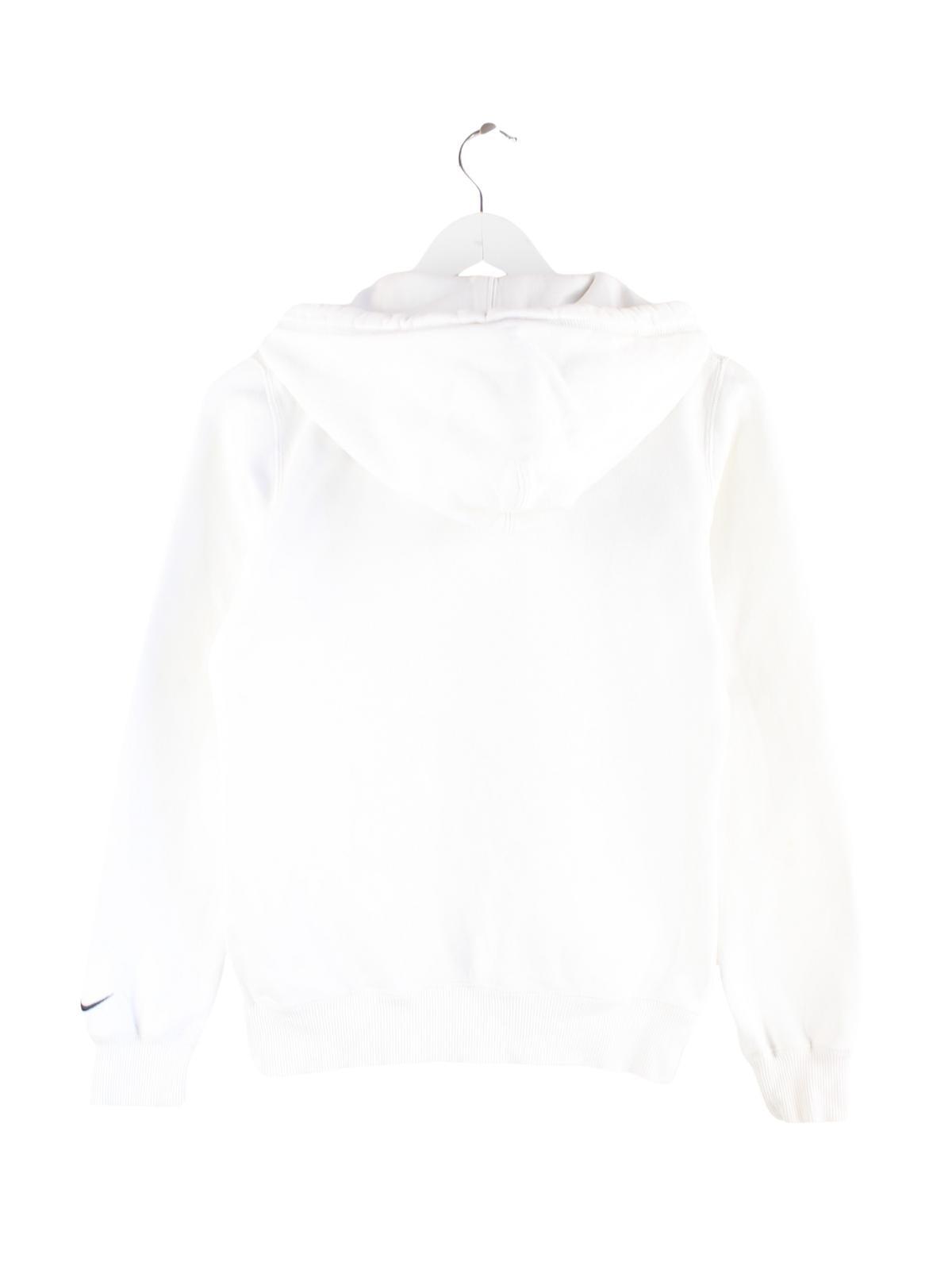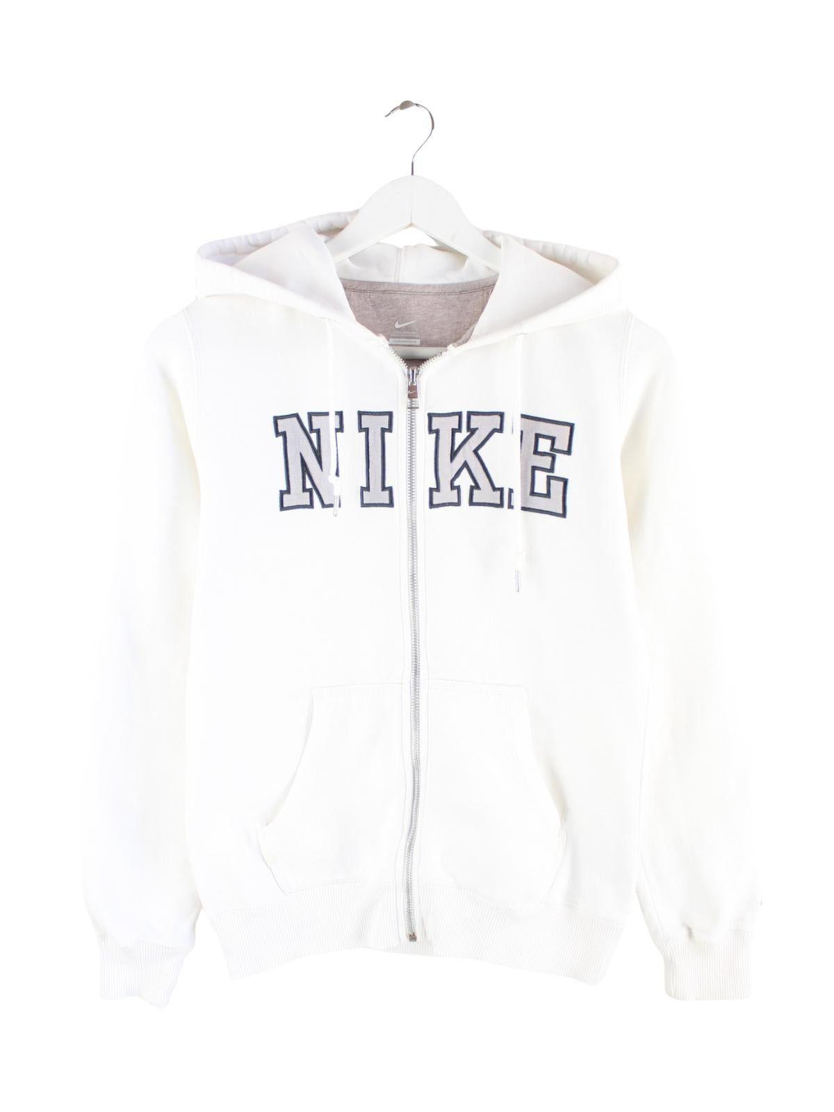 Weißer Hoodie mit durchgehendem Reißverschluß der Marke Nike in Größe S. Er ist aus einer Baumwollmischung gemacht. Den Zustand würden wir als 'In Ordnung' bezeichnen (vergl. Bilder).
