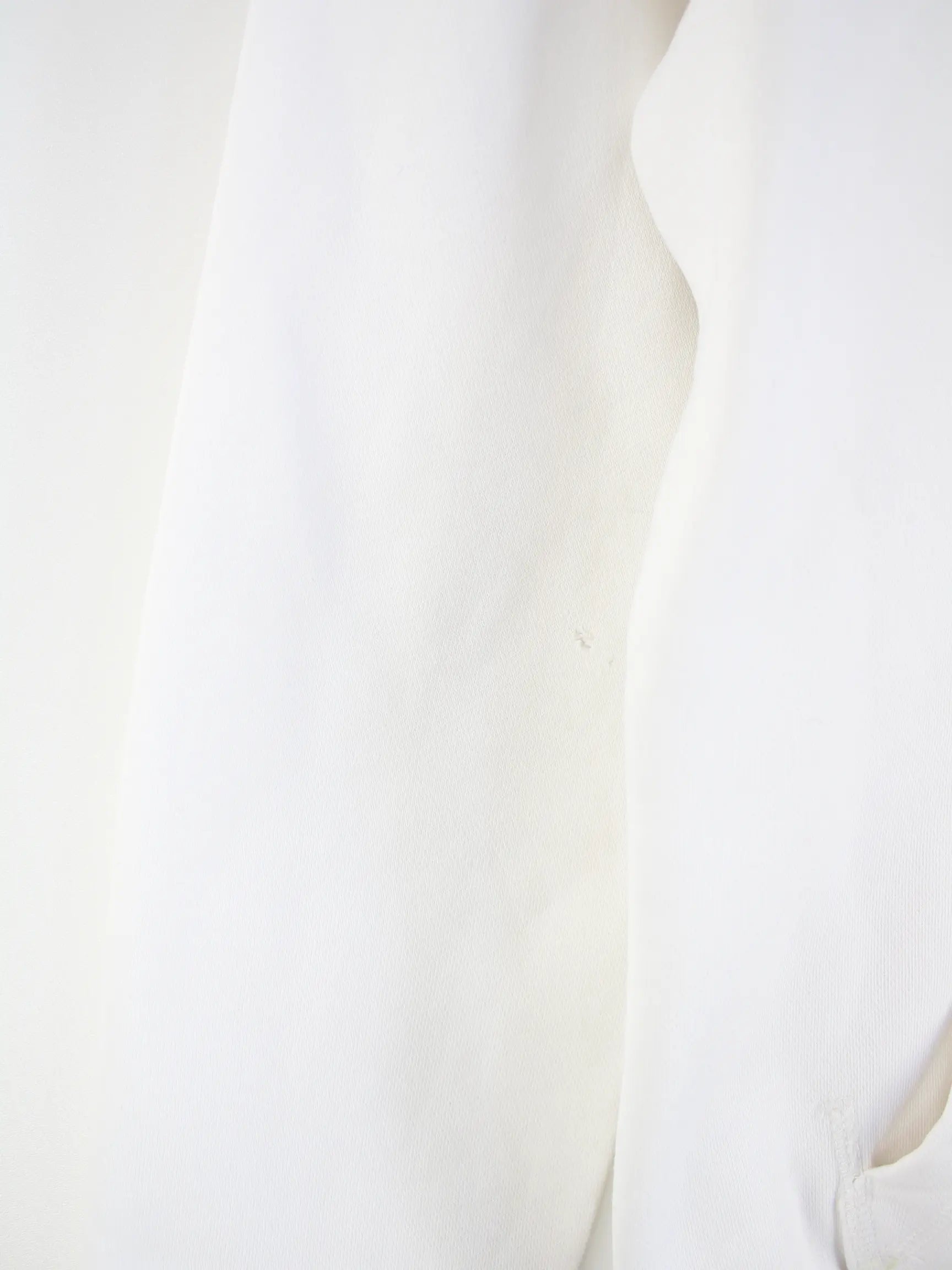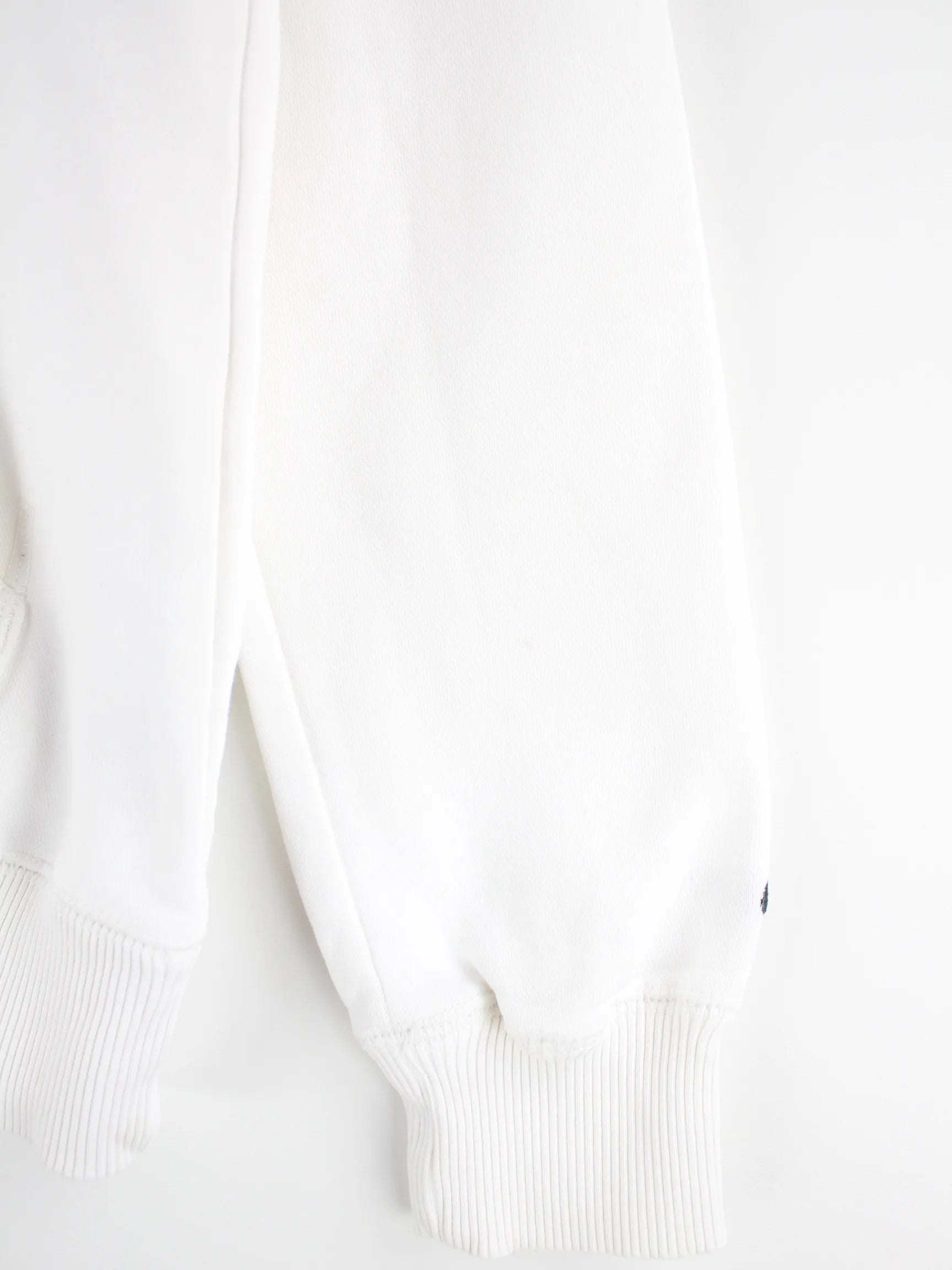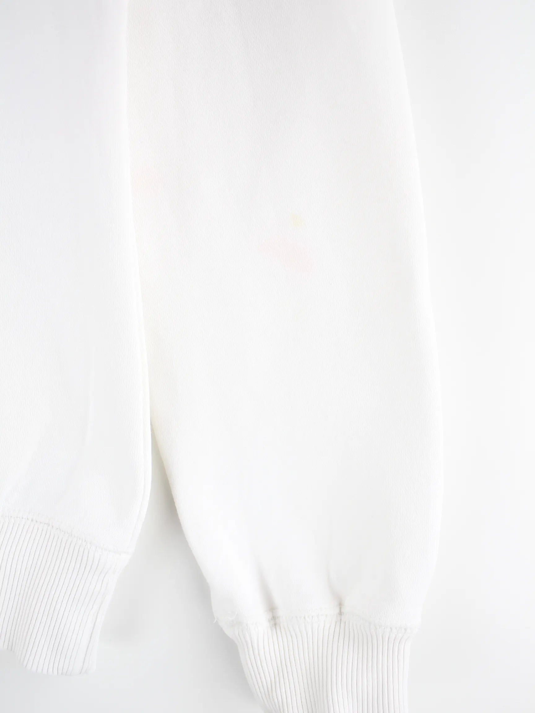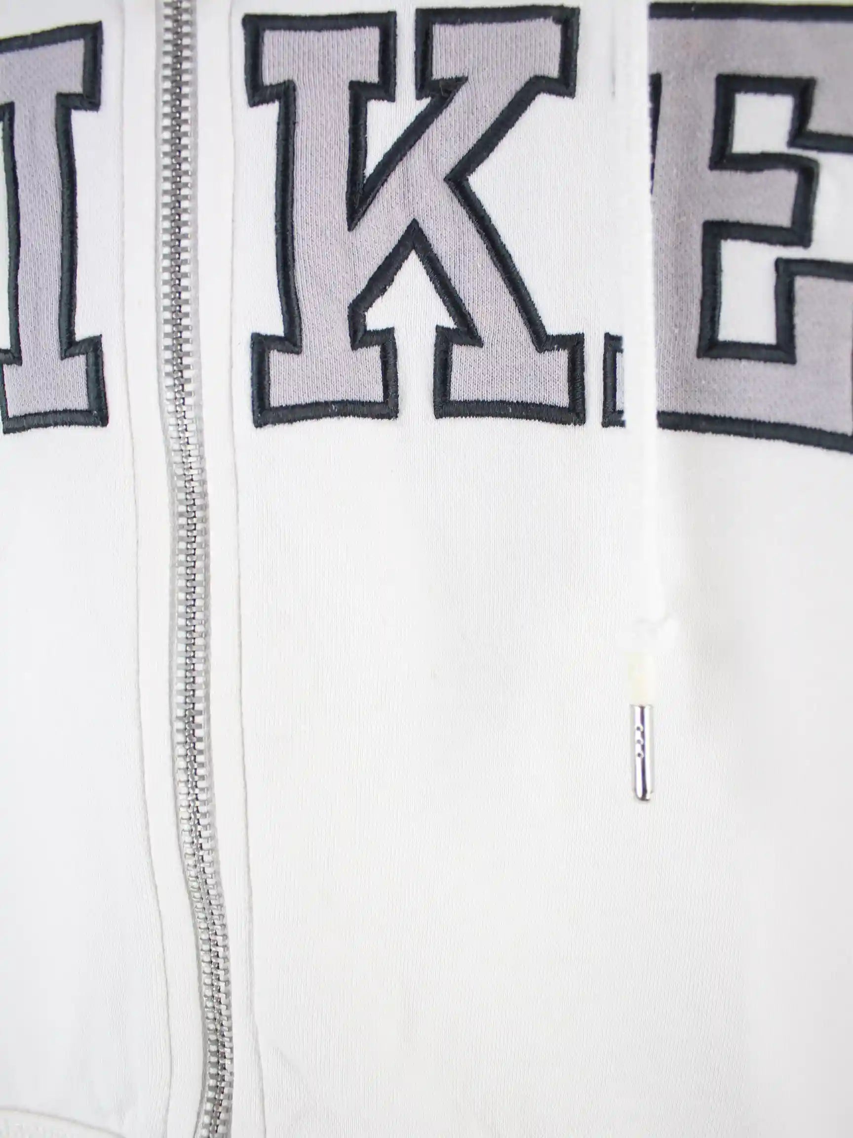 Weißer Hoodie mit durchgehendem Reißverschluß der Marke Nike in Größe S. Er ist aus einer Baumwollmischung gemacht. Den Zustand würden wir als 'In Ordnung' bezeichnen (vergl. Bilder).
