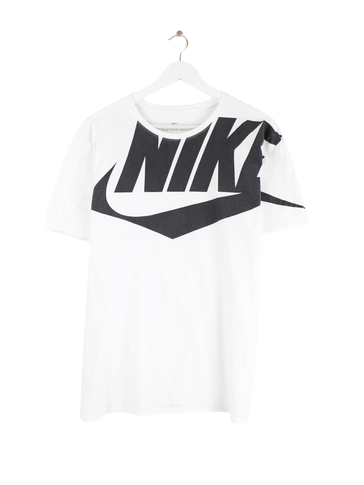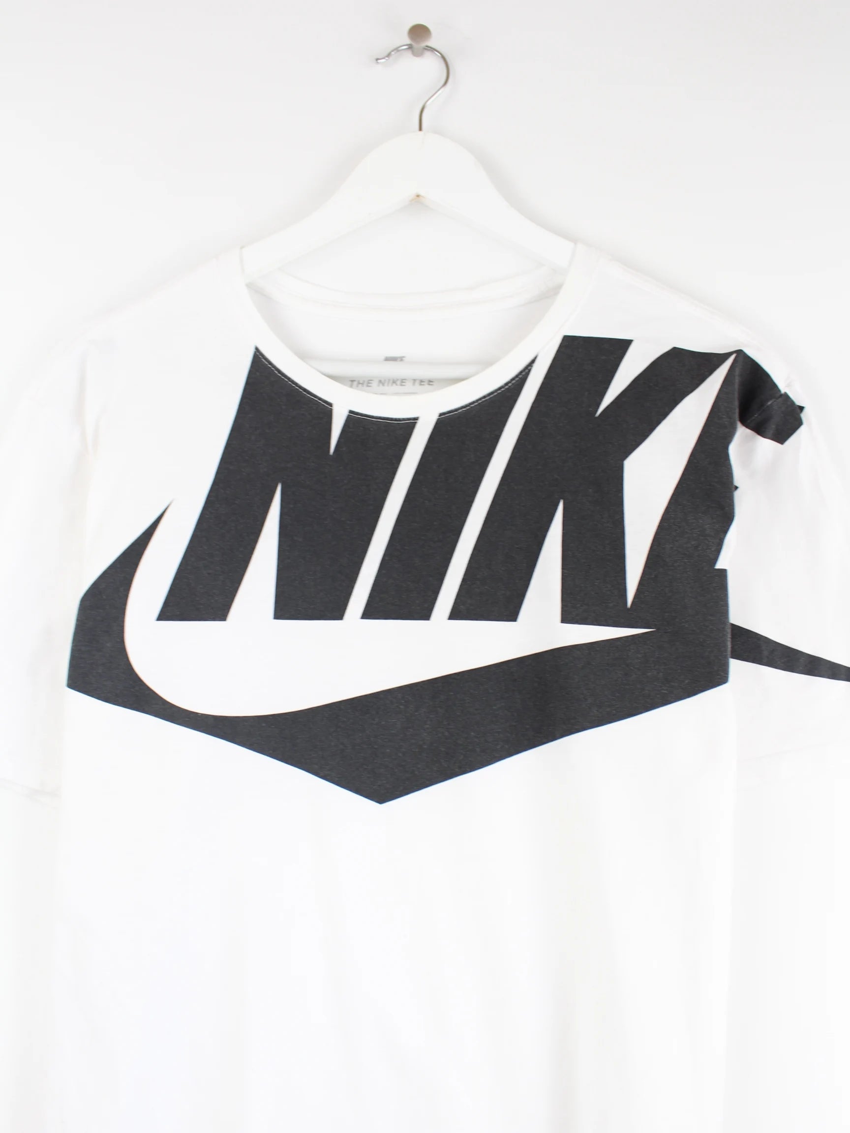 Weißes T-Shirt der Marke Nike in Größe L. Es ist aus Baumwolle angefertigt und in sehr gutem Zustand bei uns zu bekommen. Mit seltenem Logo Print.