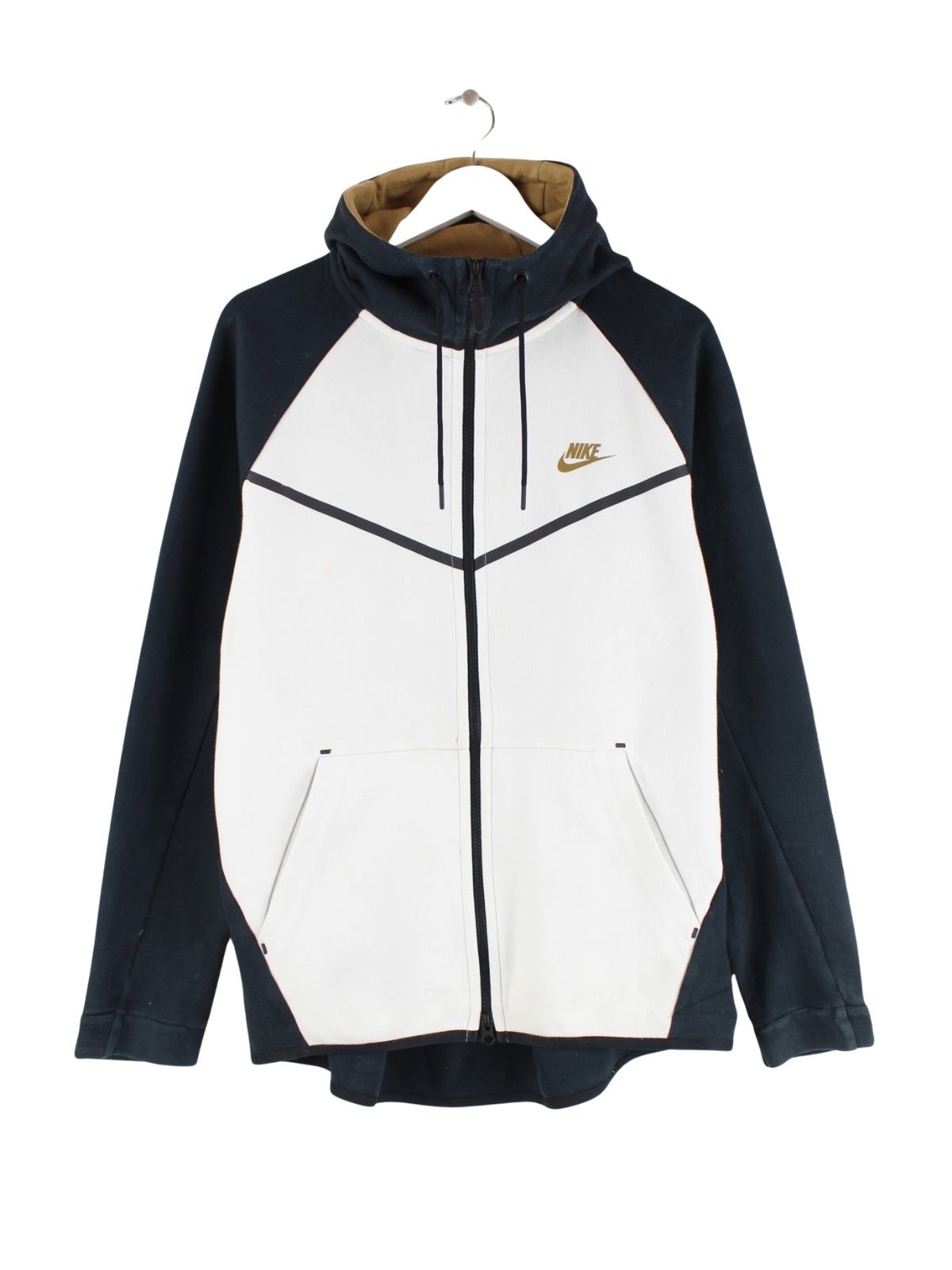 Weißer Hoodie mit Reißverschluß der Marke Nike in Größe L. Er ist aus einer Baumwollmischung gemacht. Den Zustand würden wir als 'In Ordnung' bezeichnen (vergl. Bilder).