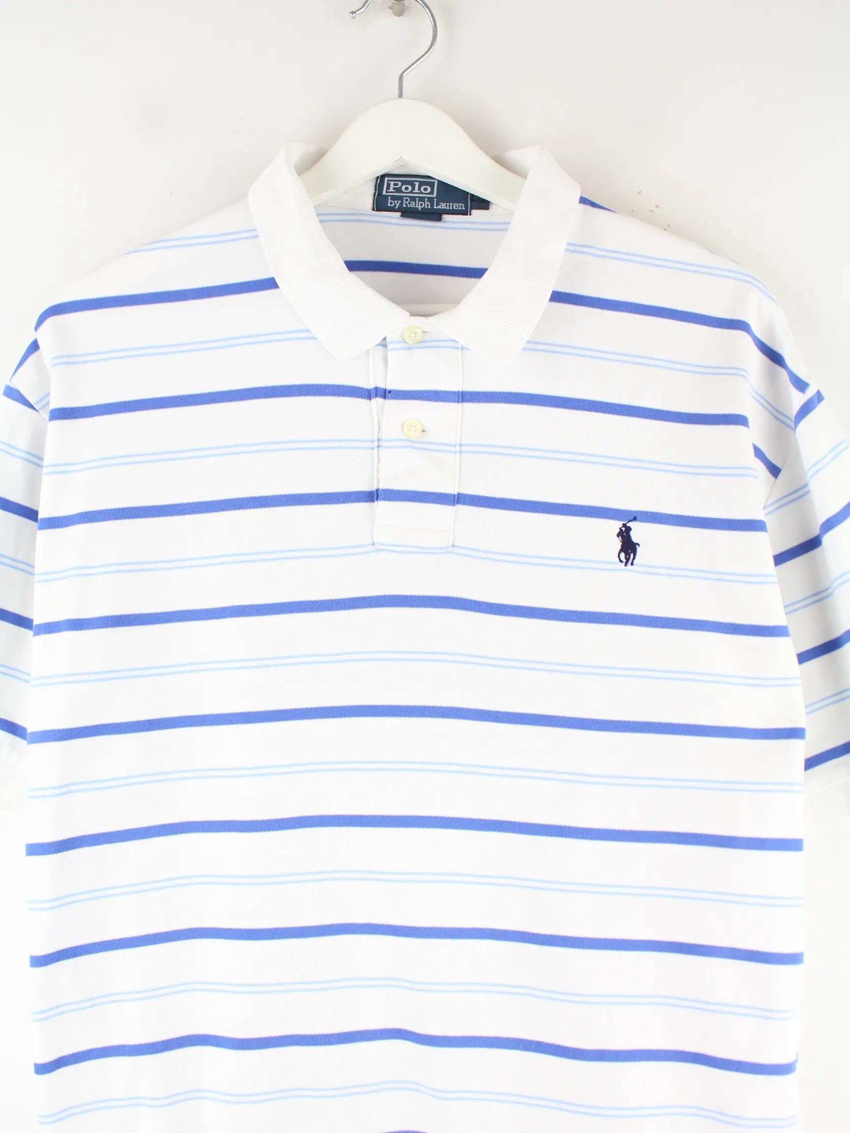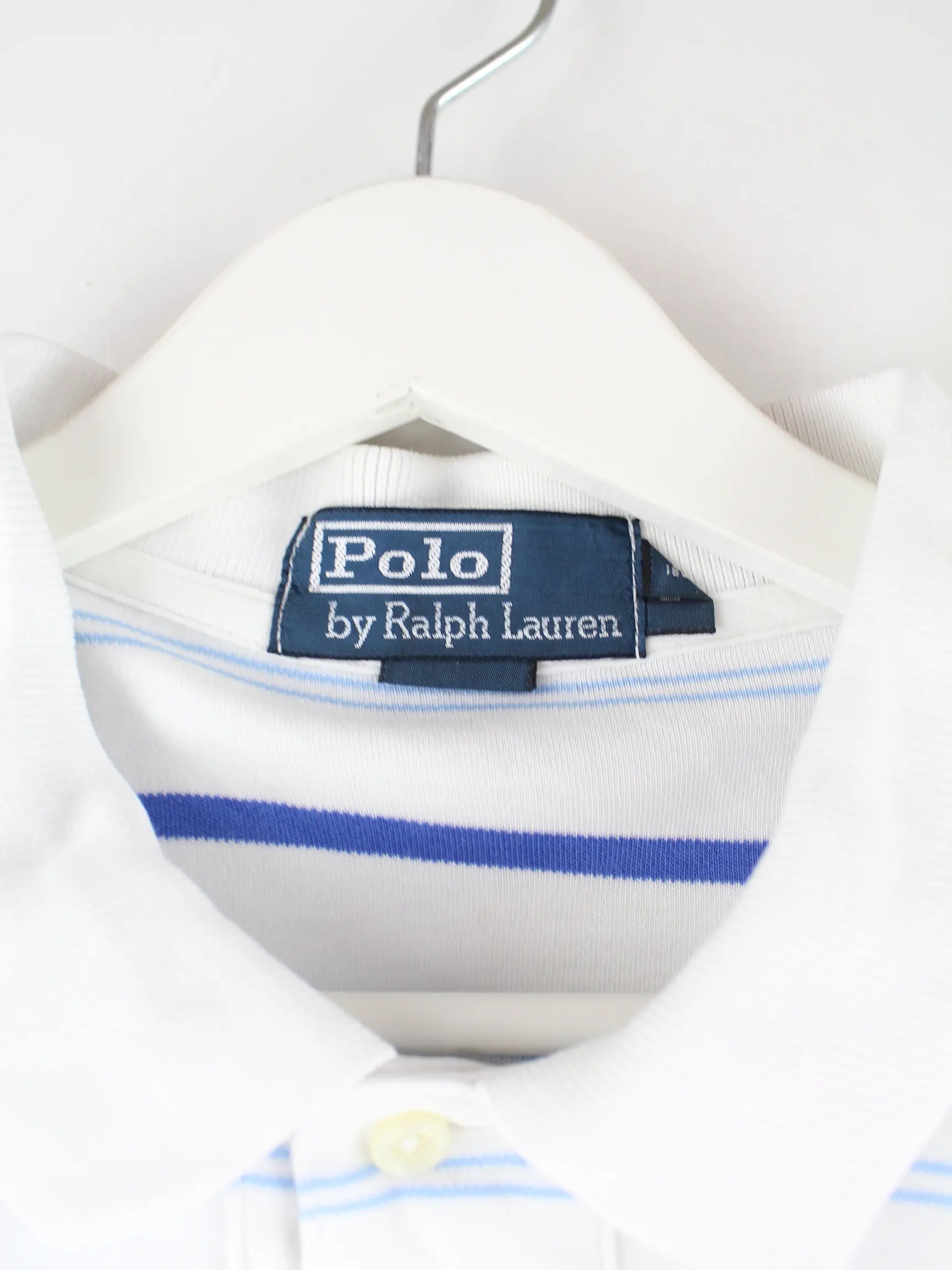 Weißes Poloshirt des Labels Ralph Lauren in Größe L. Es ist aus Baumwolle angefertigt und in gutem Zustand vorrätig.