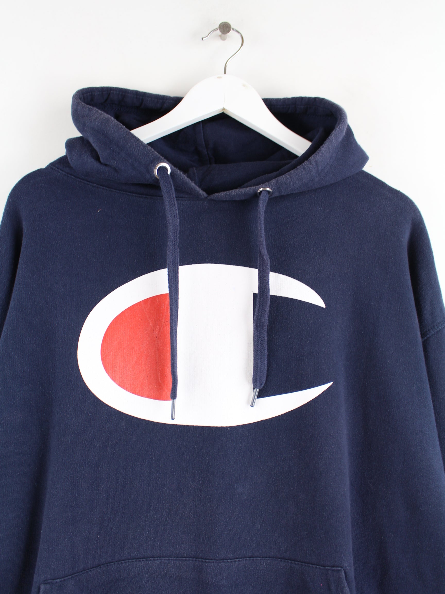 Blauer Hoodie der Marke Champion in Größe XXL. Er ist aus einer Baumwollmischung. Den Zustand würden wir als 'In Ordnung' bezeichnen (vergl. Bilder).