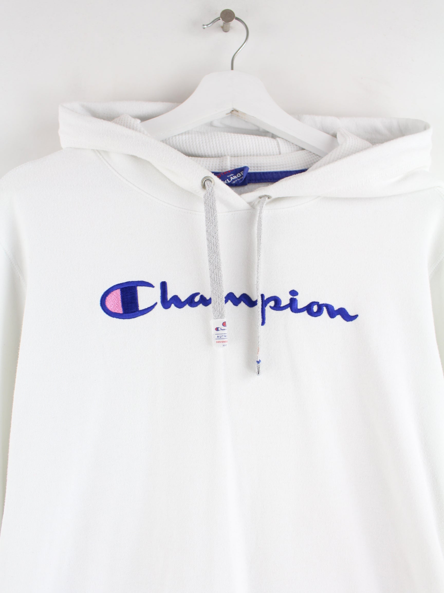 Weißer Hoodie mit Stick des Labels Champion in Größe XXL. Er ist aus einer Baumwollmischung angefertigt und in gutem Zustand in Stock.